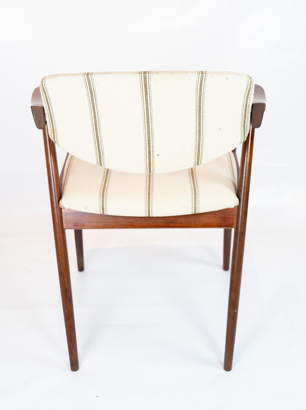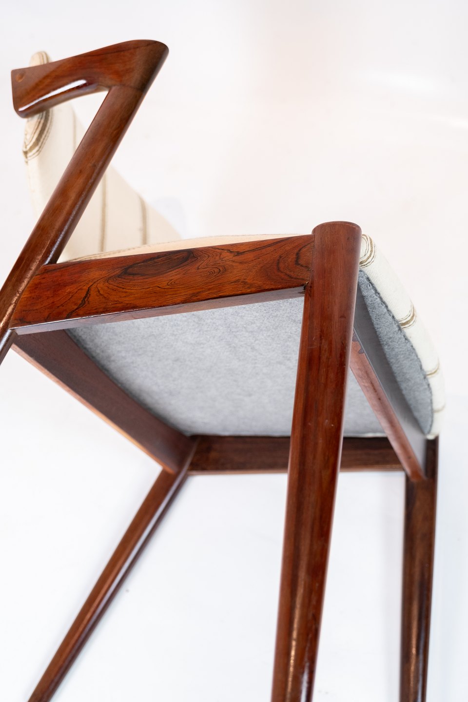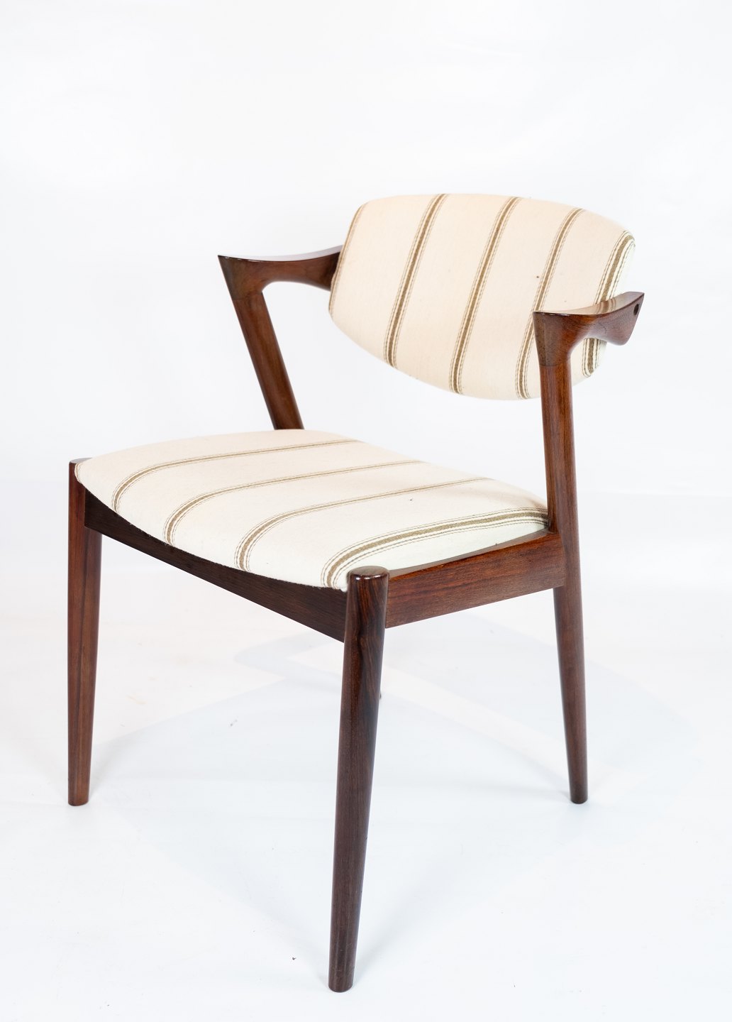 SoldA set of 6 dining chairs, model 42, designed by Kai Kristiansen and manufactured by Schou Andersen in the 1960s. The chairs are of rosewood and upholstered in light wool fabric.