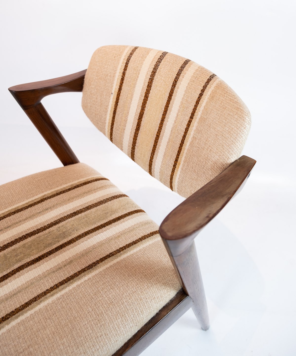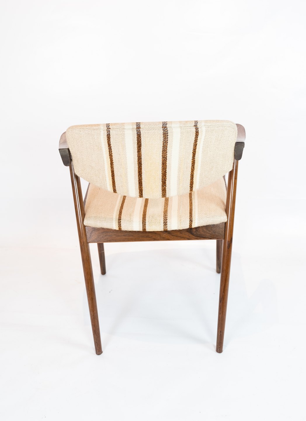SoldA set of 4 dining chairs, model 42, designed by Kai Kristiansen and manufactured by Schou Andersen in the 1960s. The chairs are of rosewood and upholstered in light striped wool fabric.