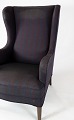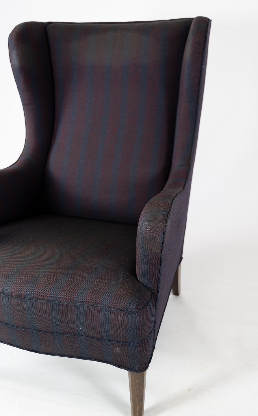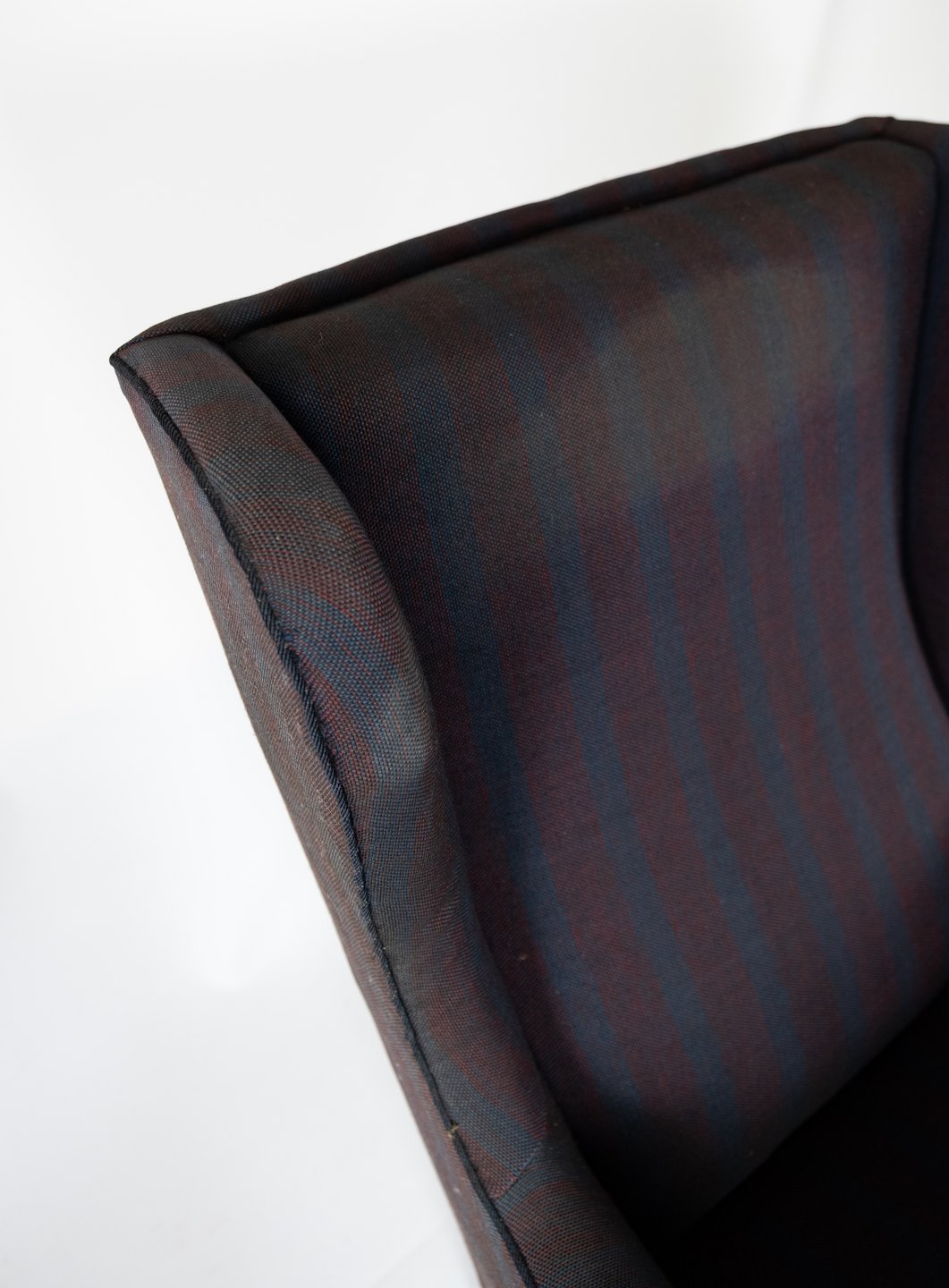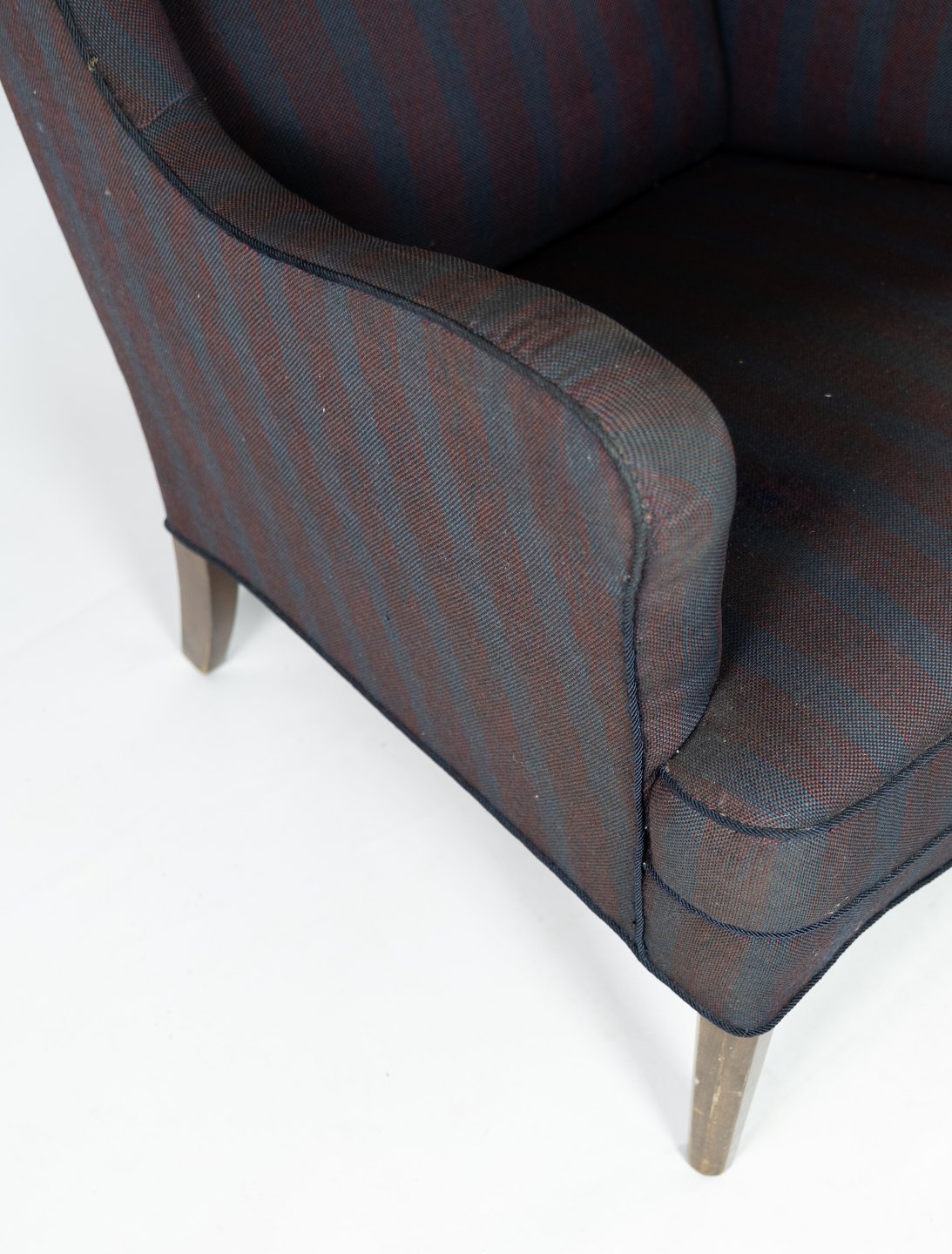 Høj lænestol med mørkt stribet stof, i flot brugt stand fra 1940erne.