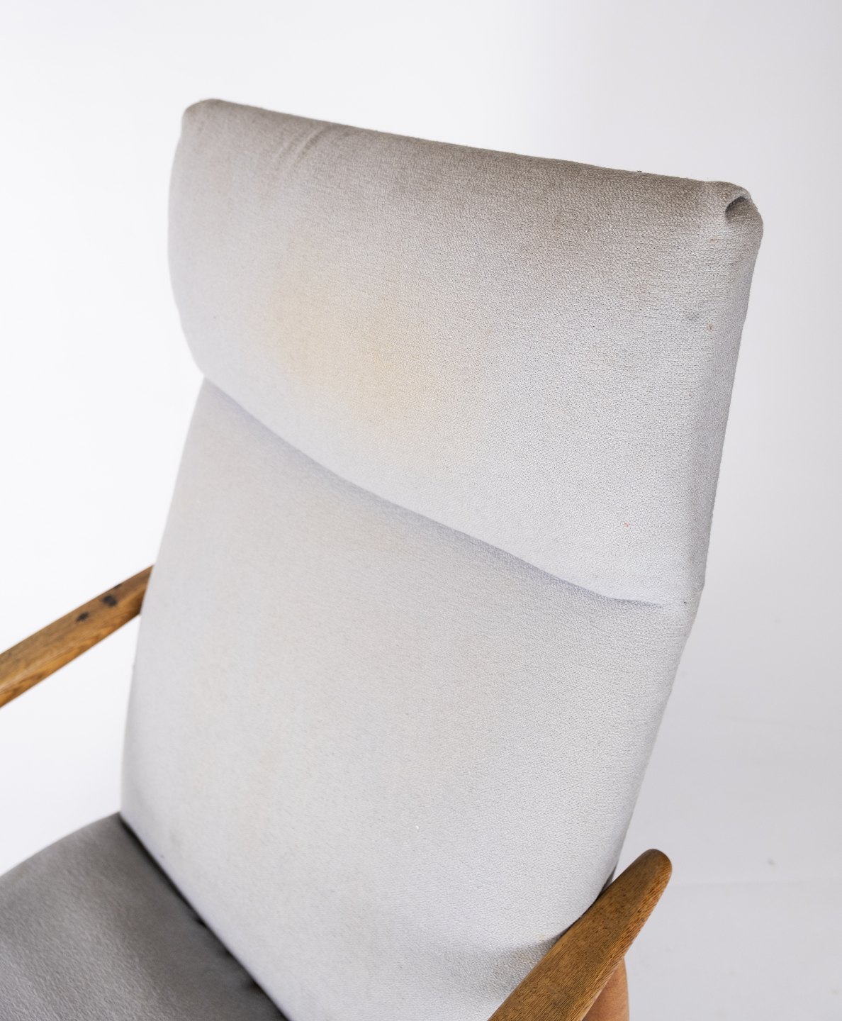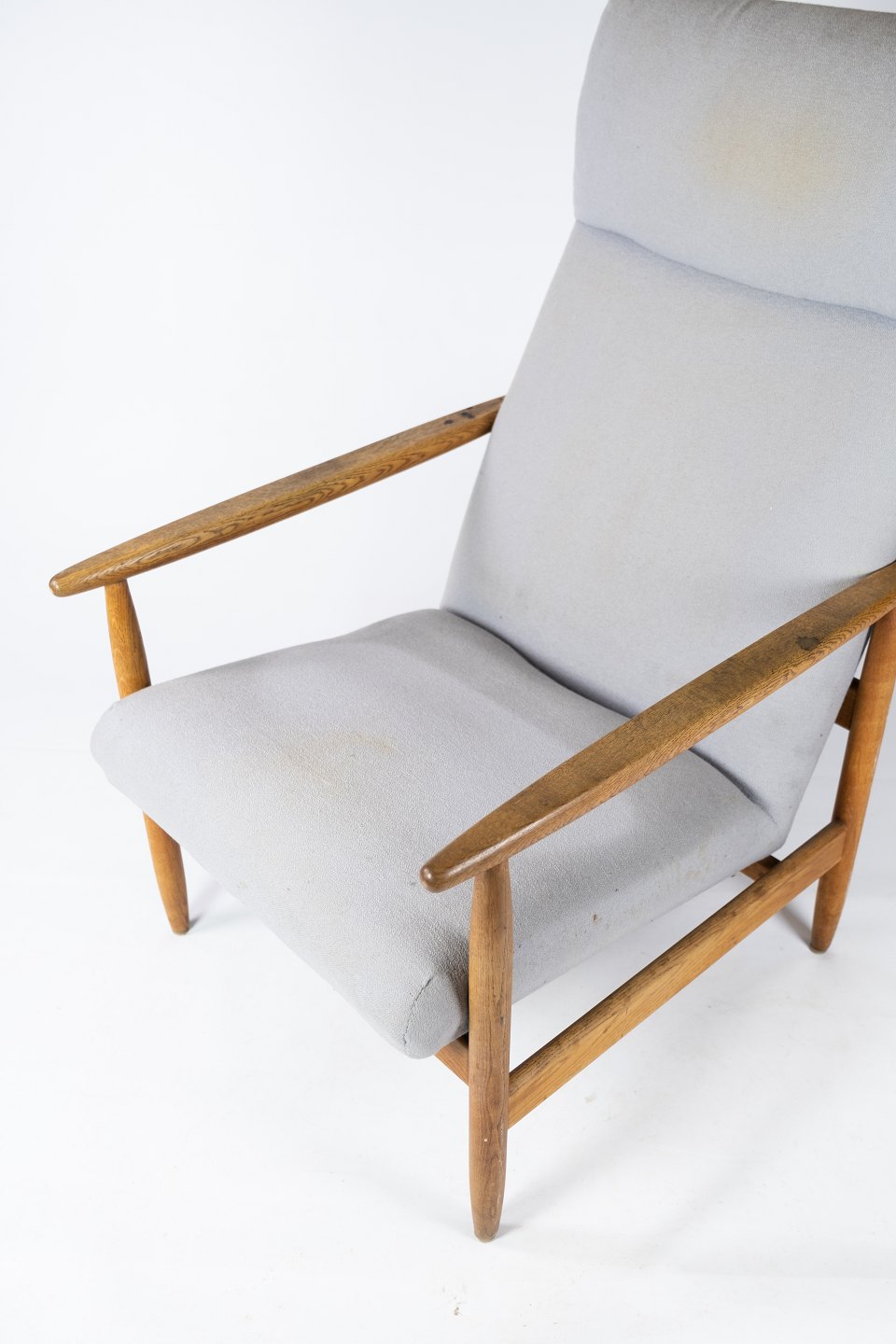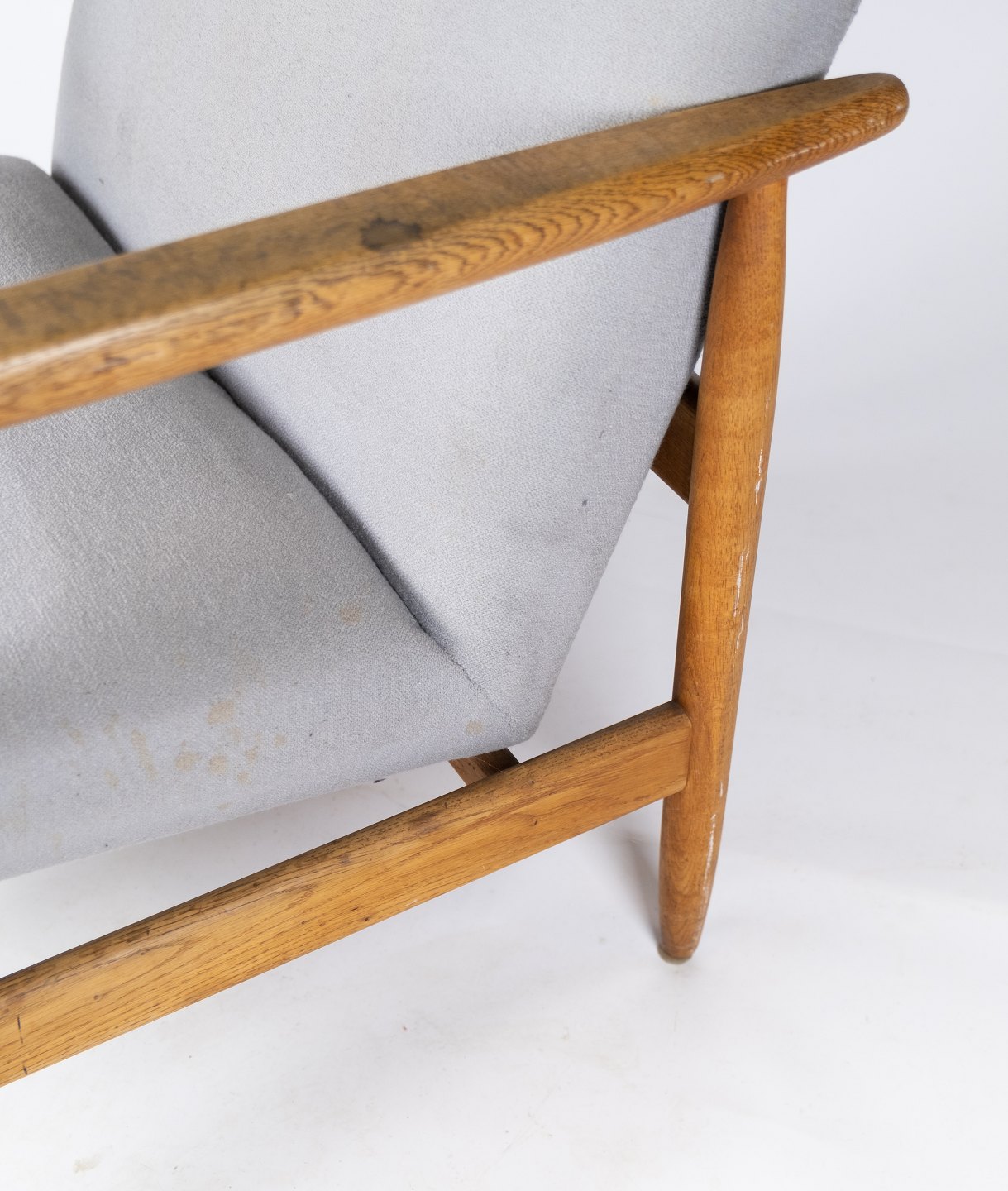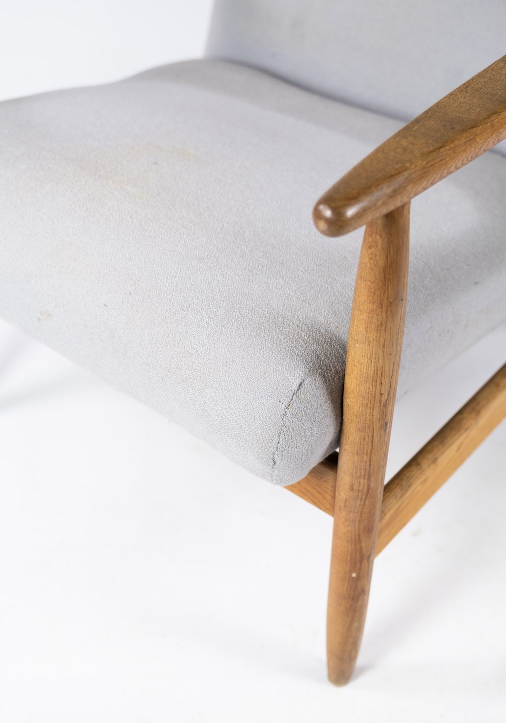 SoldEasy chair, model J65 in light wood and upholstered with grey wool fabric designed by Ejvind A Johansson for FDB.