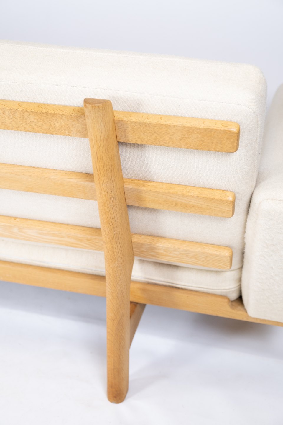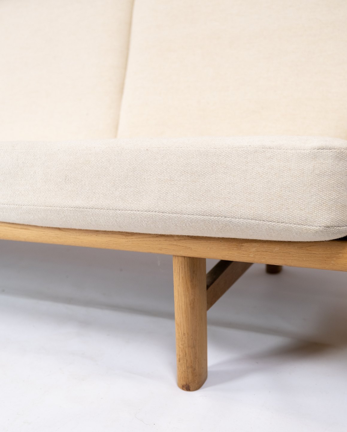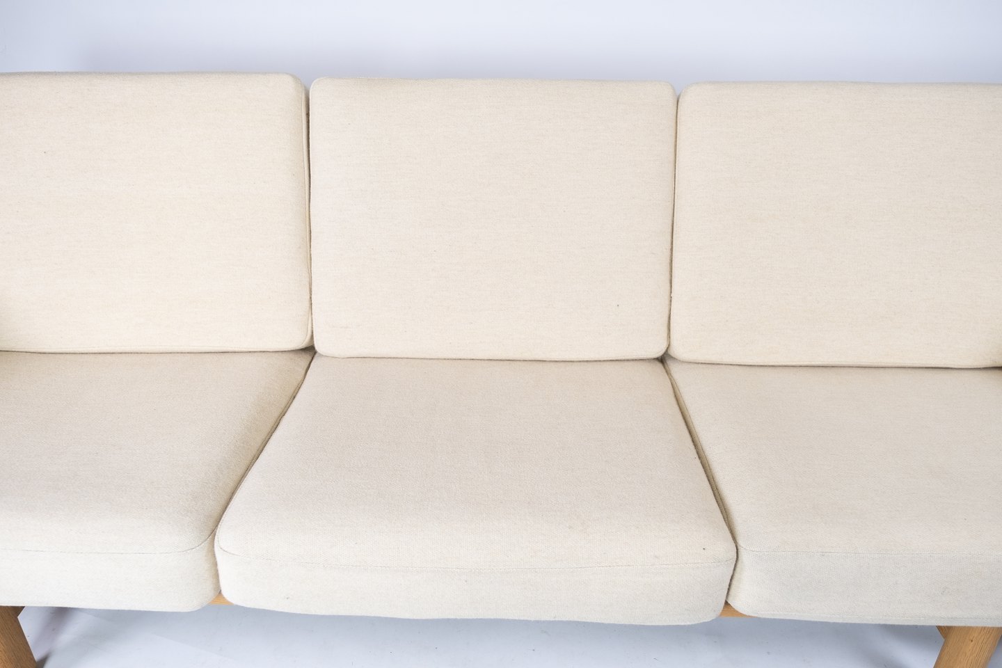 Three seater sofa, model GE-236/3, designed by Hans J. Wegner and manufactured by Getama in the 1960s. The sofa is upholstered with light wool fabric and of oak.