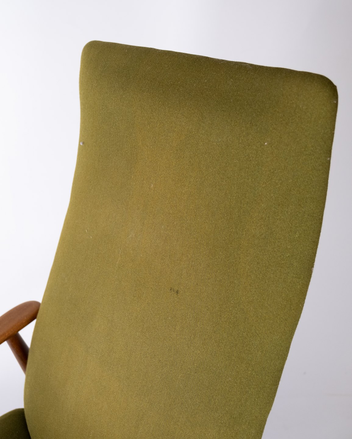 This Easy Chair, designed by Alf Svensson and manufactured by Fritz Hansen in the 1960s, is an example of timeless elegance and comfort. The chair is constructed in teak wood and upholstered with green fabric, which gives it a beautiful and inviting appearance.