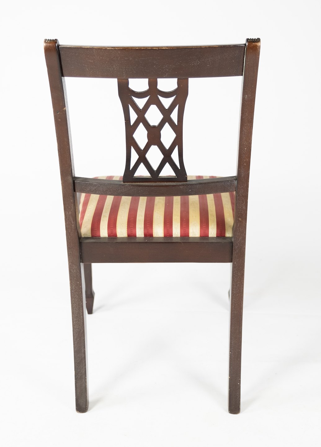 A pair of dining room chairs of mahogany and upholstered red fabric from the 1960s. The chairs are in great vintage condition.
