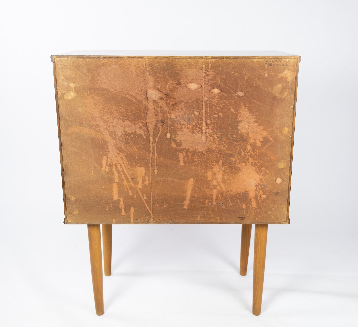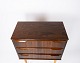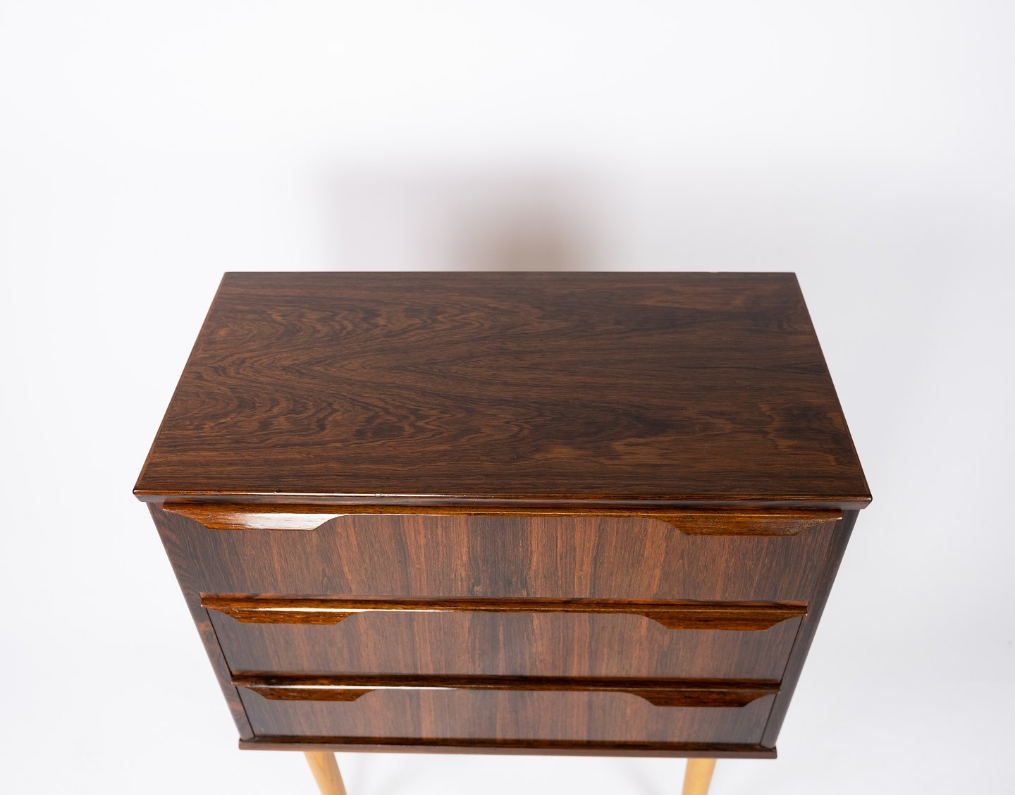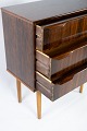 Denne lille kommode i palisander, designet af danske håndværkere i 1960'erne, er et smukt eksempel på skandinavisk møbeldesign fra denne æra. Palisandertræet giver kommoden en varm og dyb farve samt en karakteristisk mønsterstruktur, der tilføjer en følelse af elegance og luksus til ethvert rum.