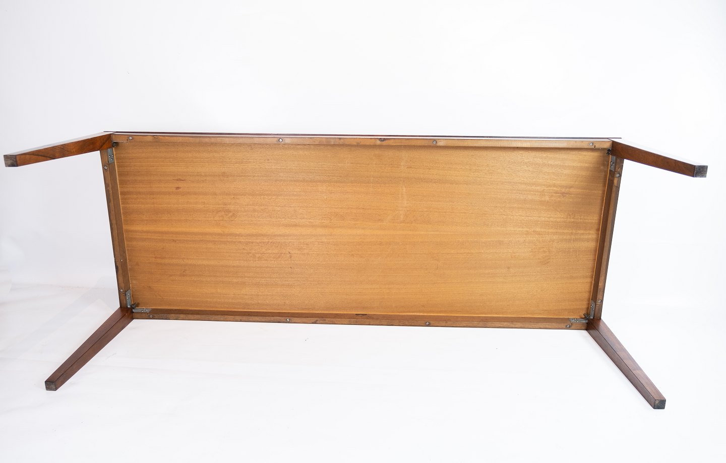 Sofabord i palisander dekoreret med metalkant af dansk design fra 1960erne. Bordet er i flot brugt stand.