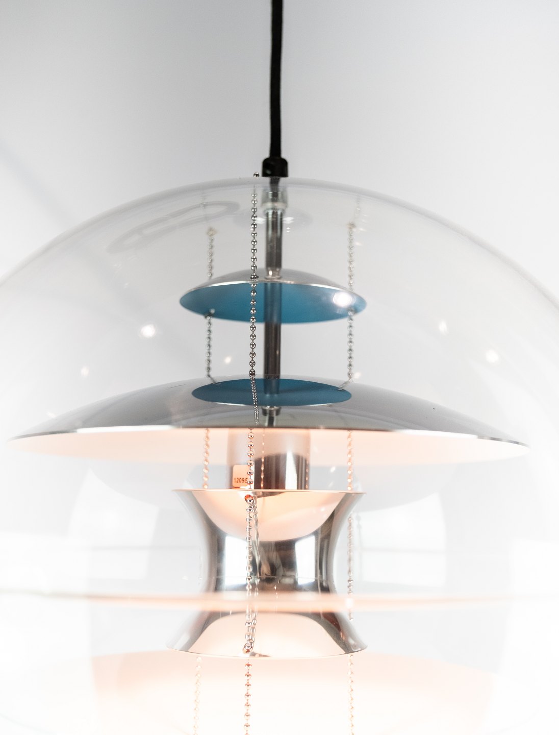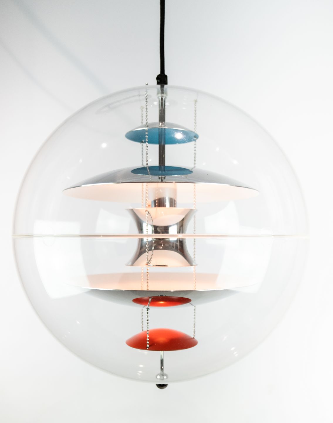 Globe, 40, designed by Verner Panton in 1969. The lamp is a transparent acrylic globe with 5 hanging metal reflectors, which is lacquered in White, blue and red.