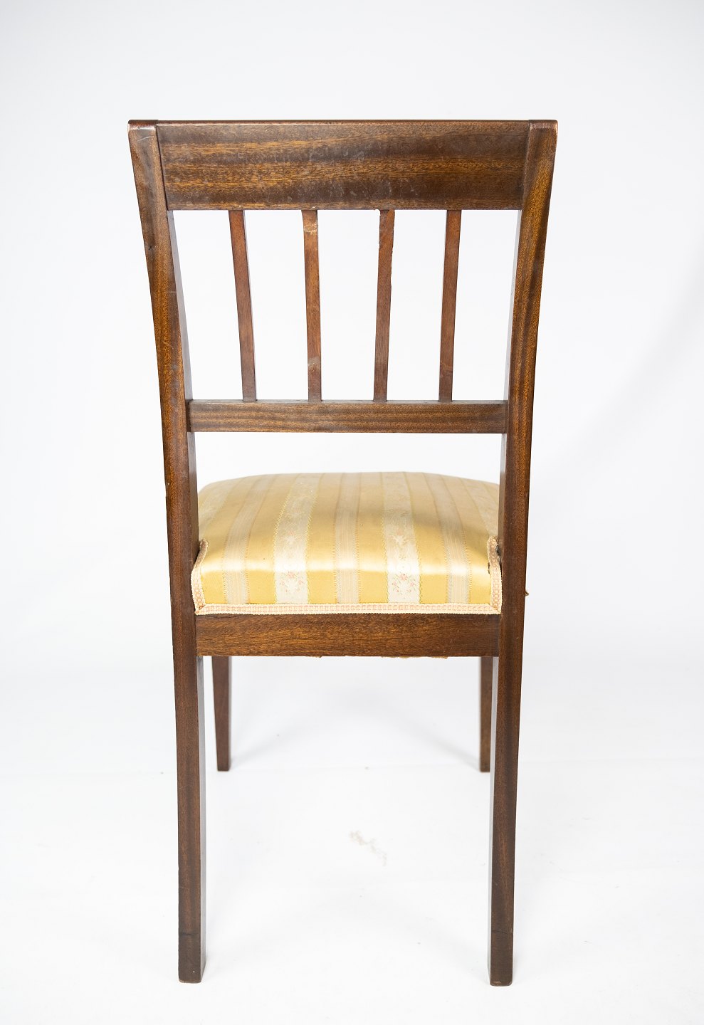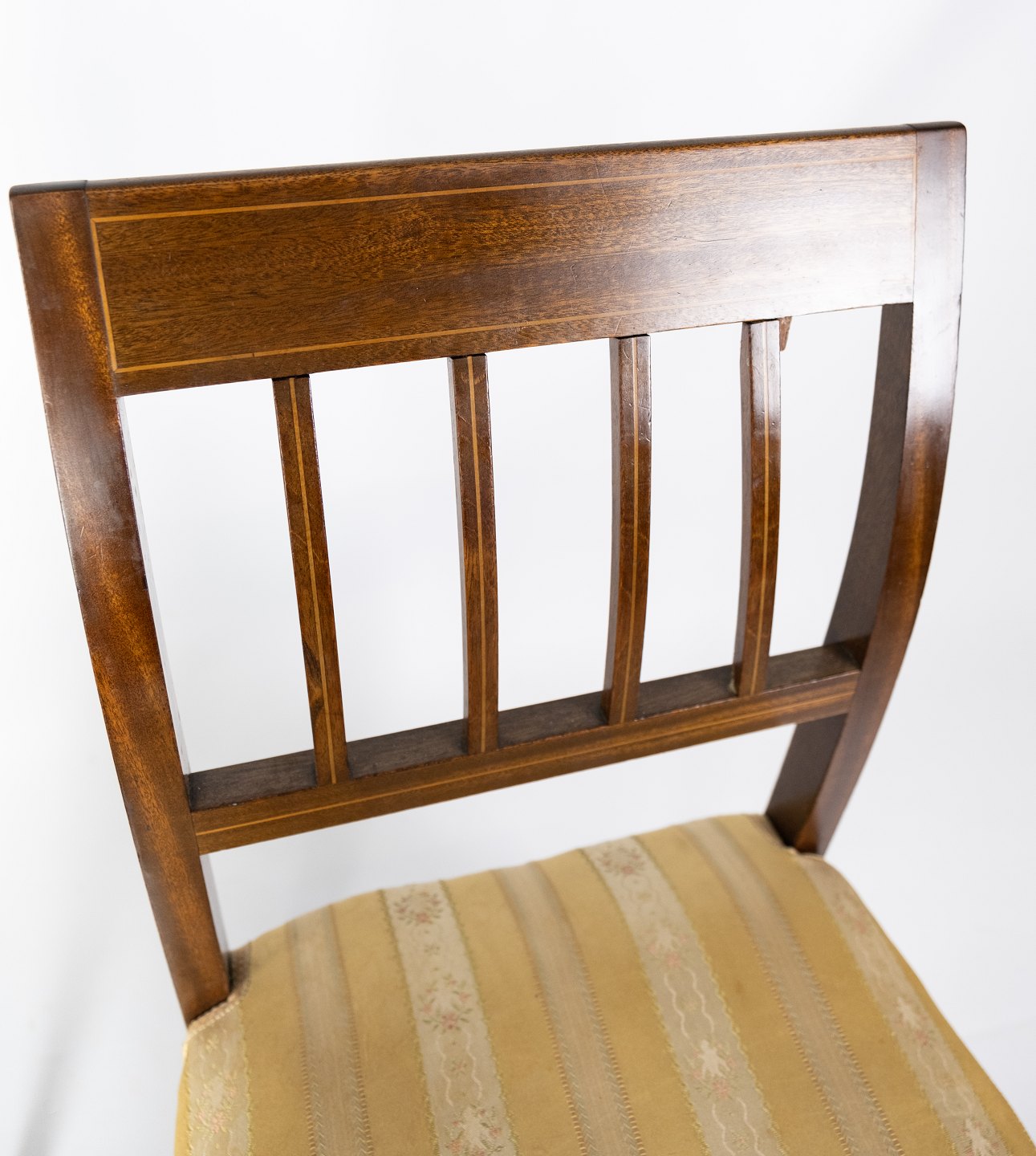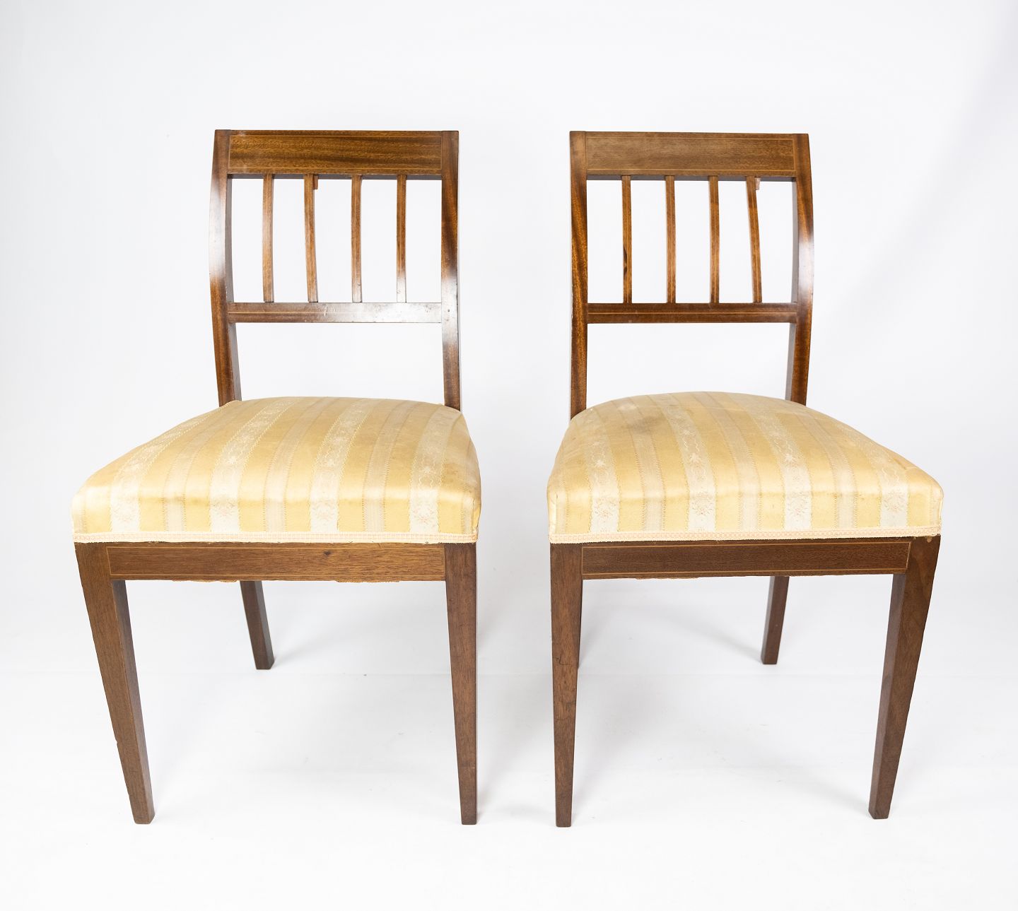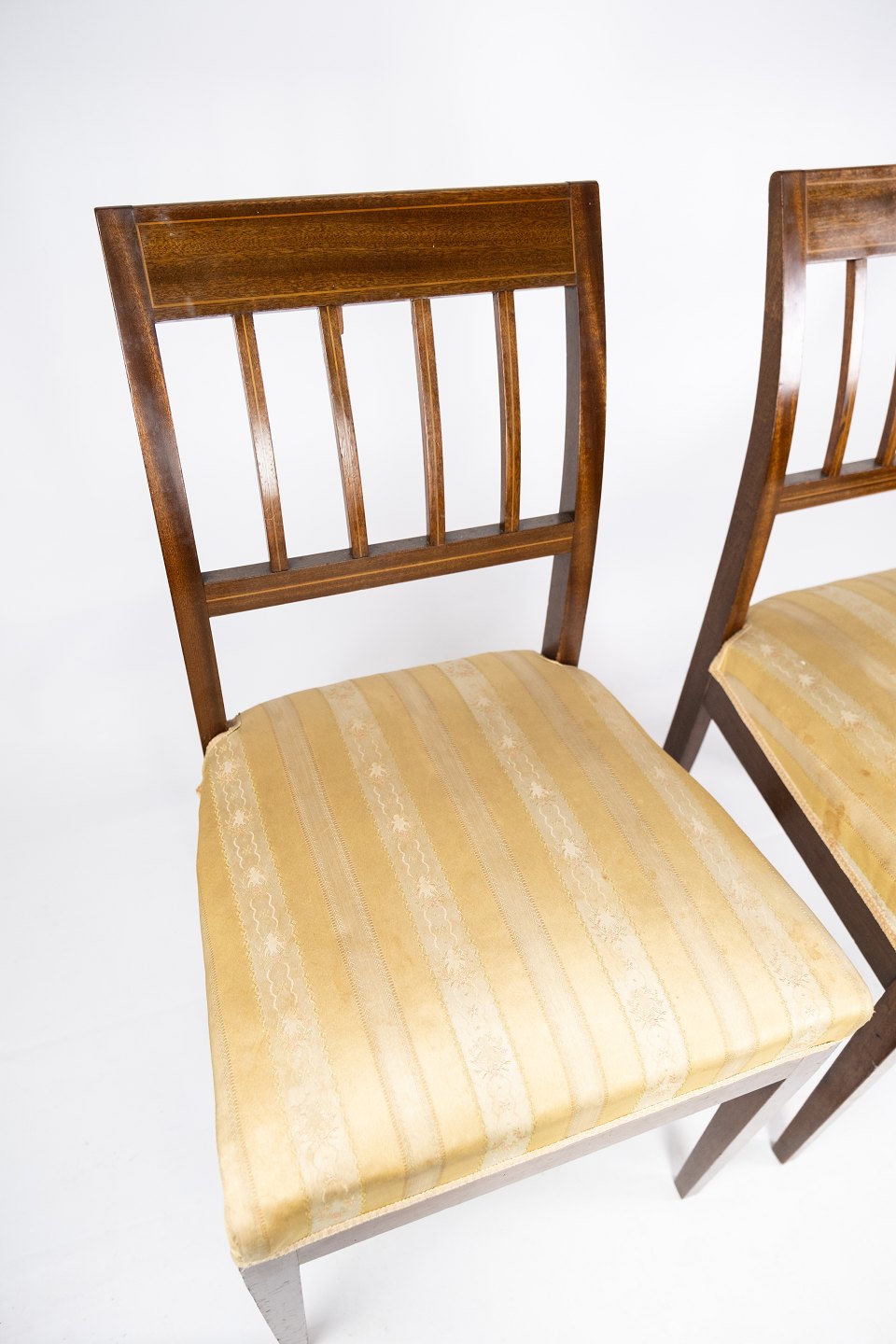 A pair of dining room chairs of mahogany with inlaid wood upholstered with light fabric from the 1920s.