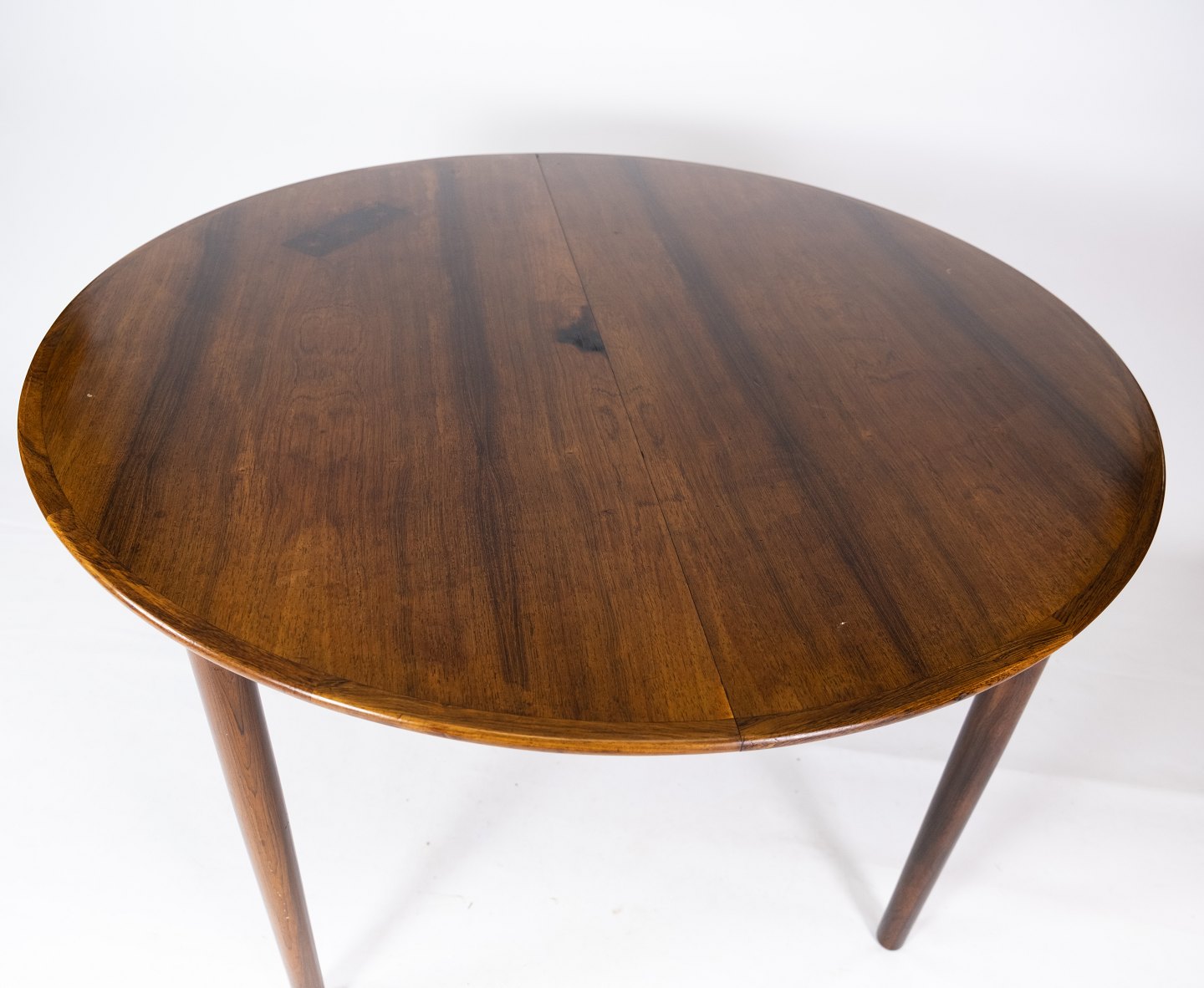 Dette spisebord i palisander, designet af Arne Vodder i 1960'erne, er et bemærkelsesværdigt eksempel på dansk møbeldesign fra denne æra. Palisandertræets varme farver og smukke mønstre giver bordet en elegant og sofistikeret fremtoning, der passer perfekt til moderne indretning.