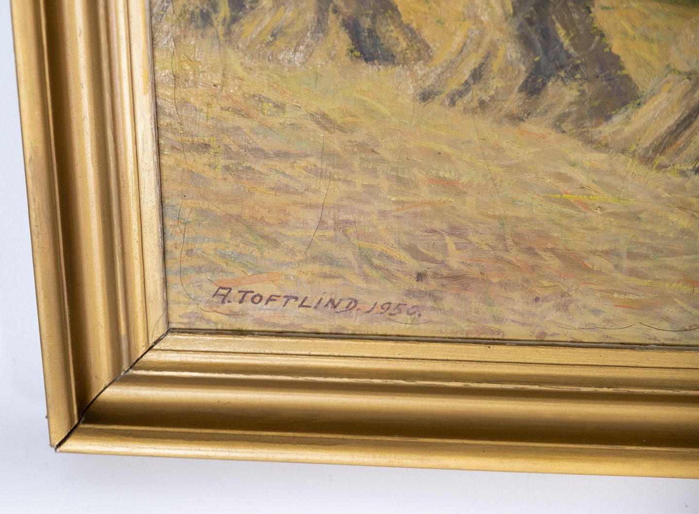 Oil painting with country motif and gilded frame, signed A. Toftlind 1950.