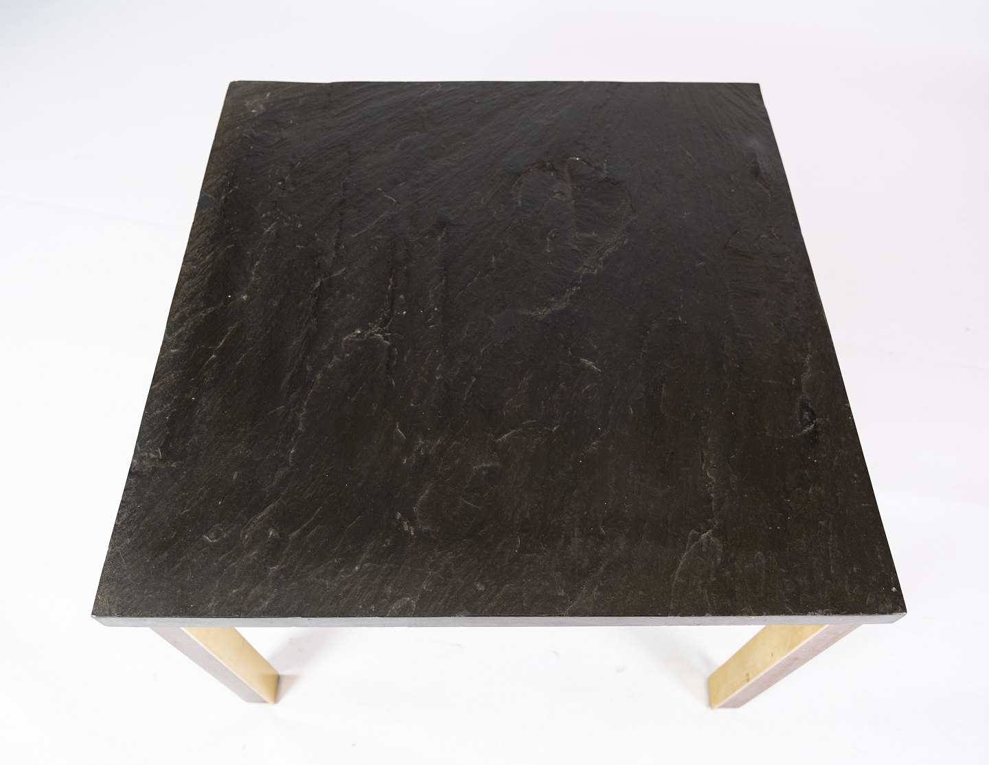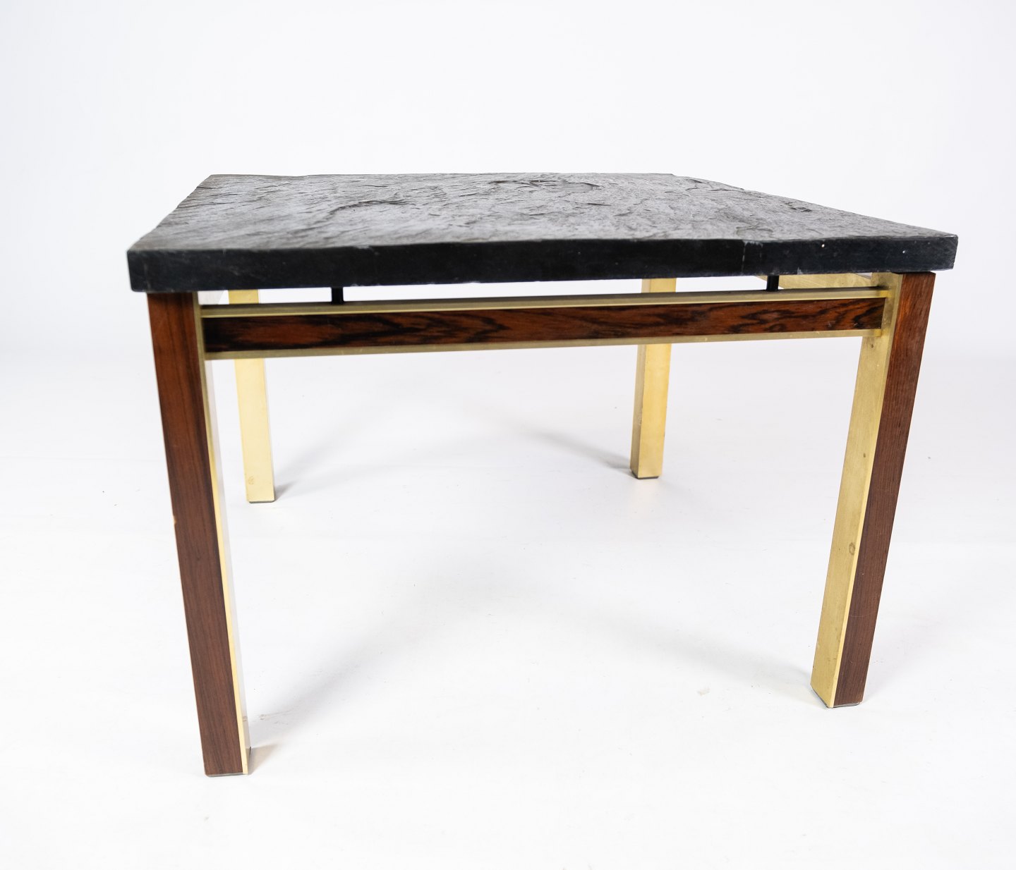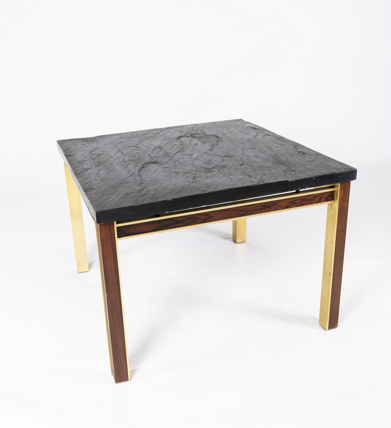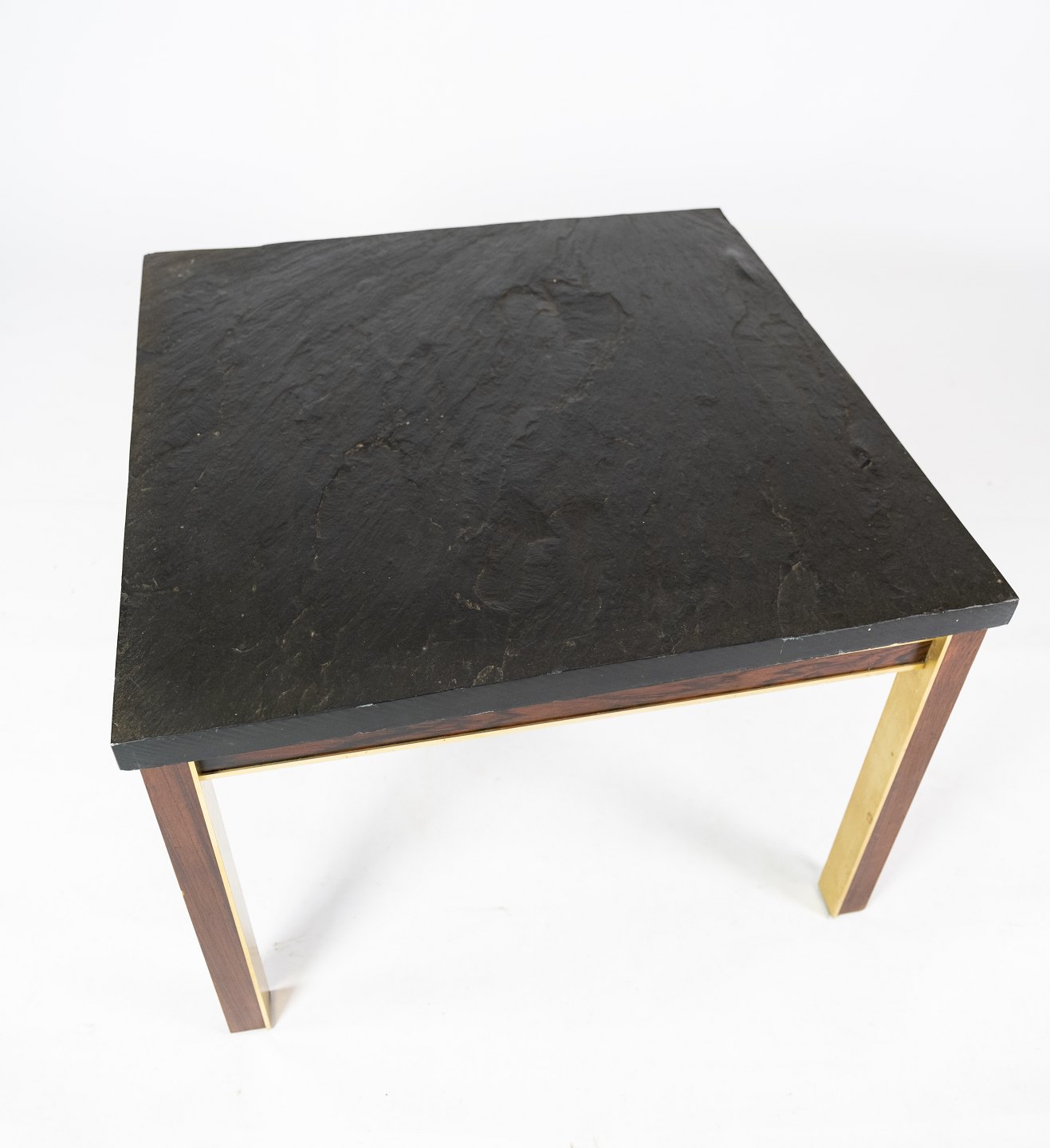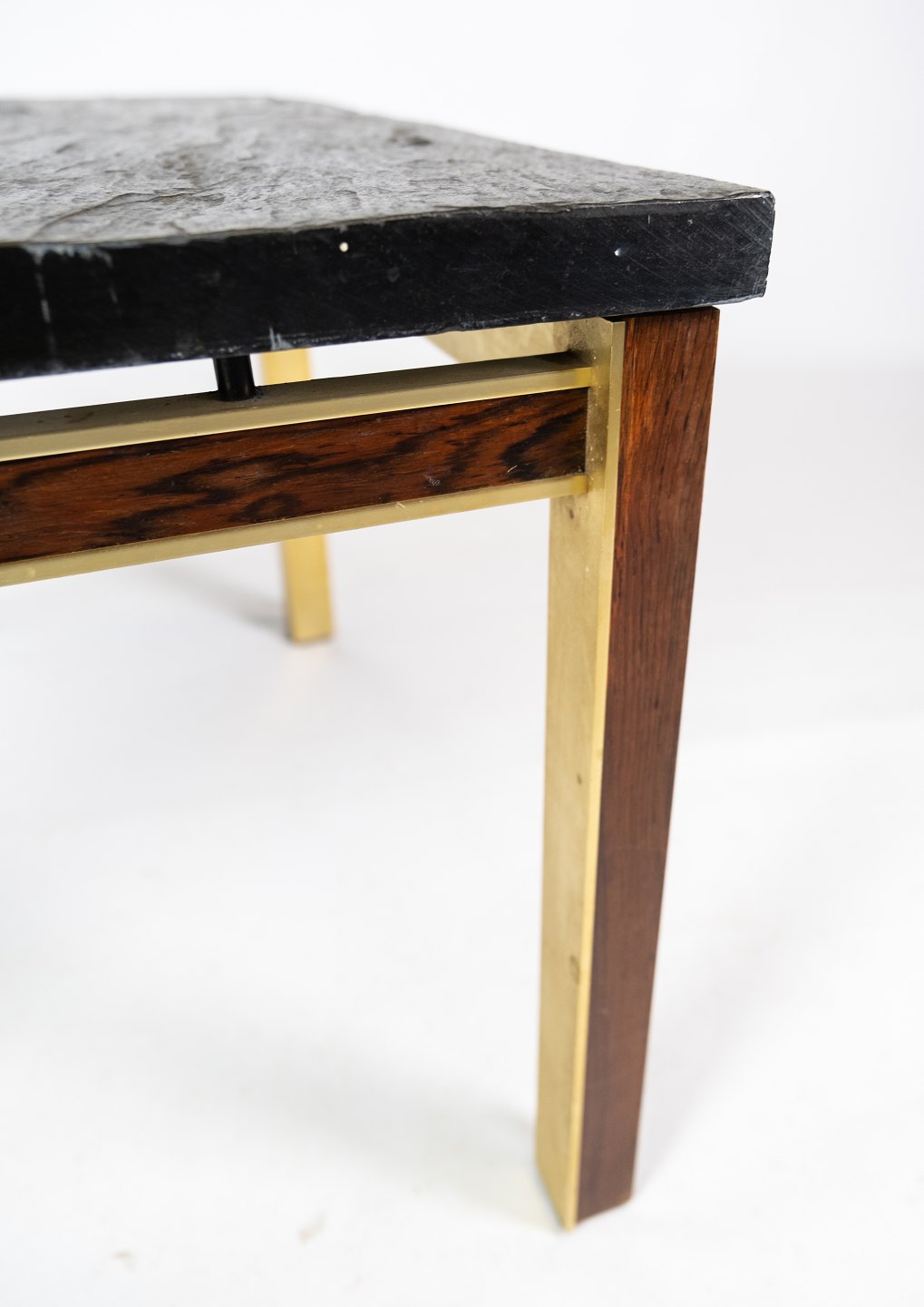 Couchtisch mit Schieferplatte, Gestell aus vergoldetem Metall und Palisander von Bendixen Design aus den 1970er Jahren. Der Tisch befindet sich in großartigem gebrauchten Zustand.