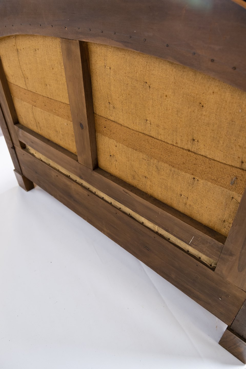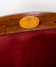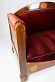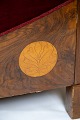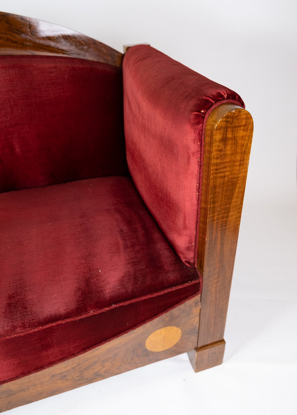 Two seater sofa of walnut with inlaid wood and upholstered with red velvet from around 1910. The sofa is in great vintage condition.