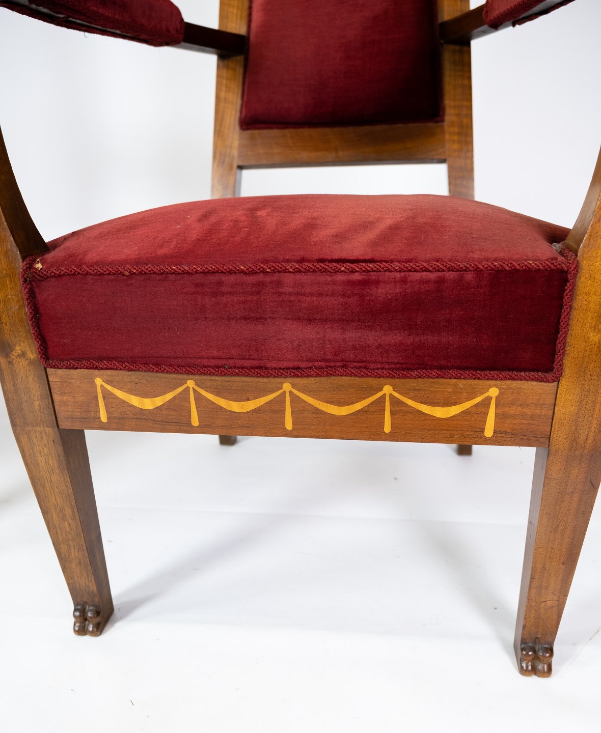 Set of two armchairs of walnut with inlaid wood and upholstered with red velvet from around 1910. The chairs are in great vintage condition.