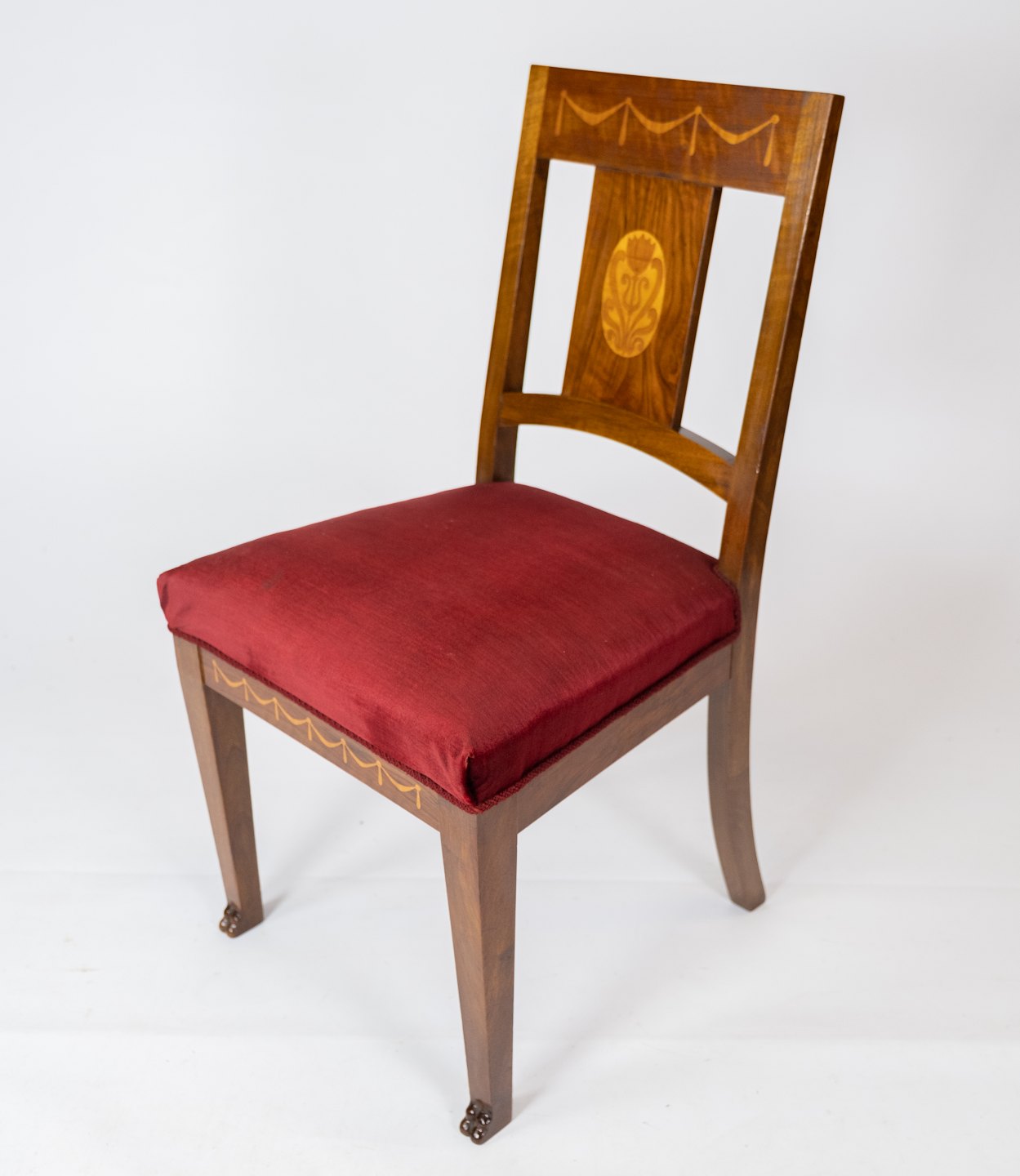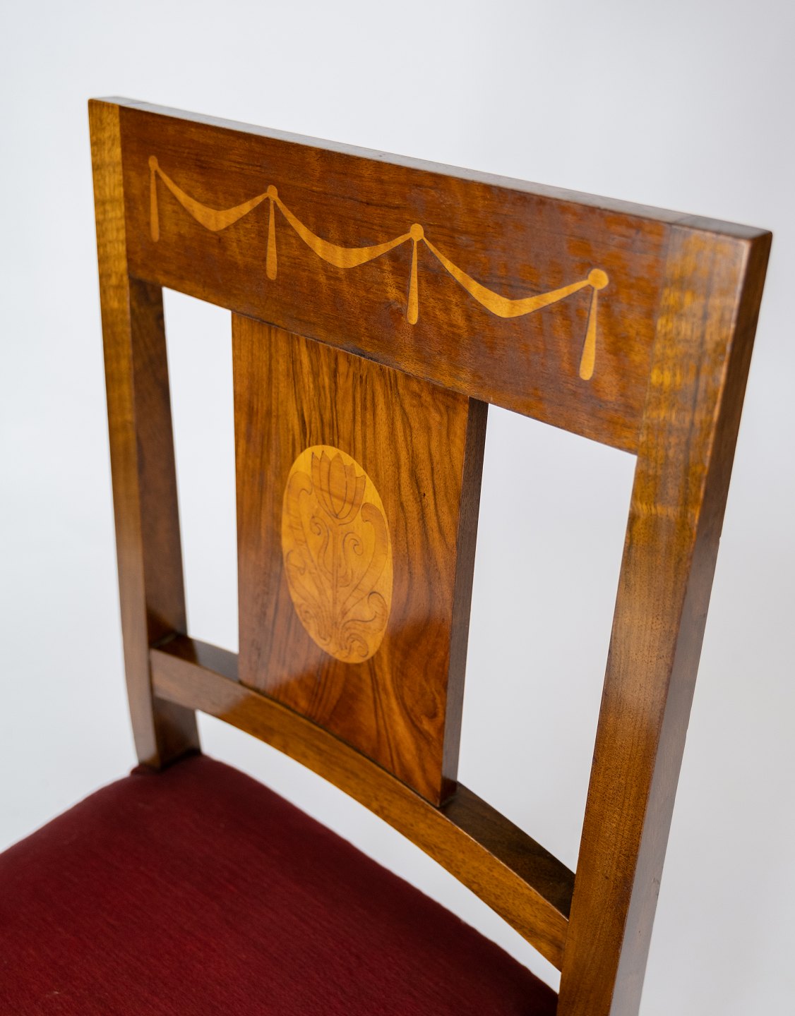 Set of four dining room chairs of walnut with inlaid wood and upholstered with red velvet from around 1910. The chairs are in great vintage condition.