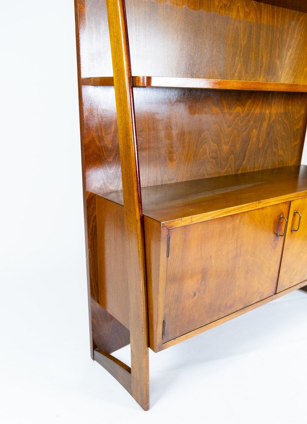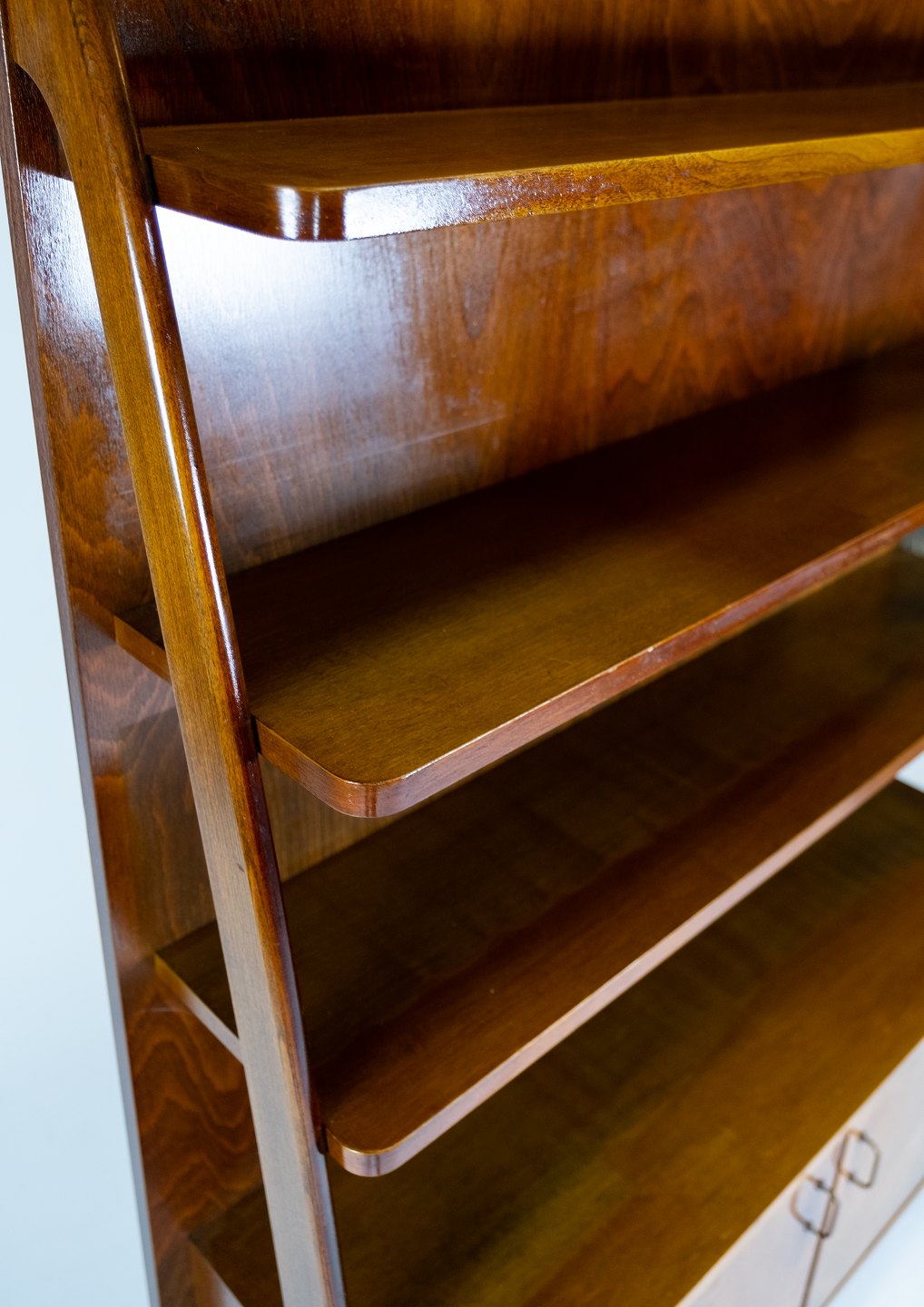 Bogreol med underskab i nøddetræ af dansk design fra 1950erne.Reolen er i flot brugt stand.