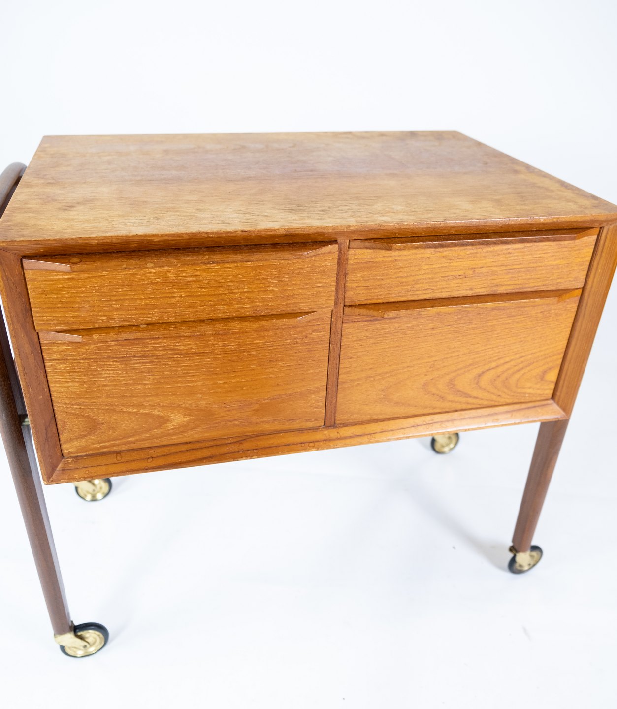 Sidebord med skuffer og på hjul i teak af dansk design fra 1960erne. Bordet er i flot brugt stand.