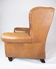 Stor hvilestole/øreklapstol i cognacfarvet læder. Stolen er i flot brugt stand.