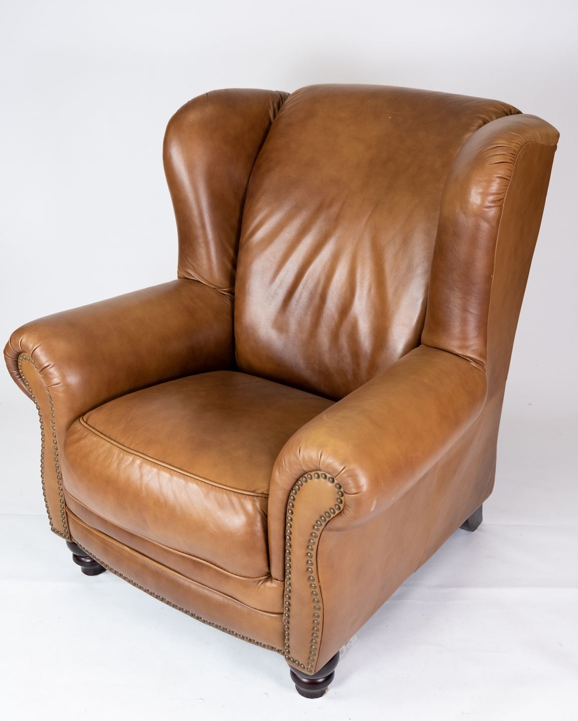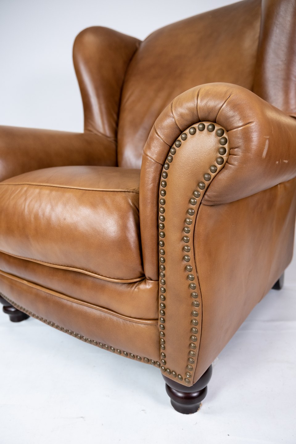 Stor hvilestole/øreklapstol i cognacfarvet læder.
