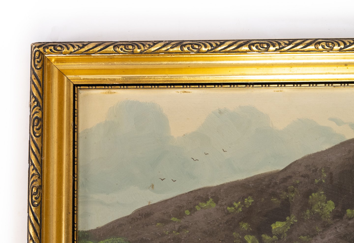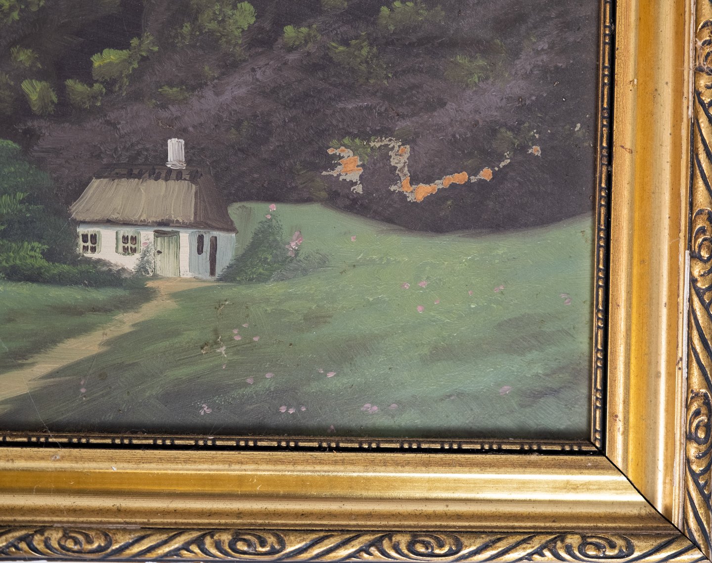 Oliemaleri med naturmotiv og forgyldt ramme, signeret C. B fra 1930erne.