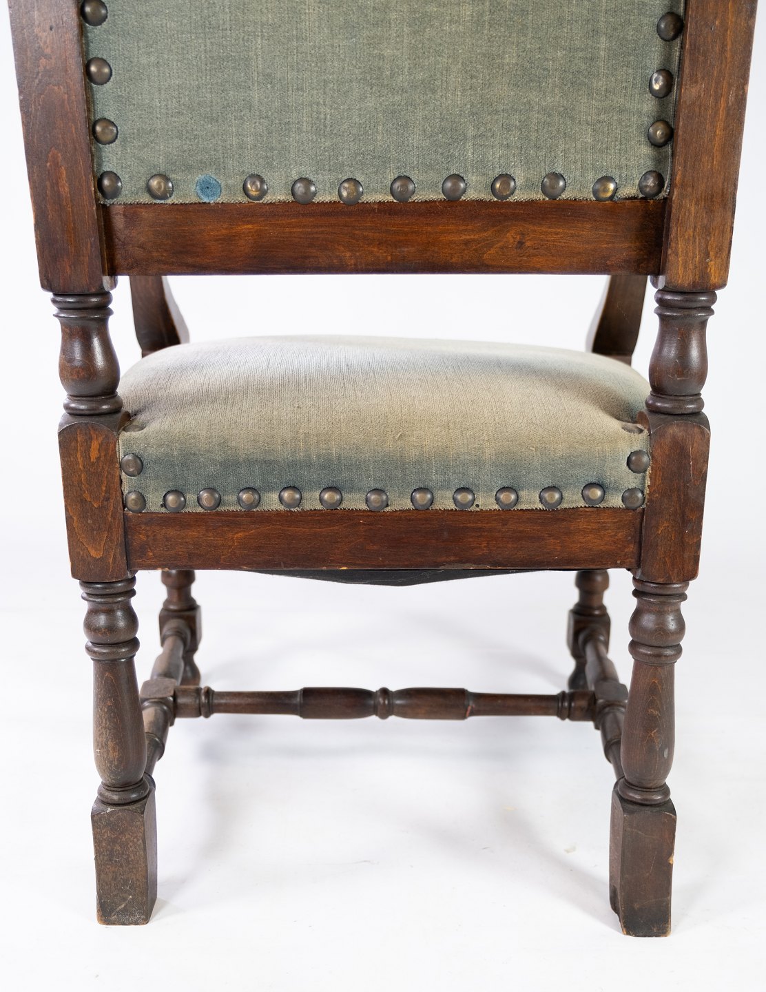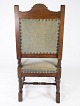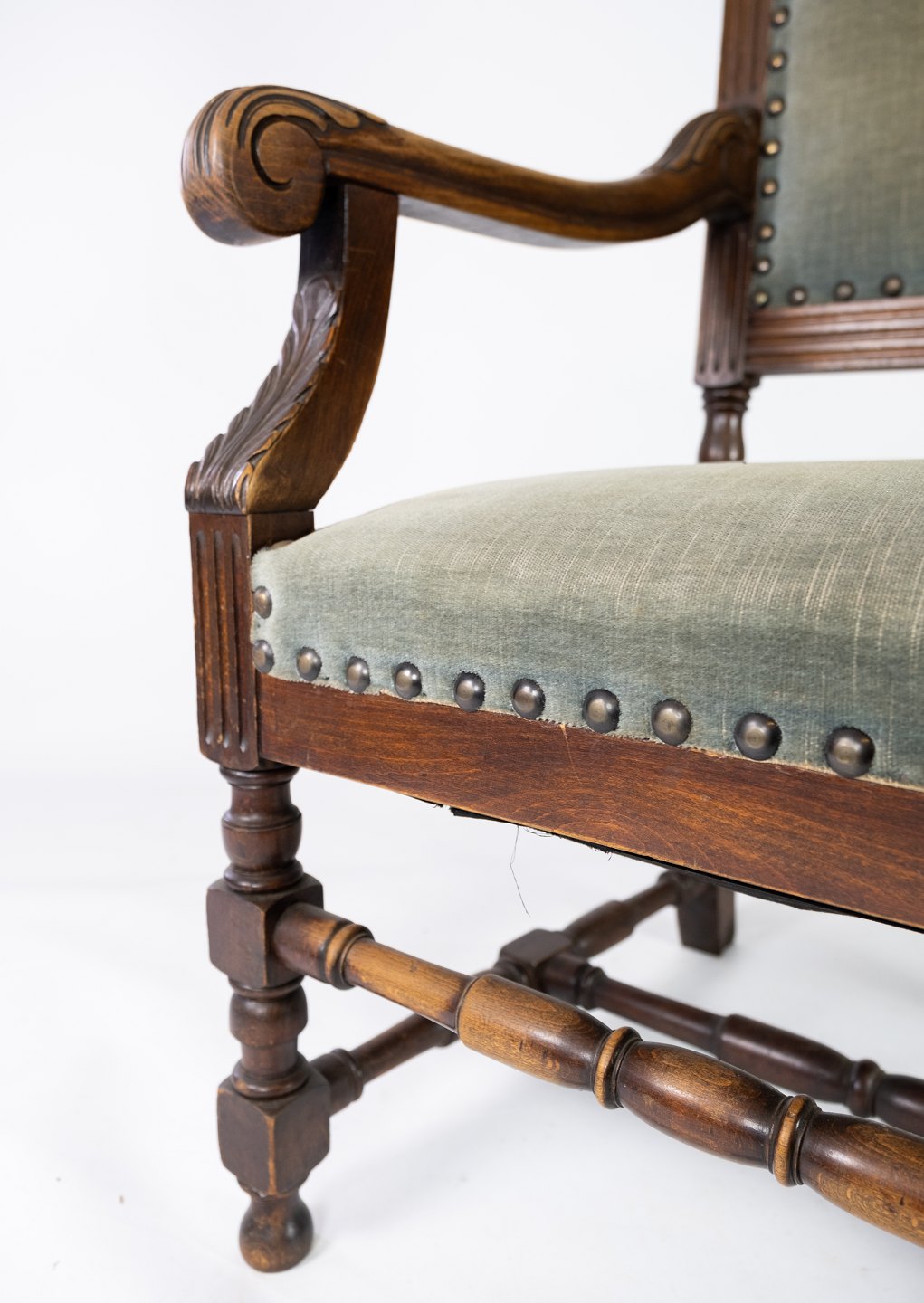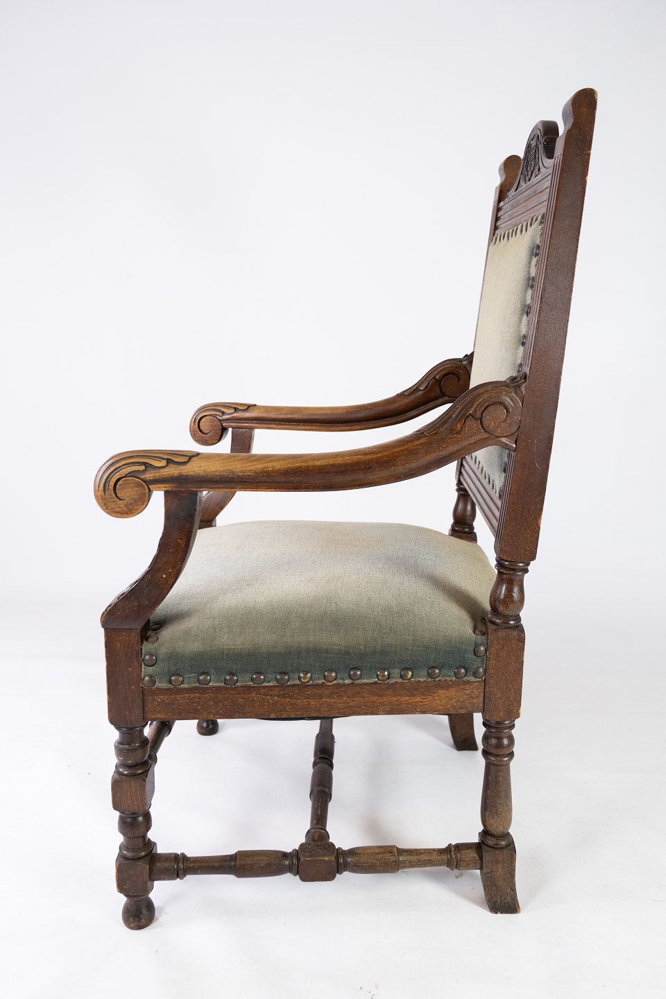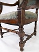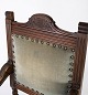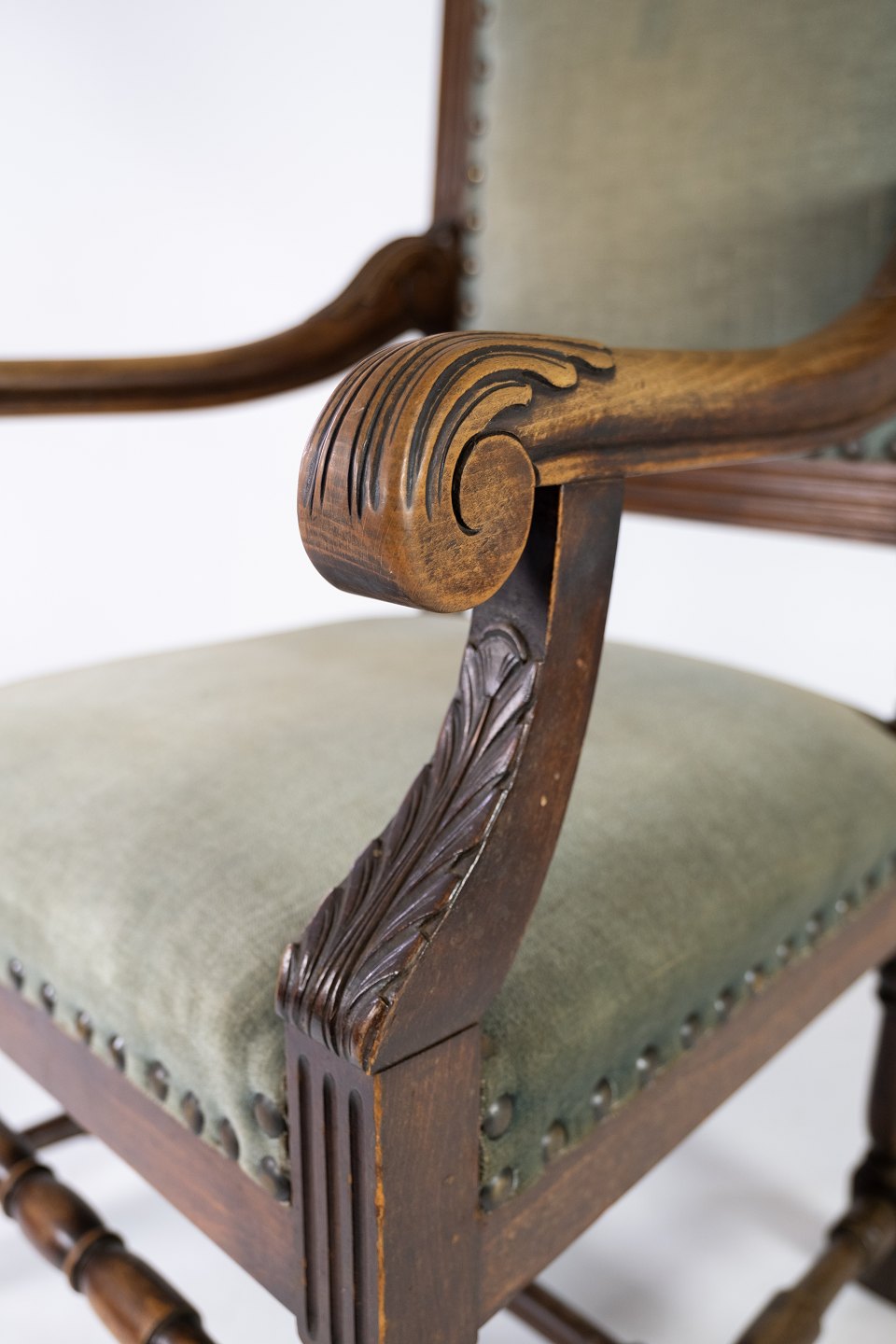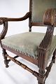 Armstol af nøddetræ og polstret med mørke grønt stof, i flot antik stand fra 1910erne.