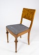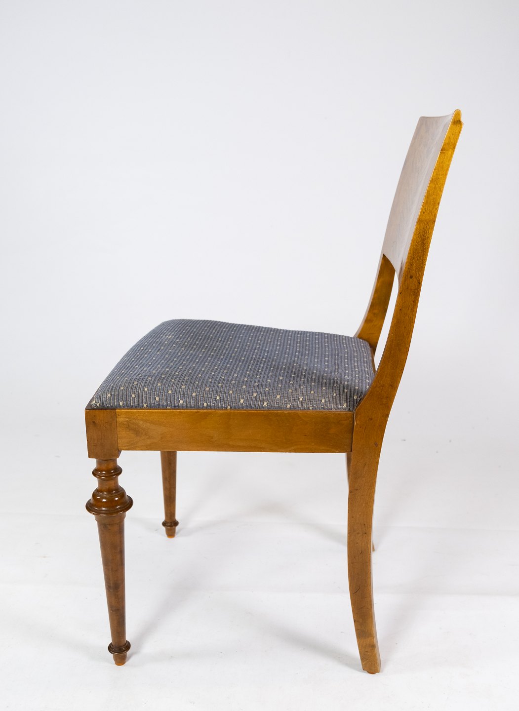Sæt af 8 spisestuestole af birketræ og polstret med blåt stof fra 1930erne. Stolene er i flot antik stand.