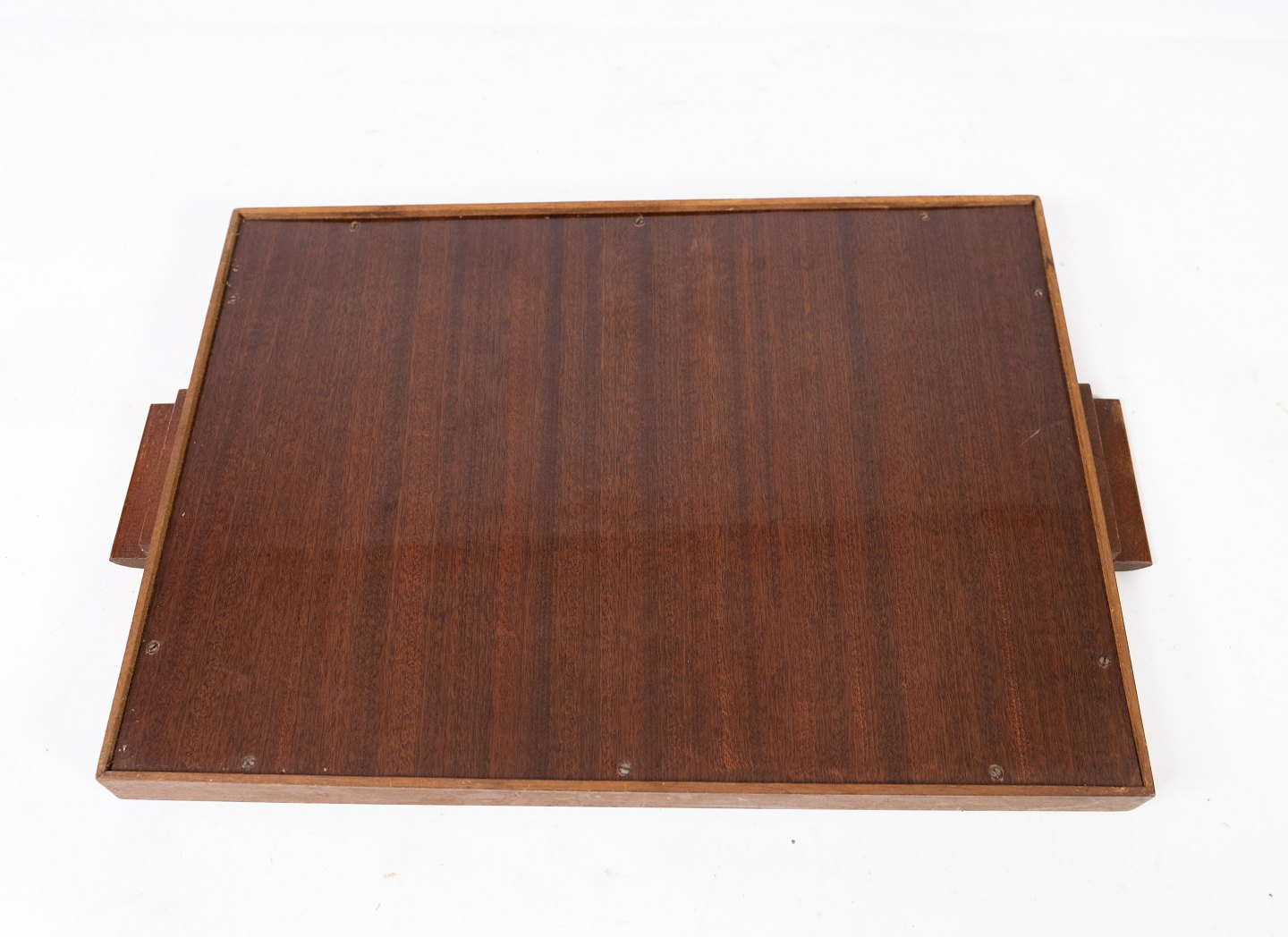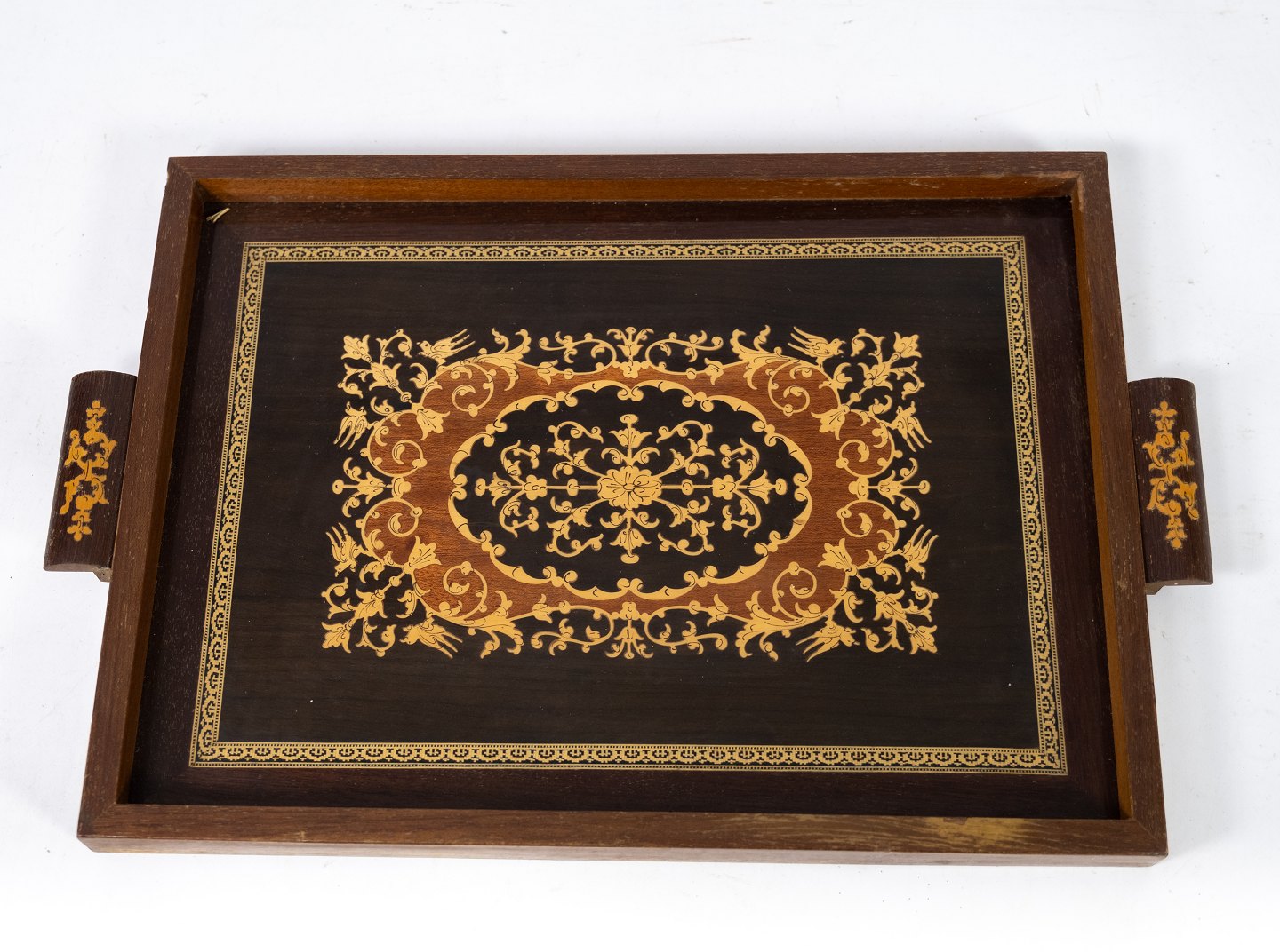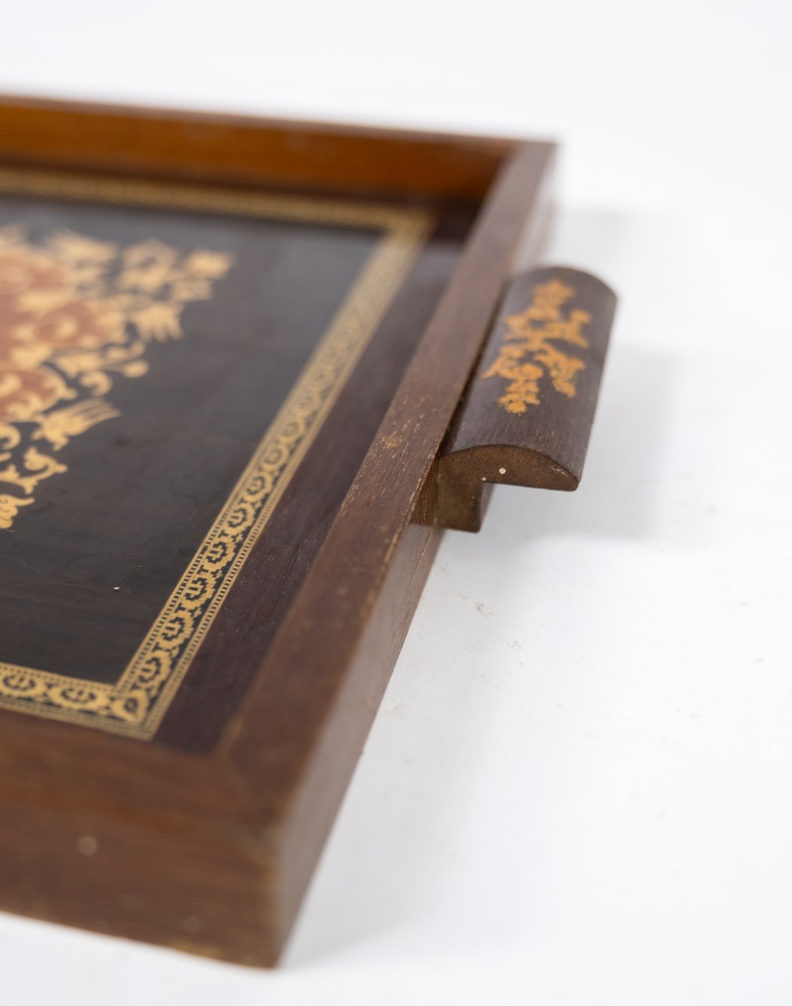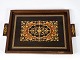 Serveringsfad af mørkt træ med intarsia fra 1940erne.