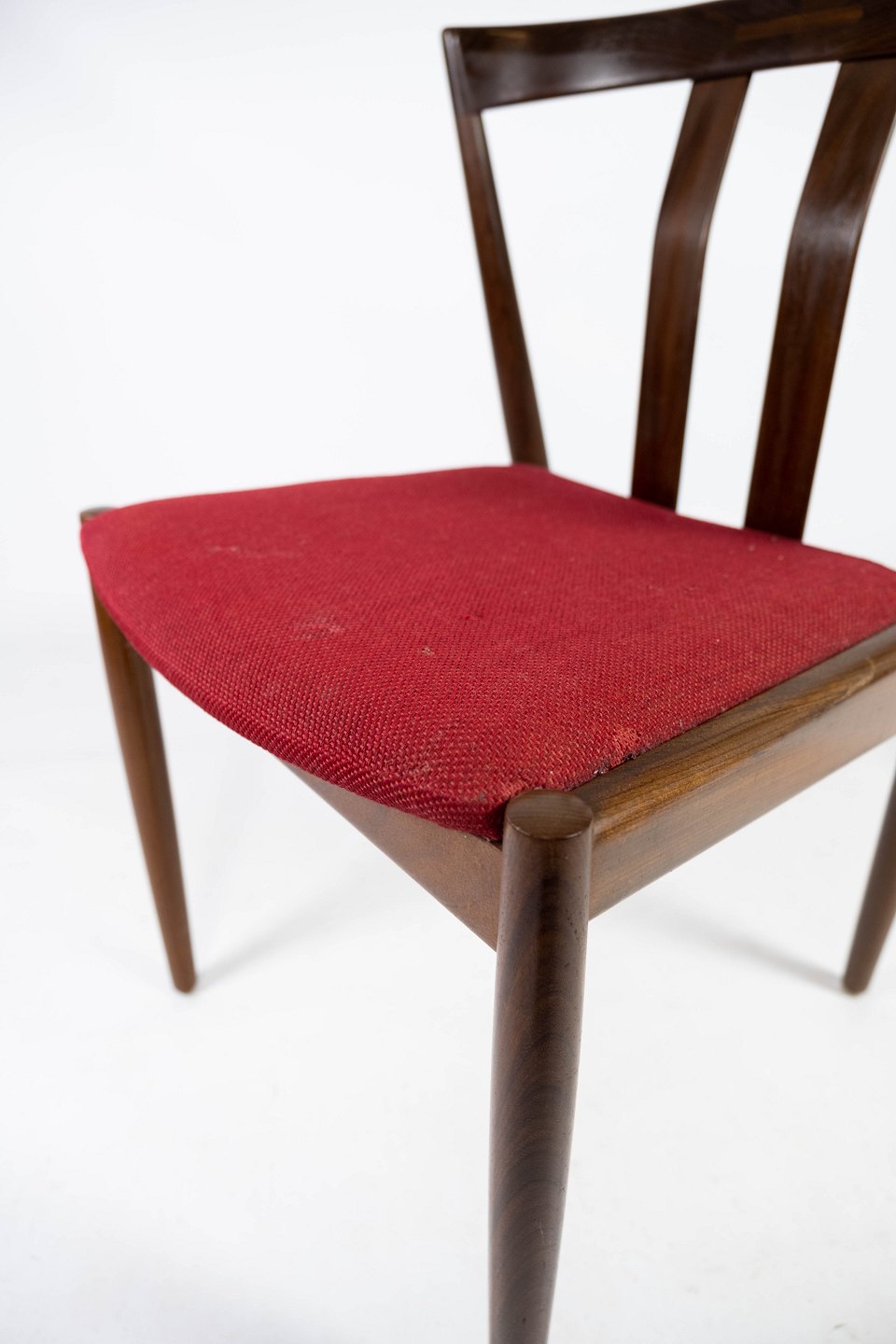 Spisestuestol i teak og polstret med rødt stof af dansk design fra 1960erne. Stolen er i flot brugt stand.