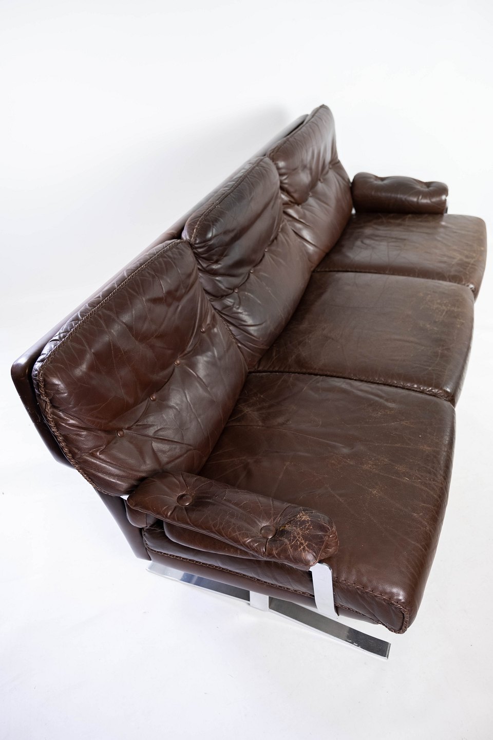 The three-seater sofa in brown patinated leather with a metal frame, designed by Arne Norell in 1970, is a distinctive example of Scandinavian furniture design from the 20th century. Norell was known for his talent for creating furniture that combined comfort, functionality and unique aesthetics, and this sofa is no exception.