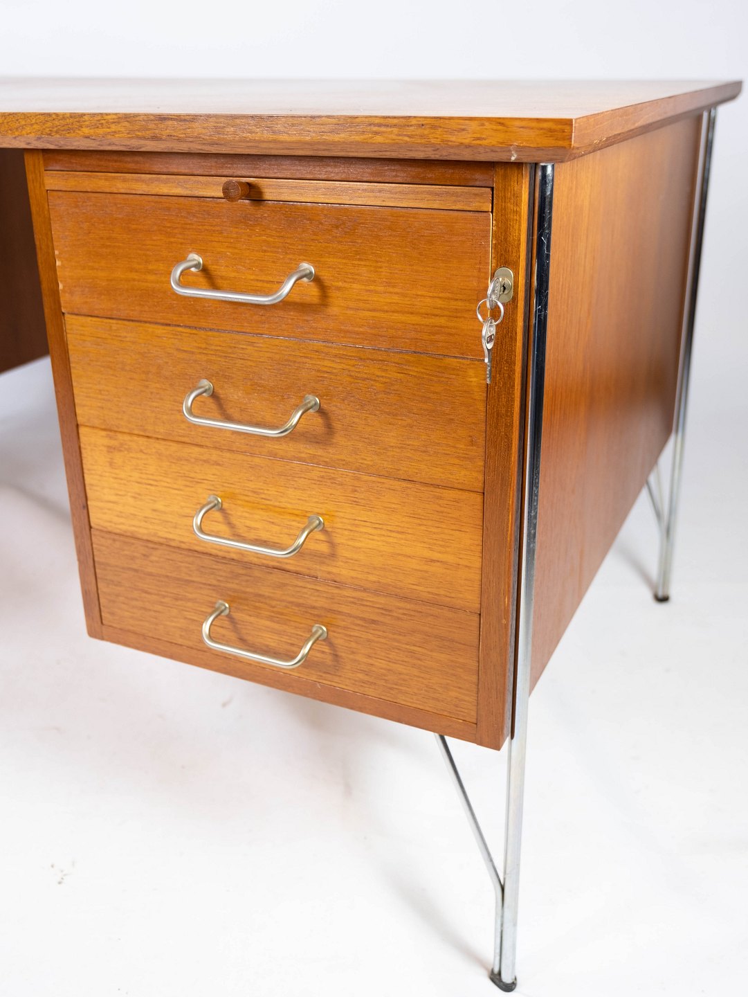 This desk is an example of Danish design from the 1970s and is made of teak wood, which gives it a natural and timeless look. The warm color and the characteristic wood patterns add a unique aesthetic to the room. The desk has a simple and elegant design that fits in well with both modern and classic interiors.