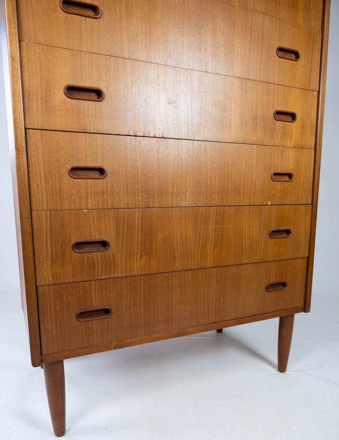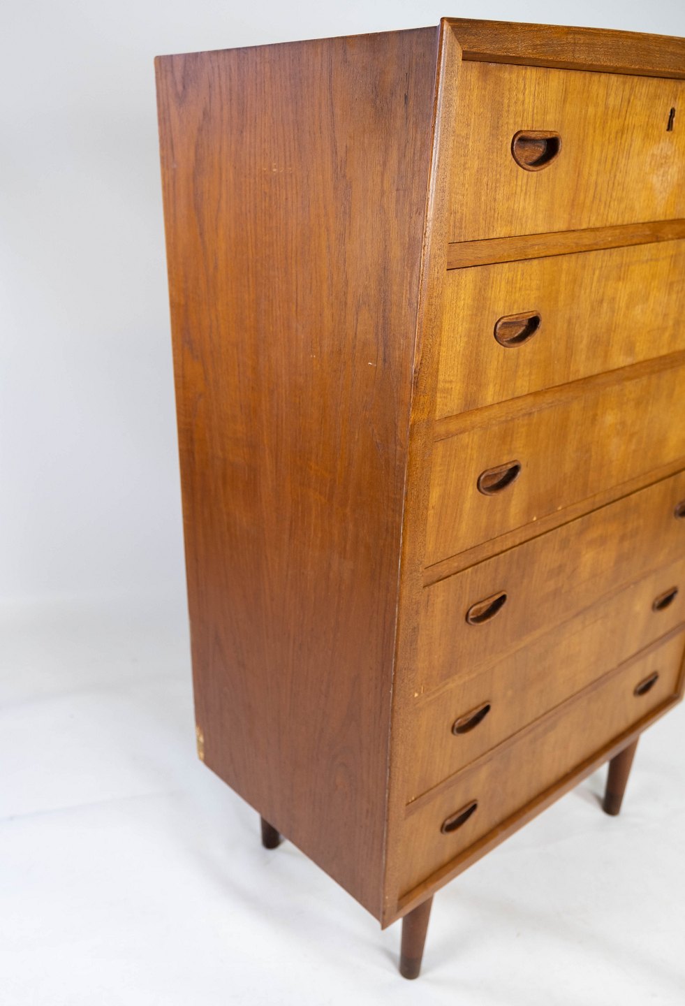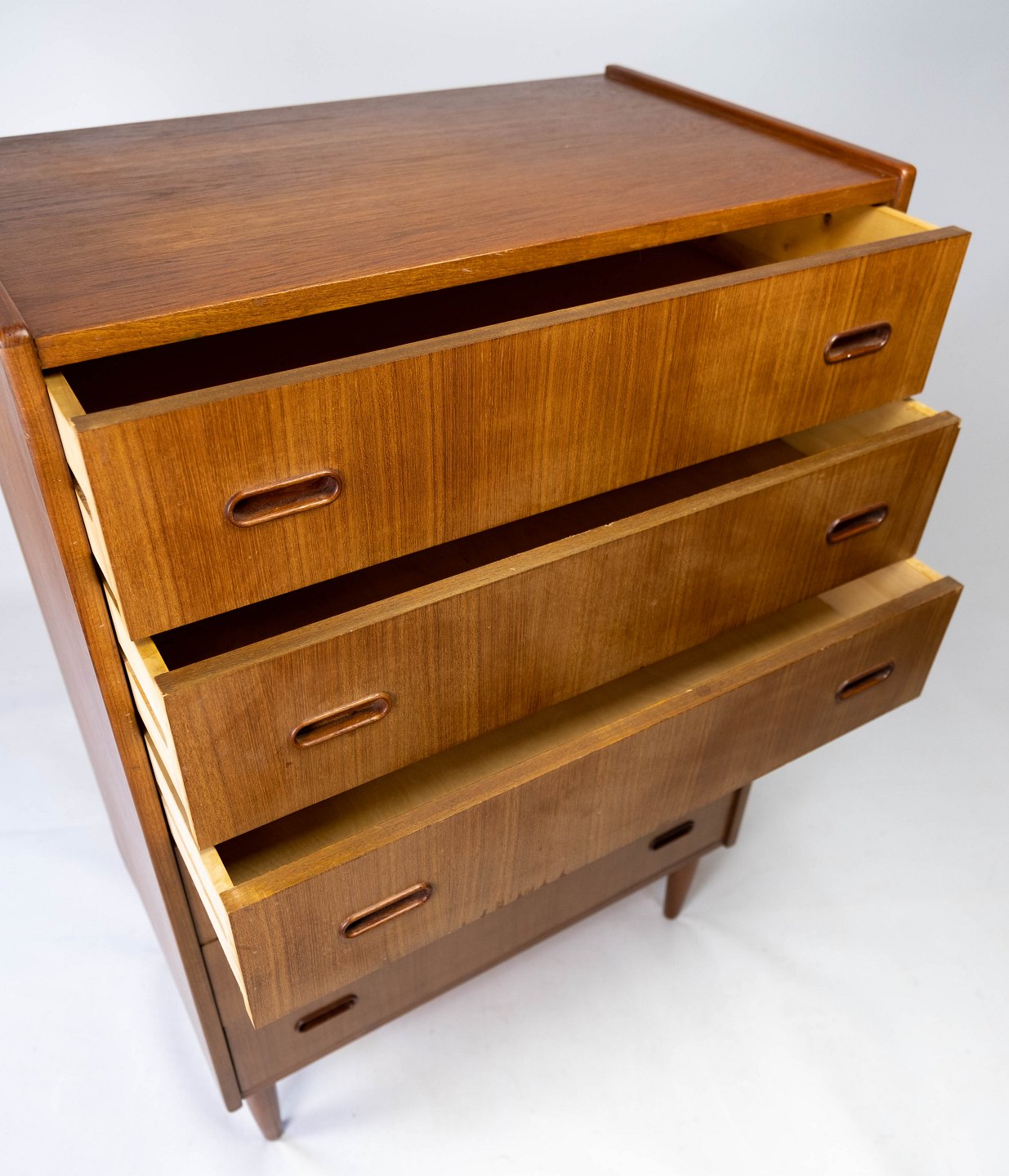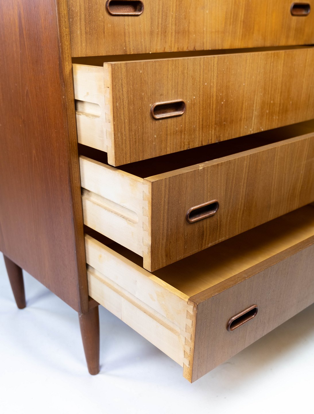 This teak chest of drawers, designed by Danish craftsmen around 1960, is a classic example of Danish furniture design from this era. The teak wood adds a warm and natural tone to the furniture and at the same time brings a feeling of durability and timelessness.
