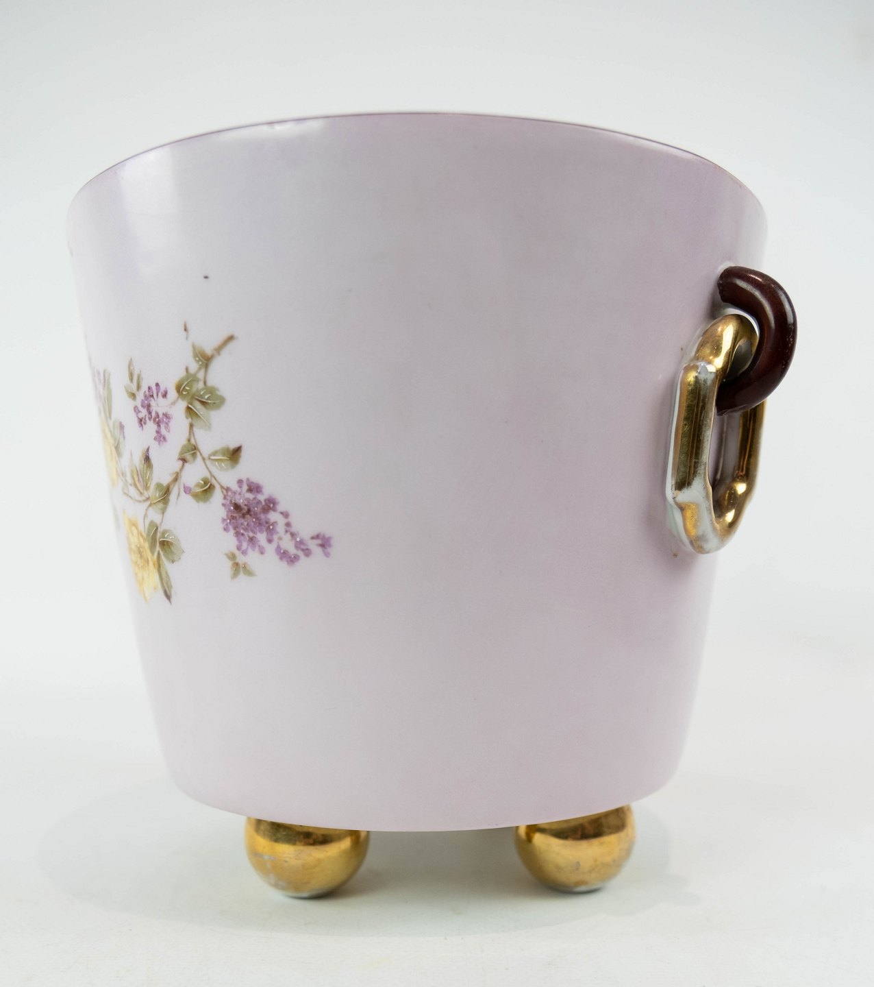 Urtepotteskjuler i lyse farver dekoreret med blomster, i flot brugt stand fra 1870erne.