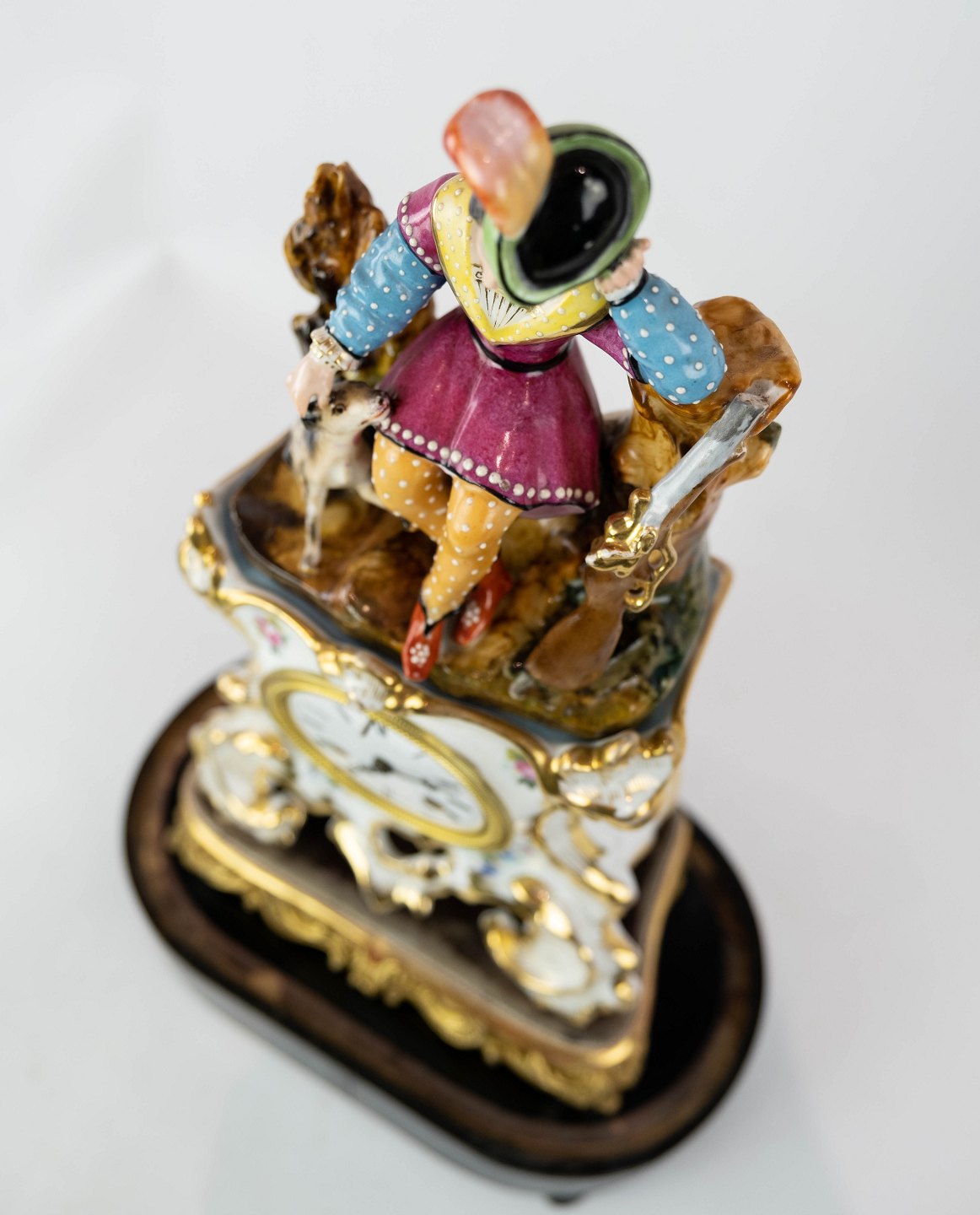 French table clock with glass dome and decorated with figure of porcelain from 1860. The clock is in great vintage condition.