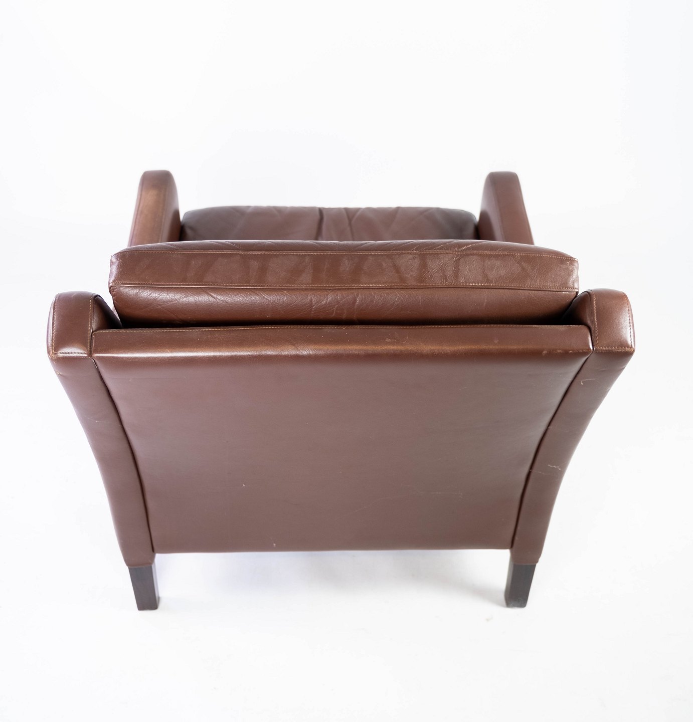 Easy chair upholstered with dark brown leather and legs of dark wood, of danish design from the 1960s. The chair is in great vintage condition.