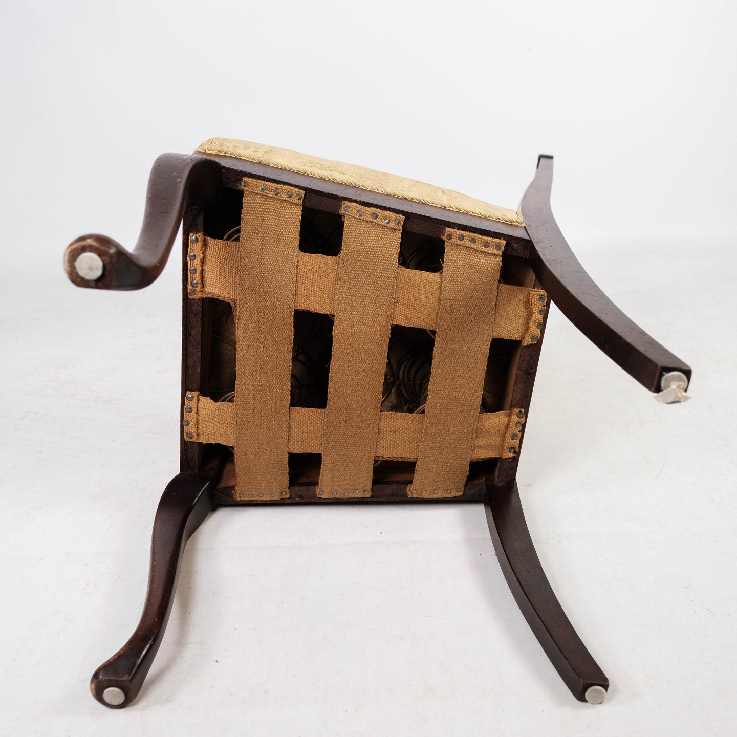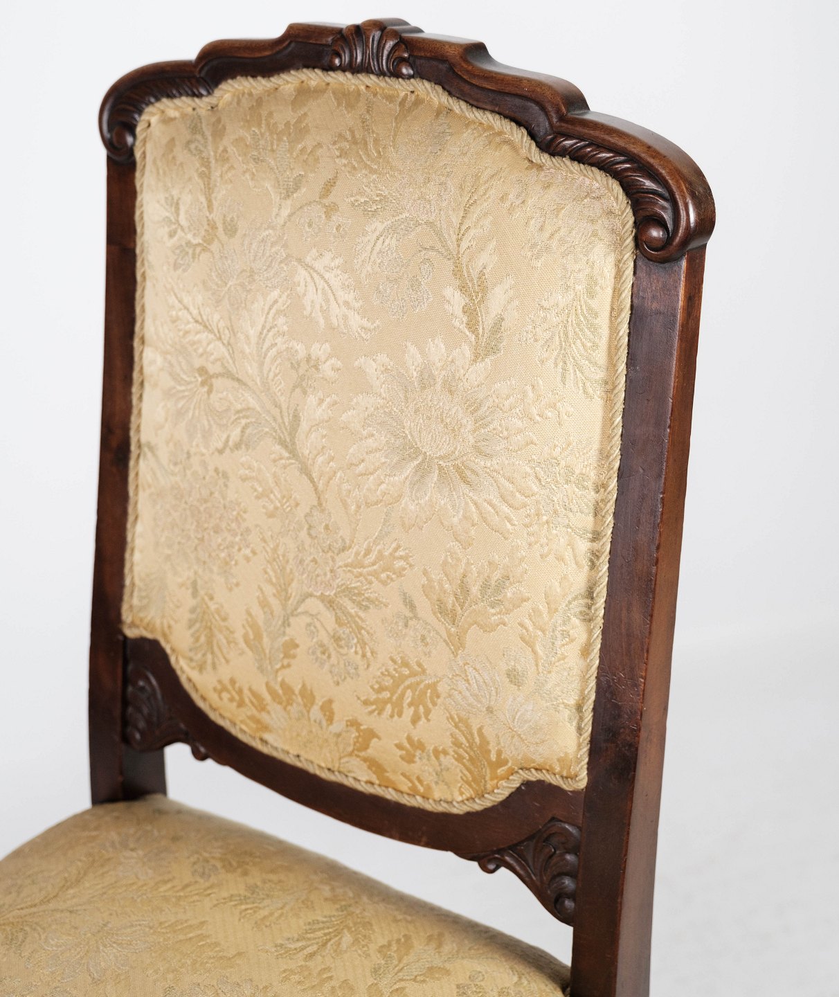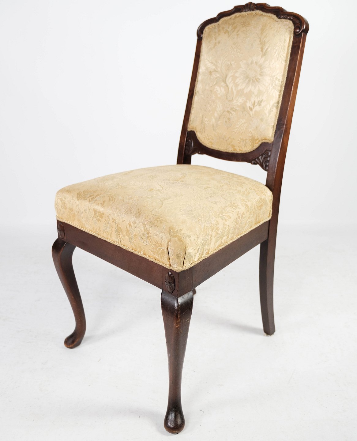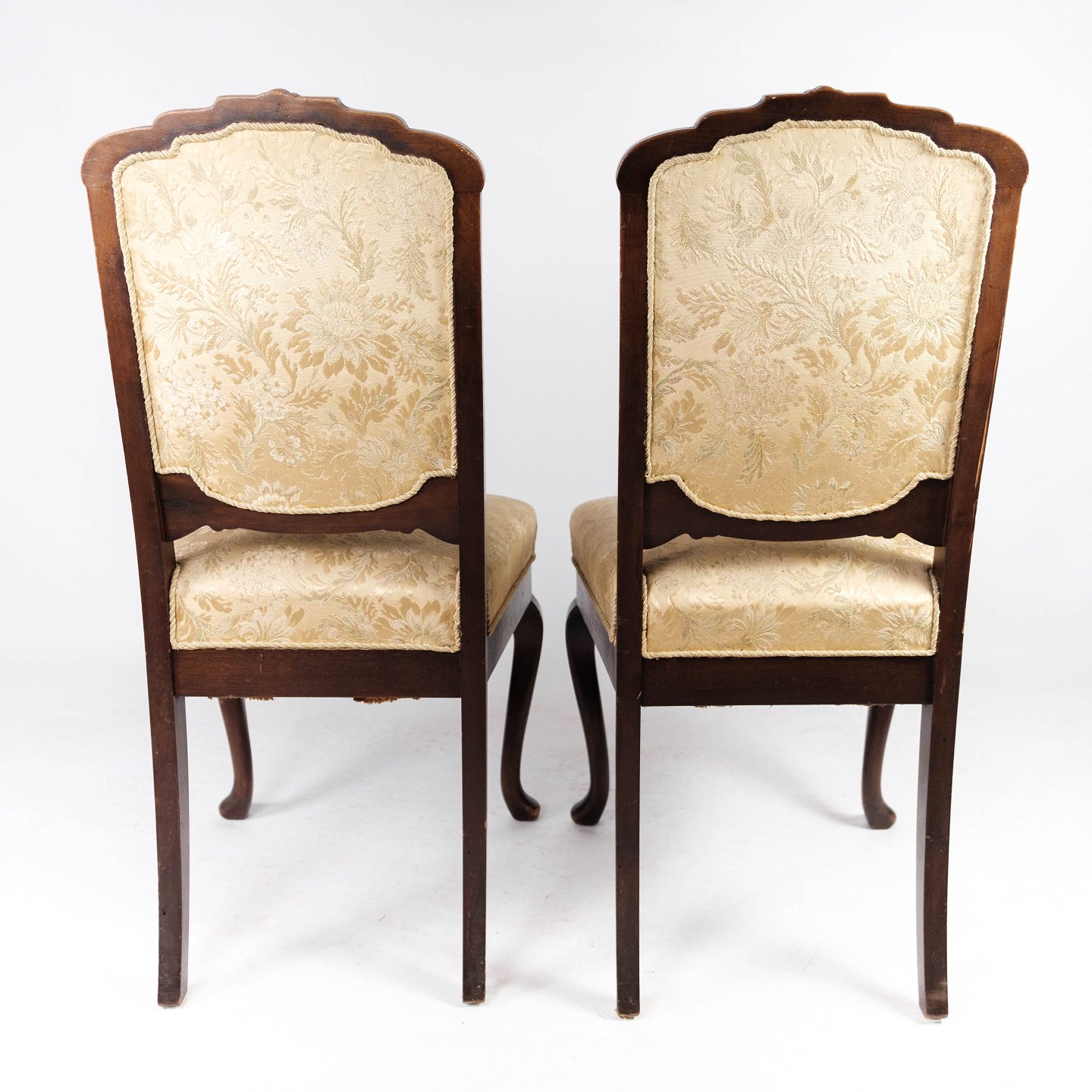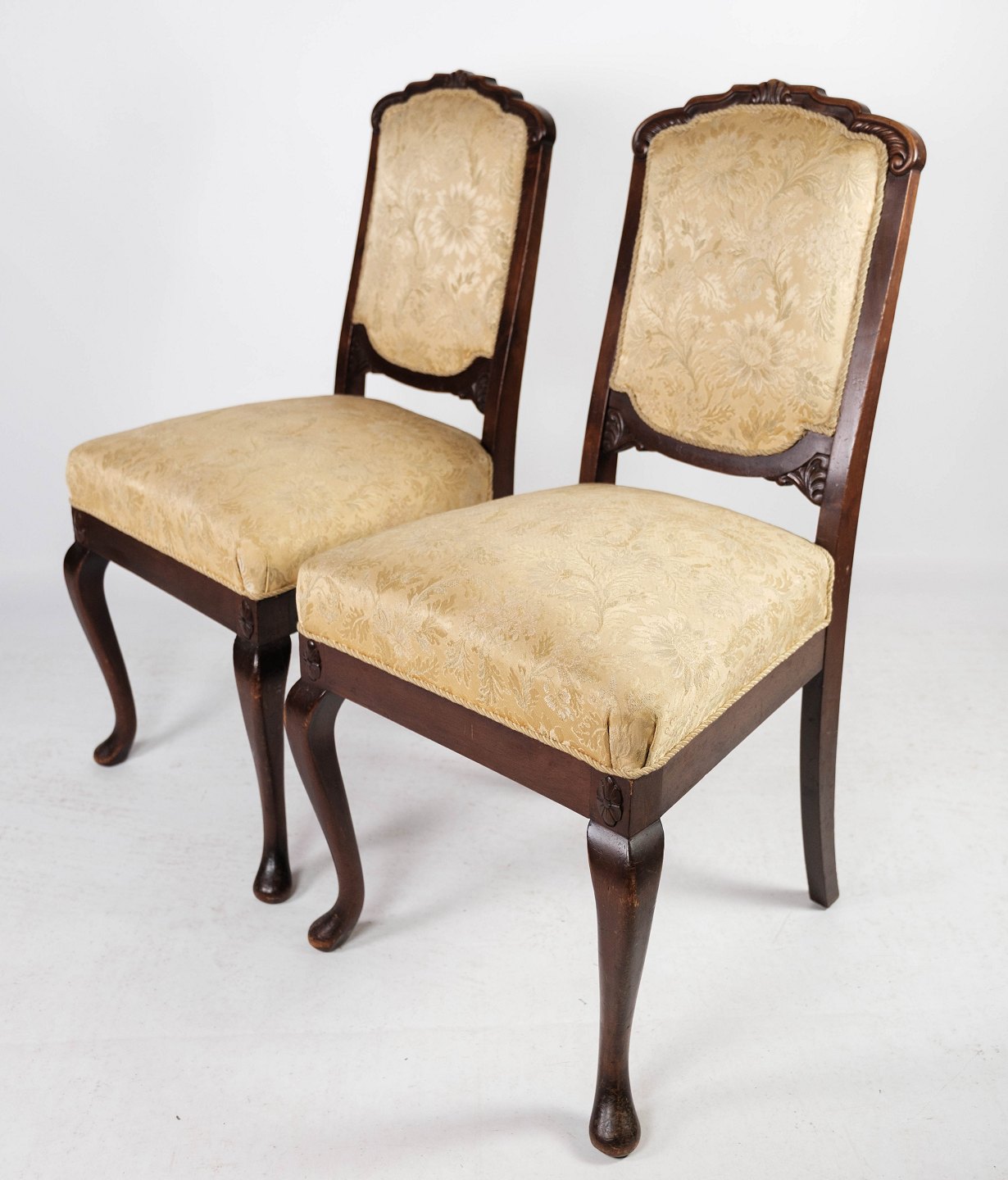 Sæt af to spisestuestole af eg og polstret med lyst stof, i flot antik stand fra 1930erne.