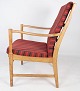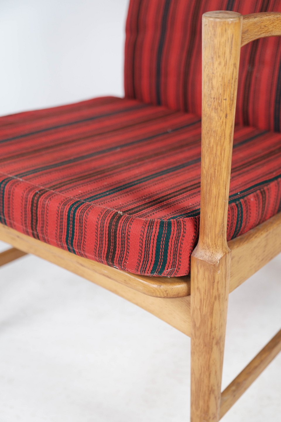 Denne armstol i egetræ med hynder betrukket med rødt stribet stof er et vidunderligt eksempel på svensk håndværk og design fra 1960'erne. Med sit smukke træ og behagelige polstring tilbyder stolen både stil og komfort. Den er velegnet til enhver indretning og vil med sikkerhed tilføre et strejf af elegance til ethvert rum.