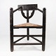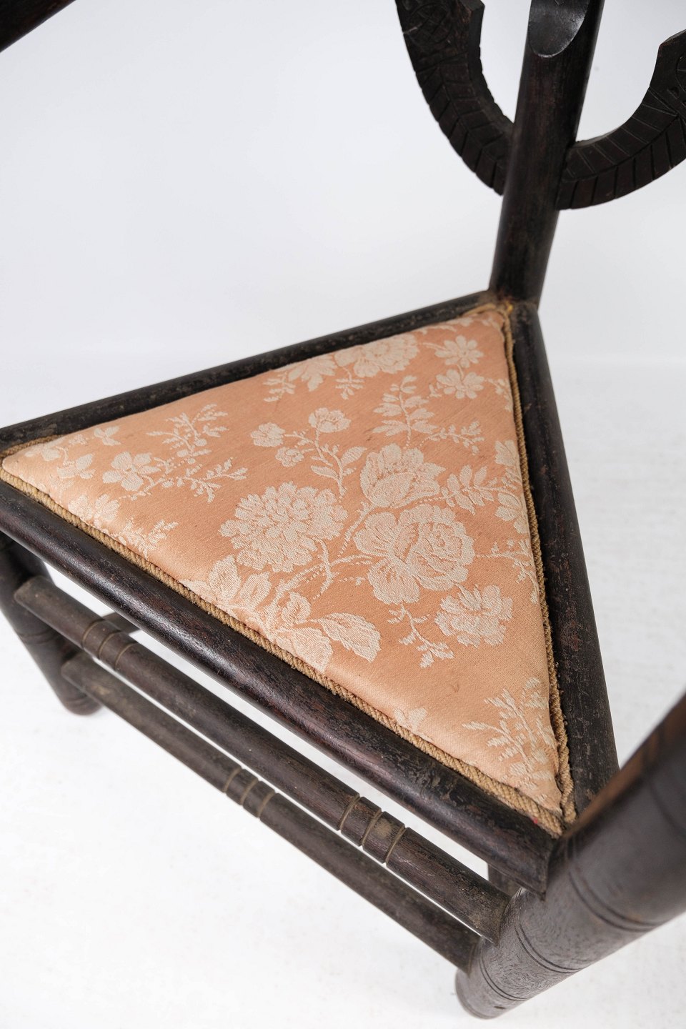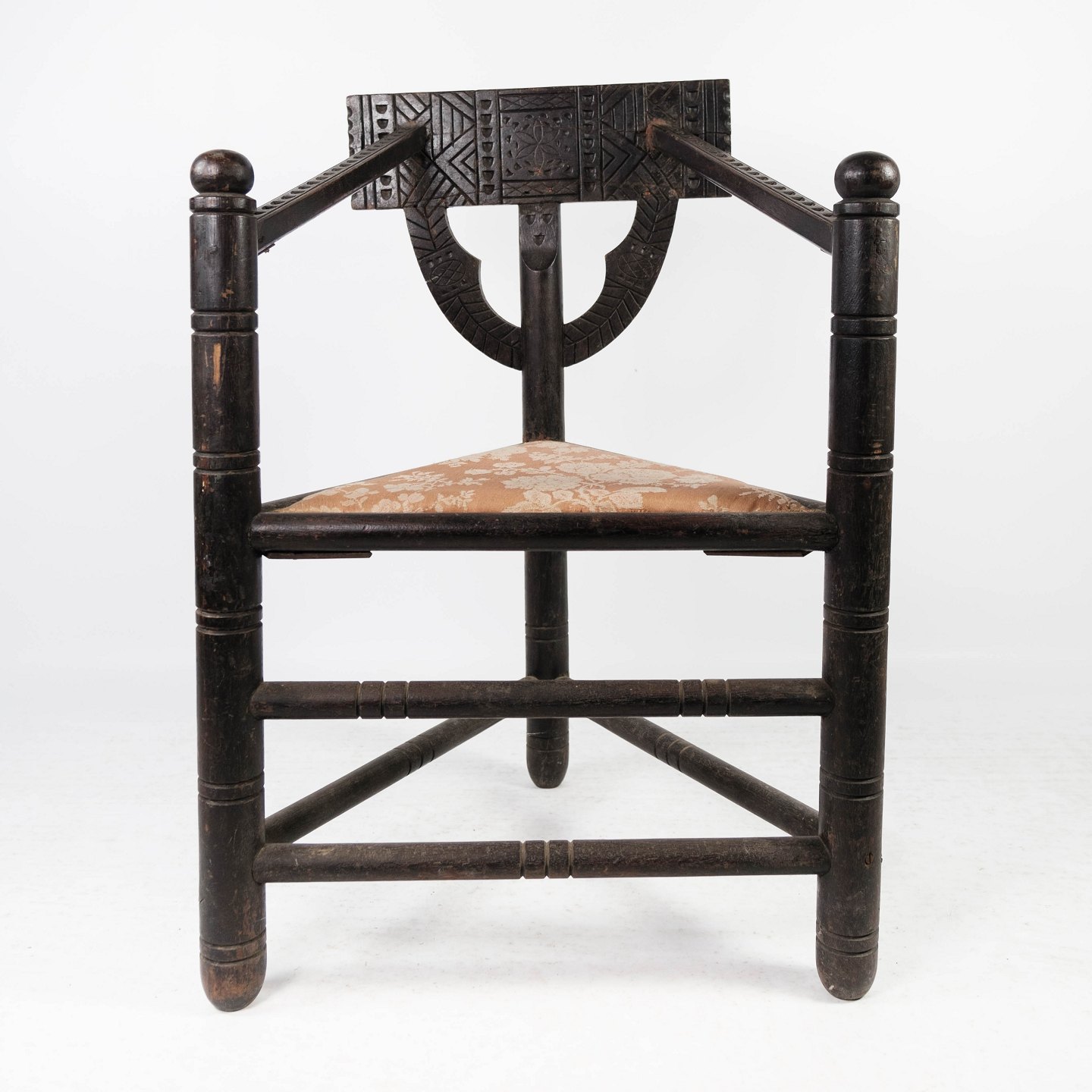 Armstol af mørkt træ med udskæringer og polstret med lyst stof, i flot antik stand fra 1880.