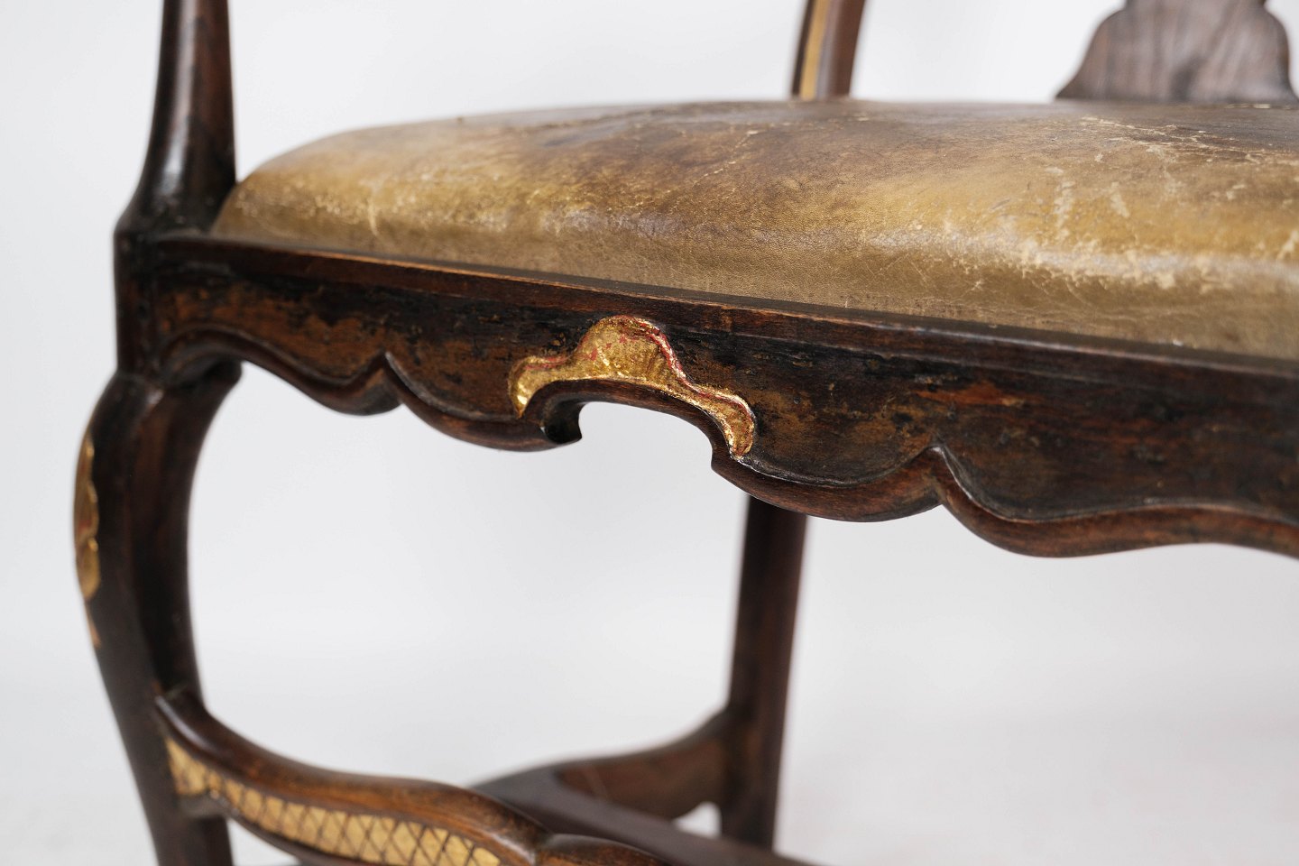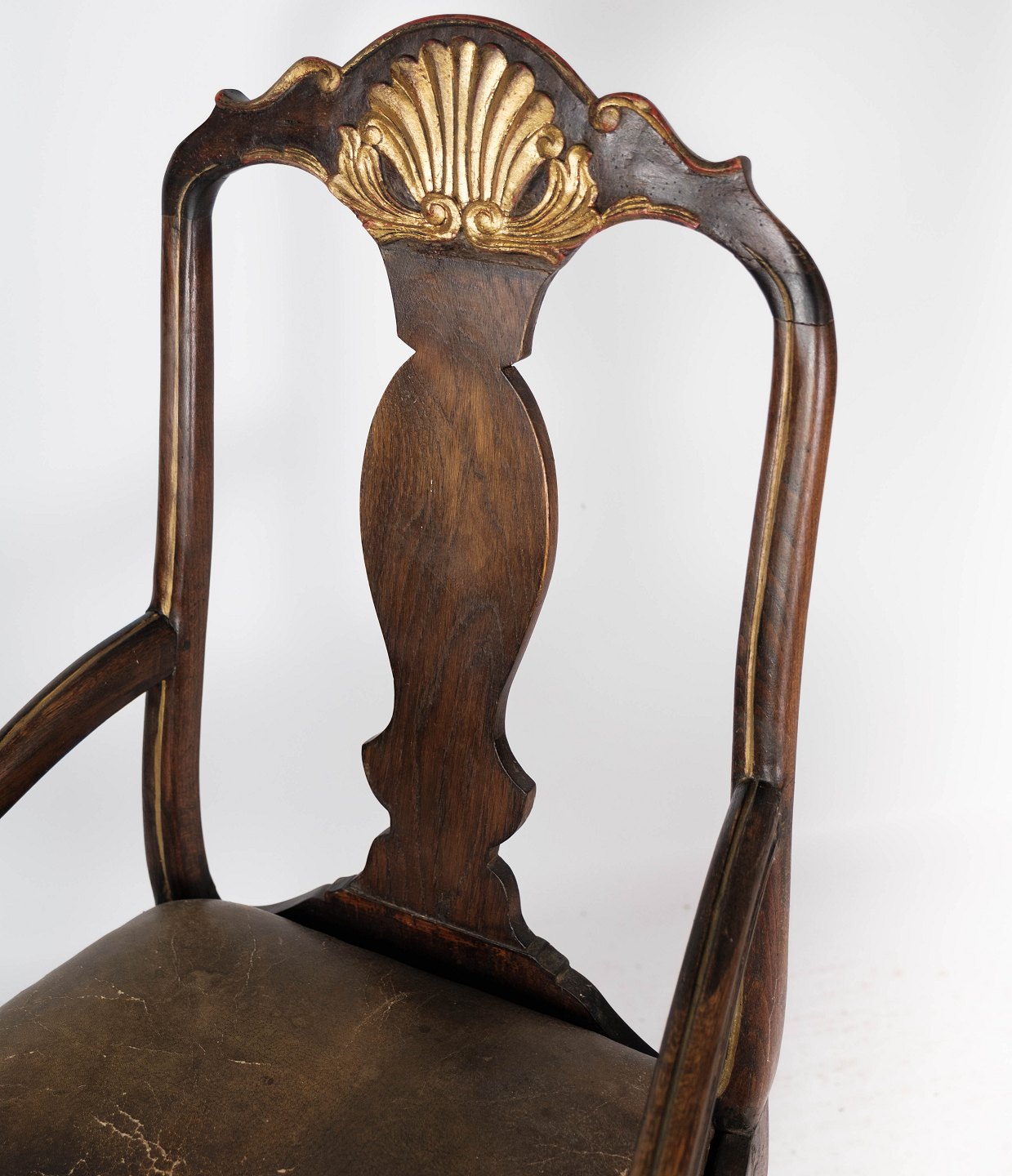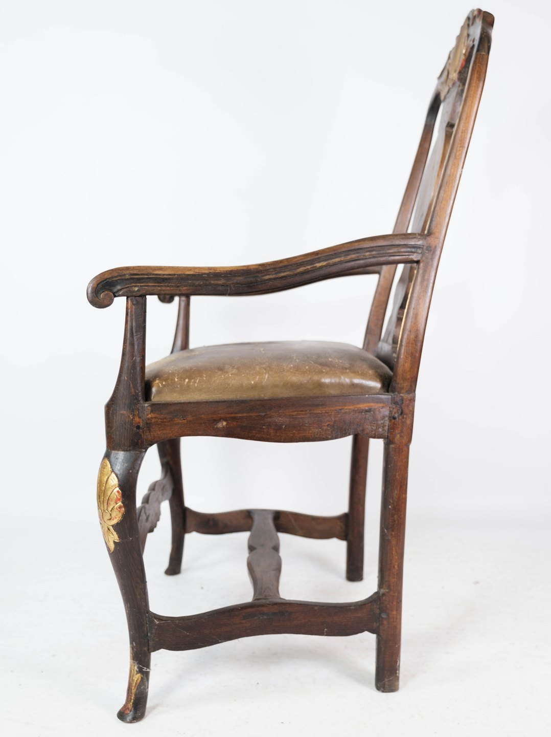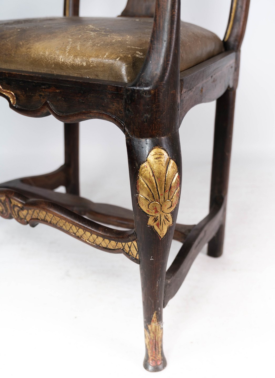 SolgtBarok armstol af mørkt træ dekoreret med guldblad og polstret med mørkt læder fra 1860. Stolen er i flot antik stand.