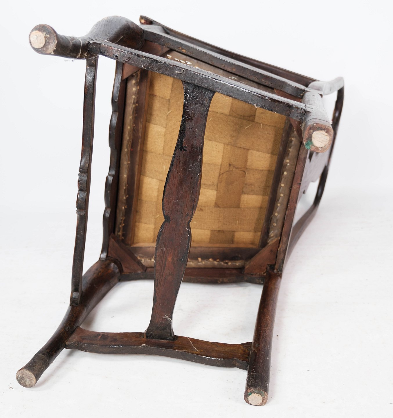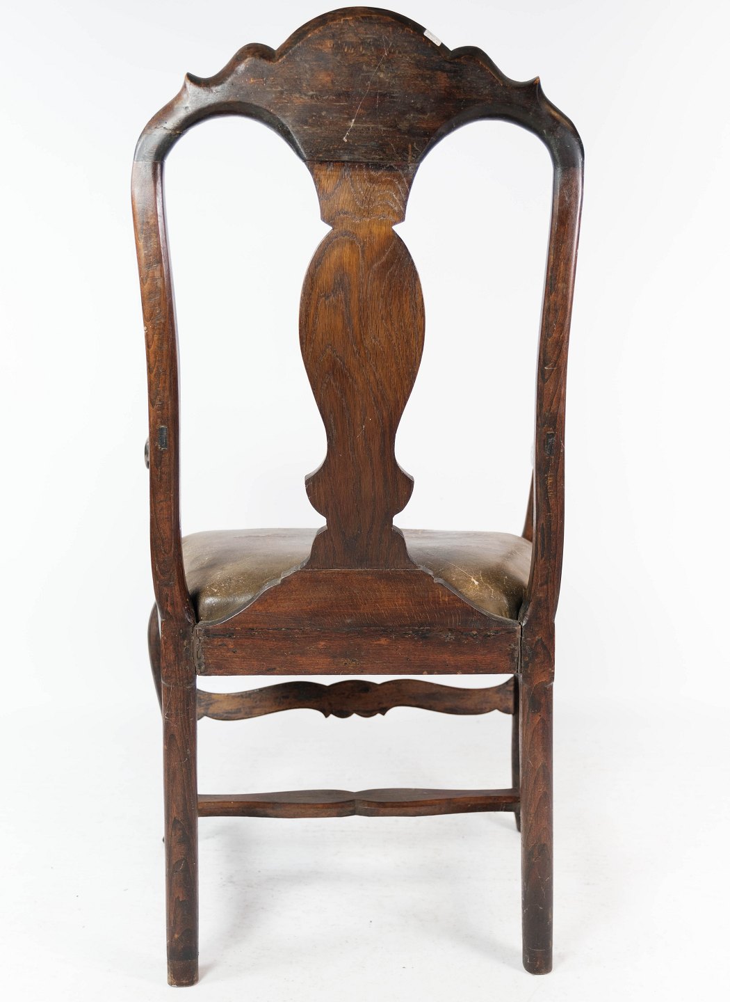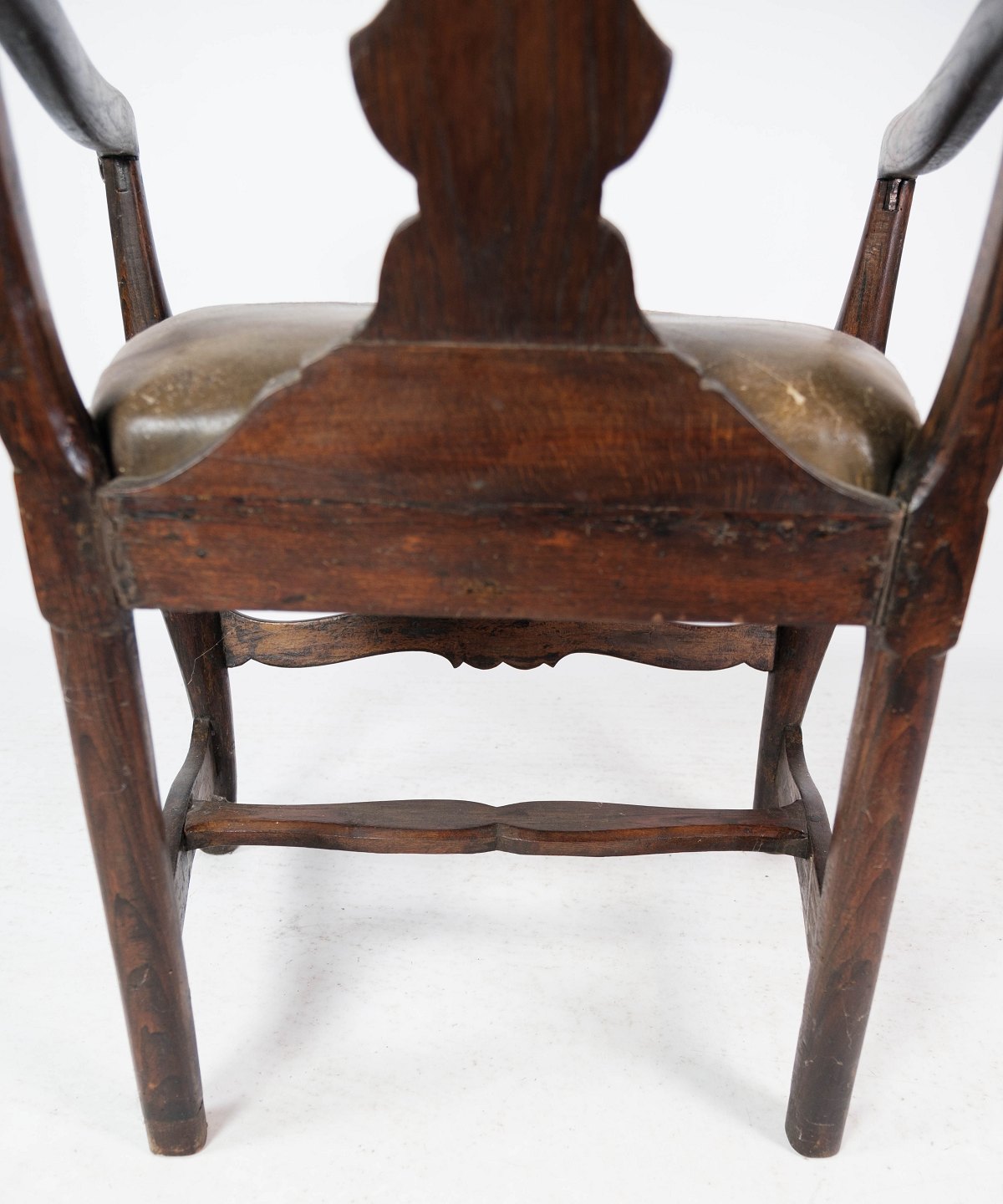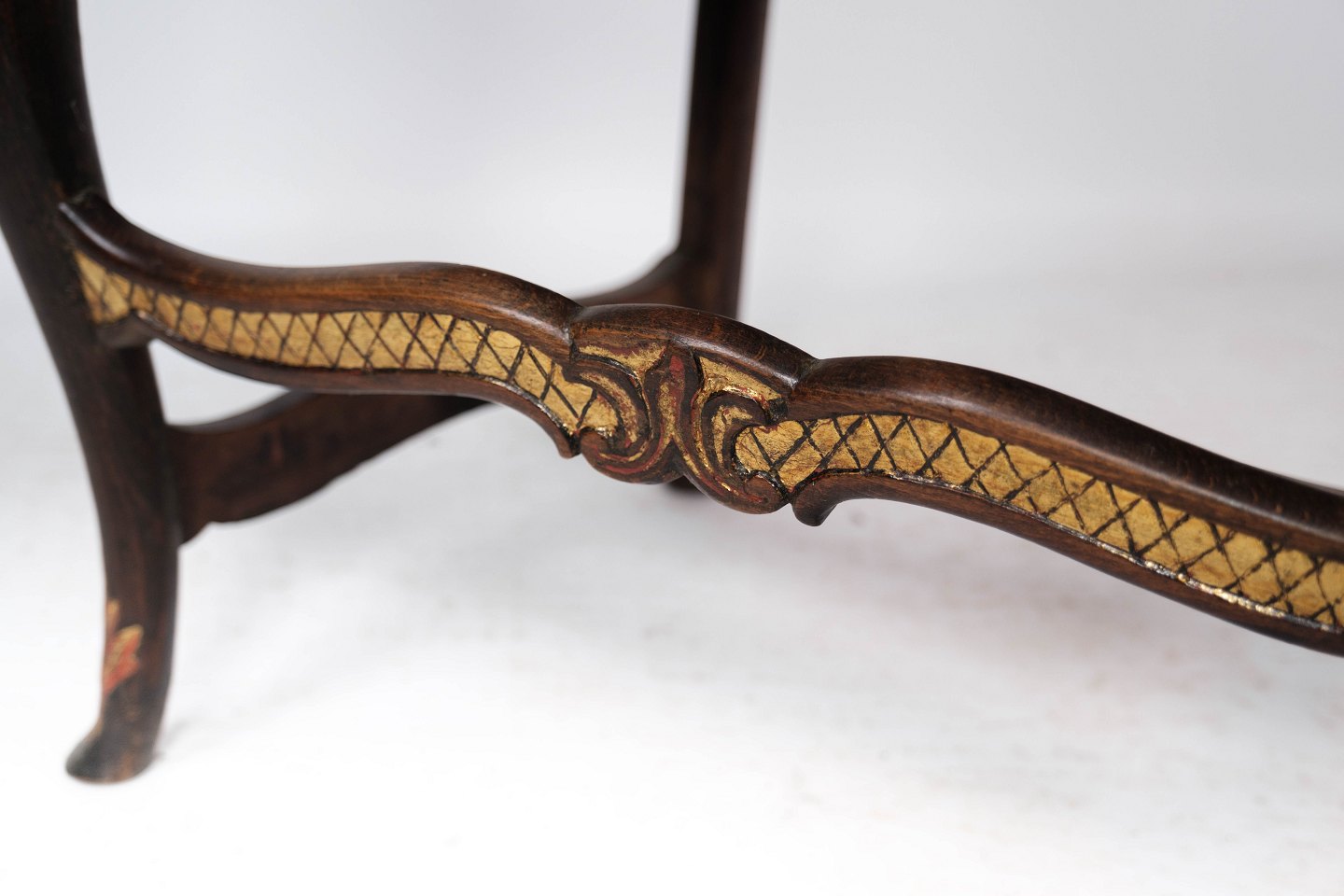 SolgtBarok armstol af mørkt træ dekoreret med guldblad og polstret med mørkt læder fra 1860. Stolen er i flot antik stand.