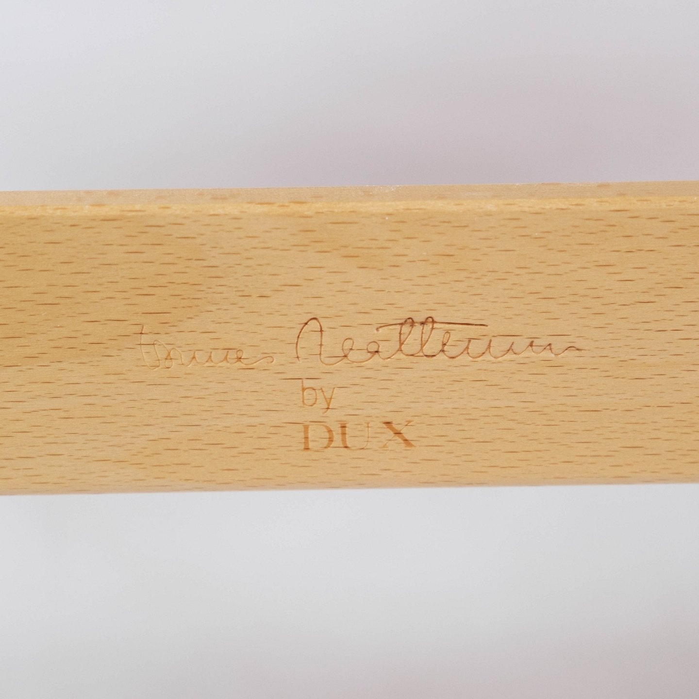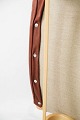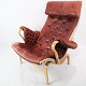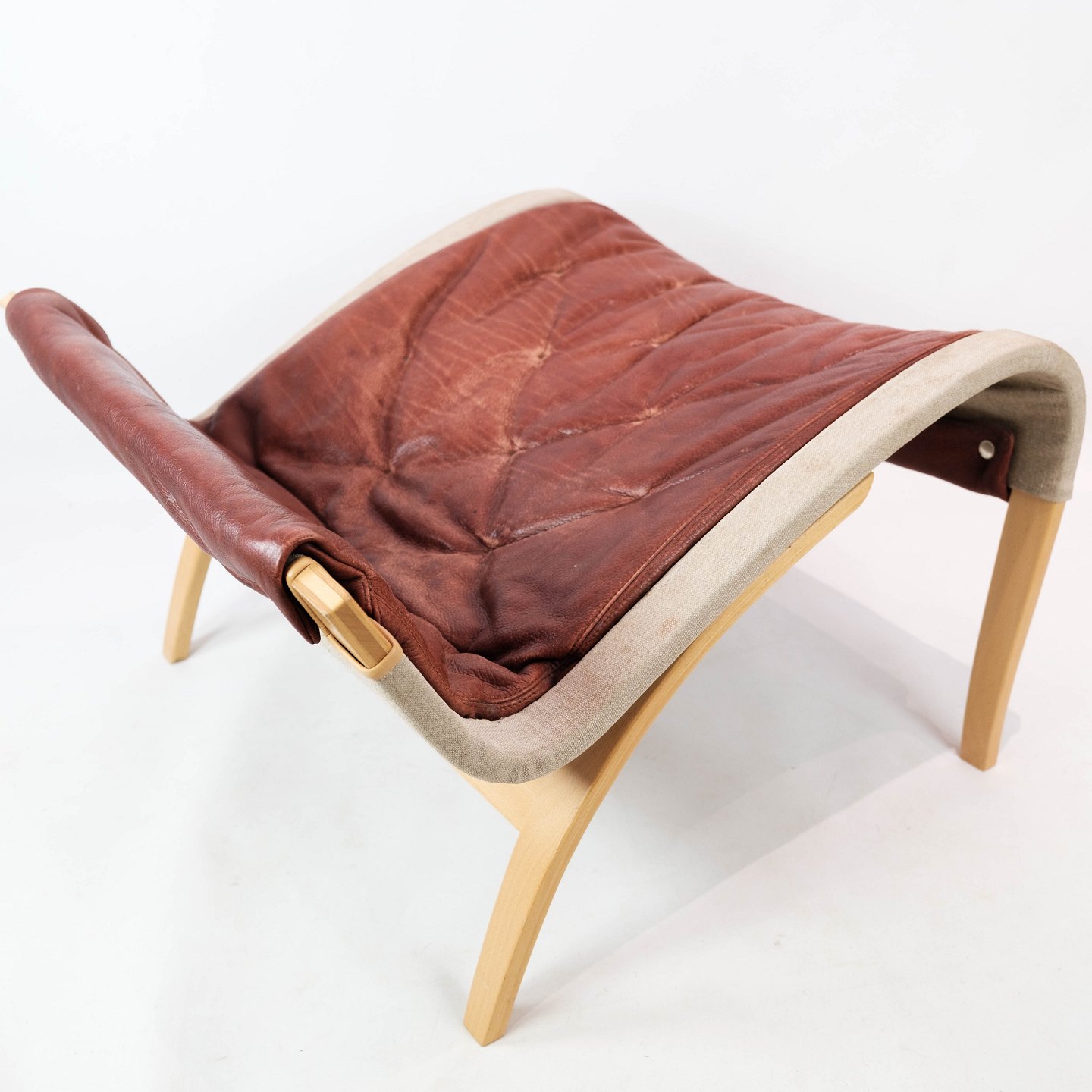 Pernilla easy chair with stool of beech and upholstered with red leather designed by Bruno Mathsson and manufactured by Dux in the 1970s.