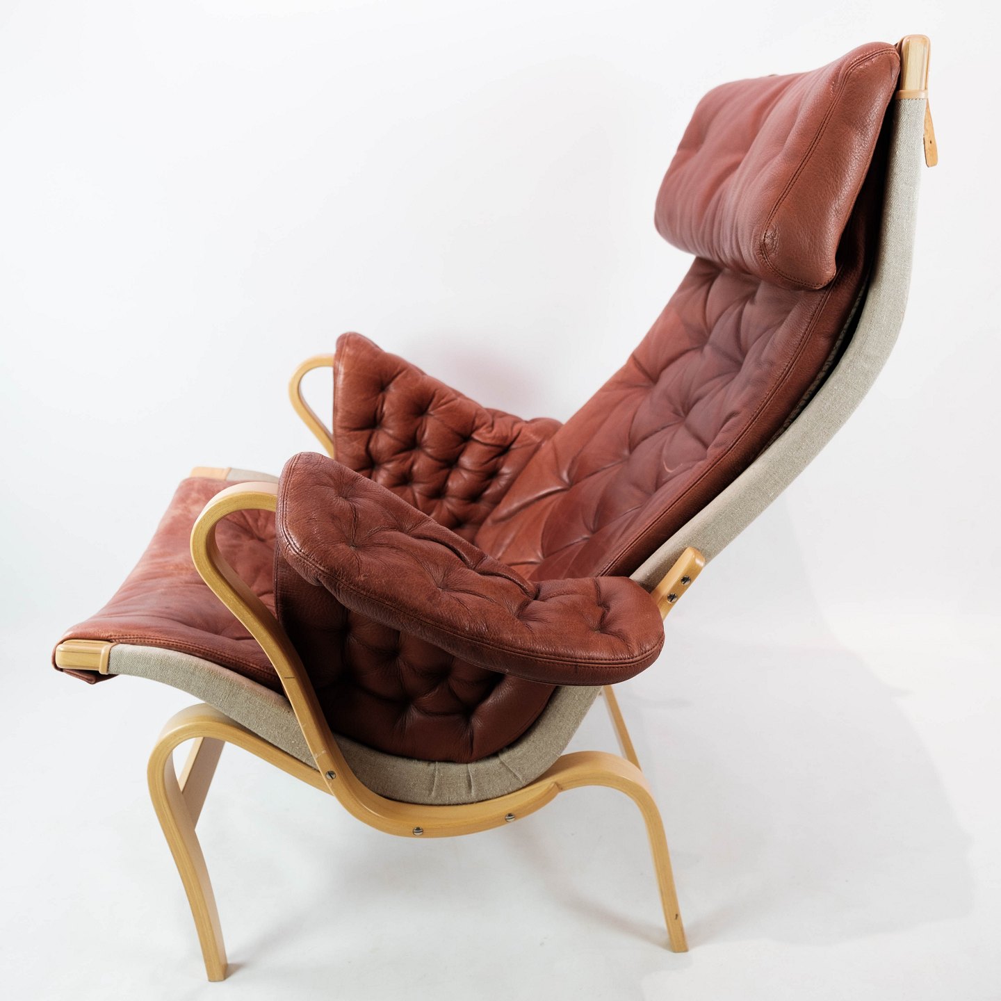 Pernilla easy chair with stool of beech and upholstered with red leather designed by Bruno Mathsson and manufactured by Dux in the 1970s. The chair is in great vintage condition.