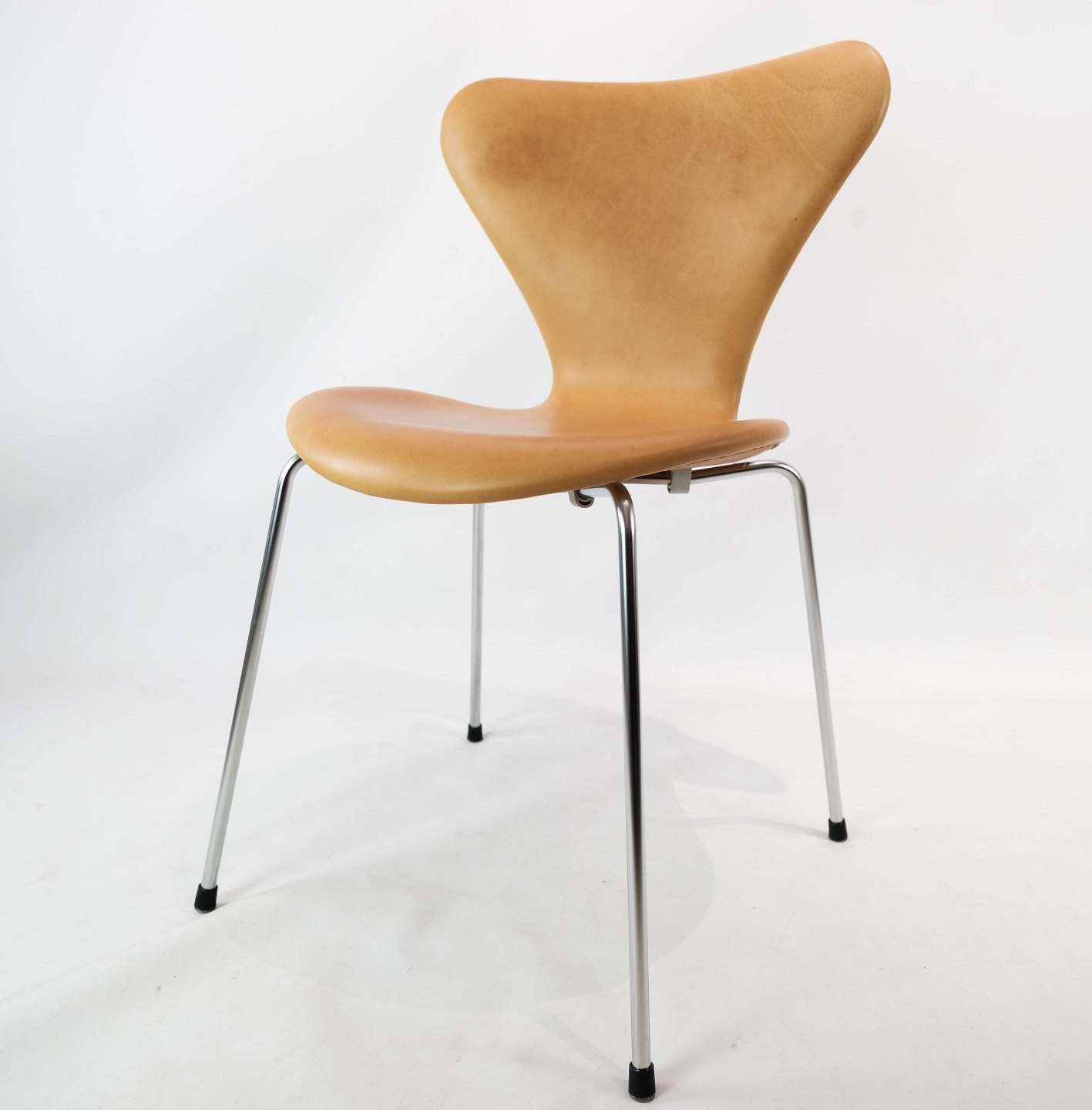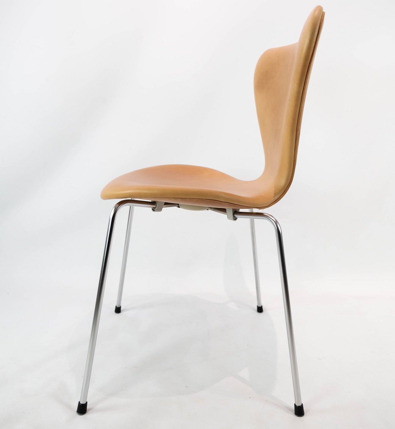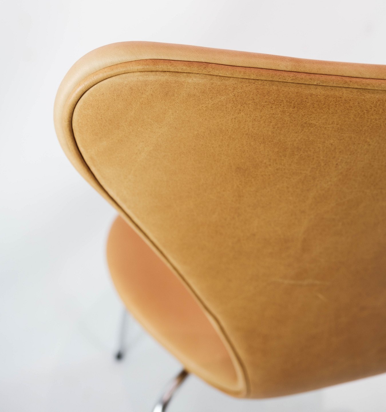 This set of four Seven chairs, also known as Model 3107, is an example of Danish design by Arne Jacobsen and manufactured by Fritz Hansen. The chairs are upholstered in patinated cognac leather, which adds a warm and welcoming atmosphere to any room.