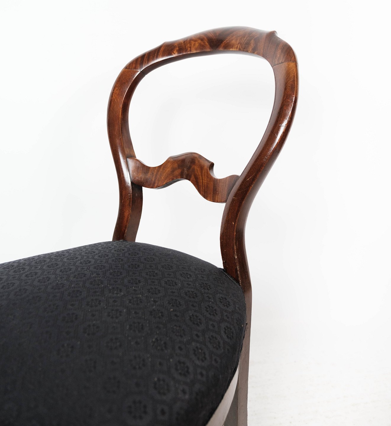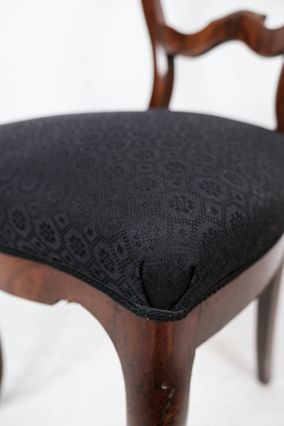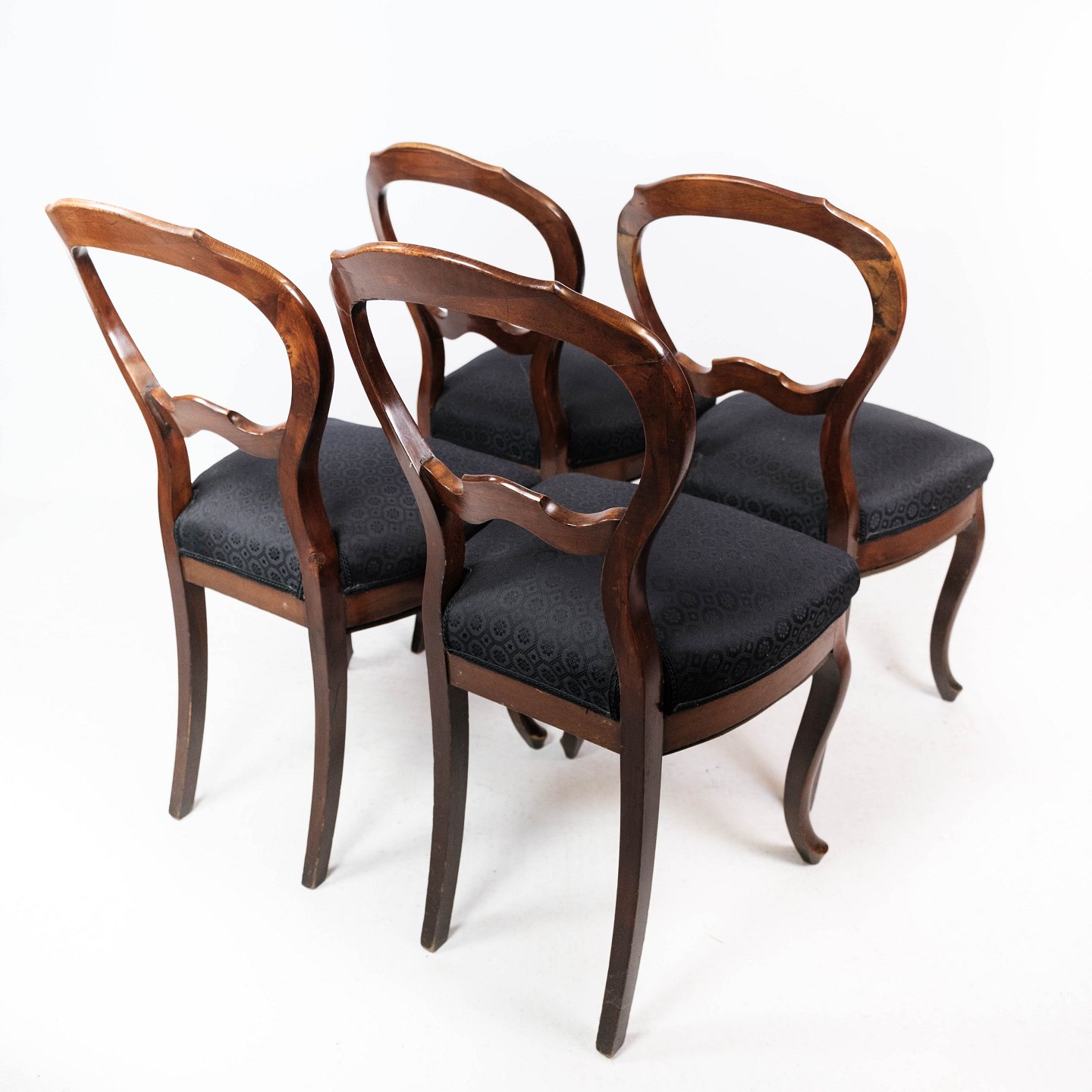 SolgtSæt af fire rokoko spisestuestole af mørkt træ og polstret med sort stof fra omkring 1880. Stolene er i flot antik stand.