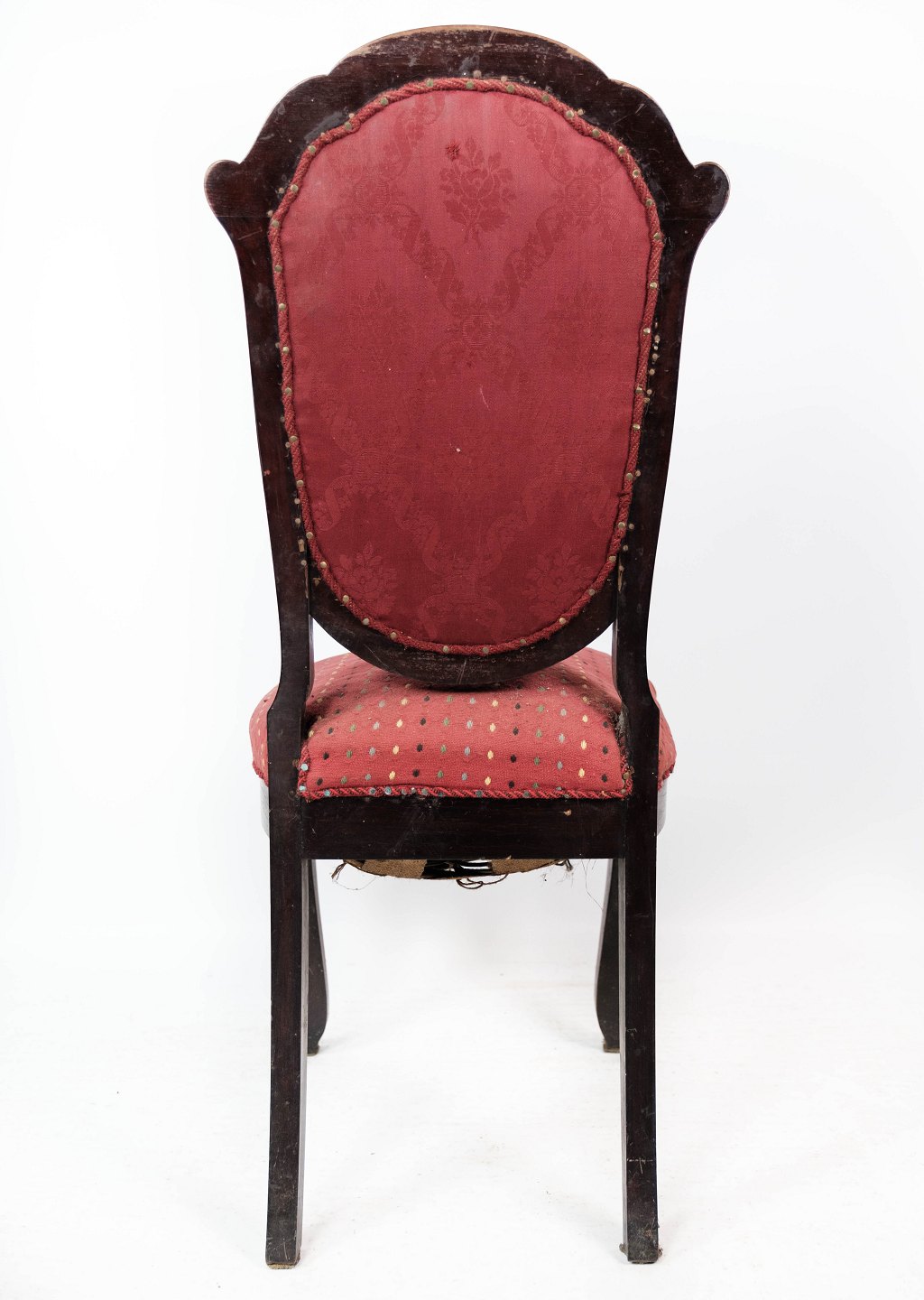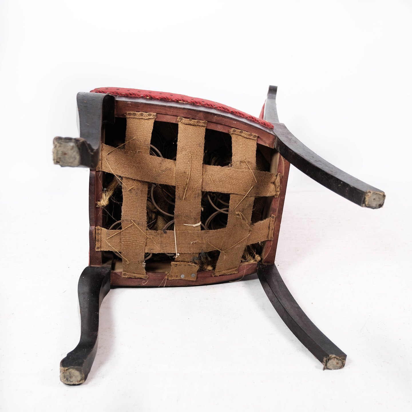 Set of three dining room chairs of mahogany and upholstered with red fabric from around 1920. The chairs are in great vintage condition.