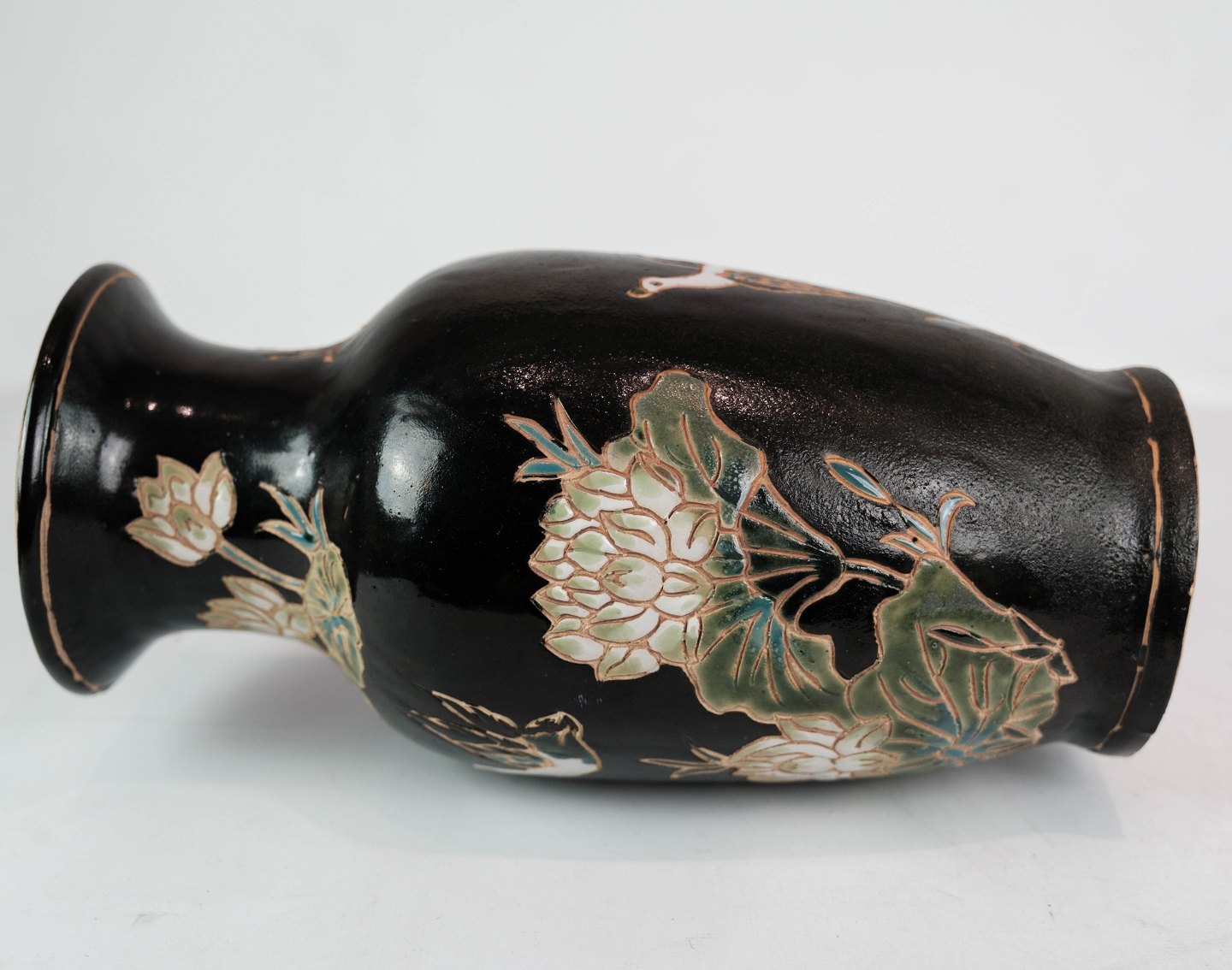 Keramik vase med sort glasur og dekoreret med blomster og fugle. Vasen er i flot brugt stand.