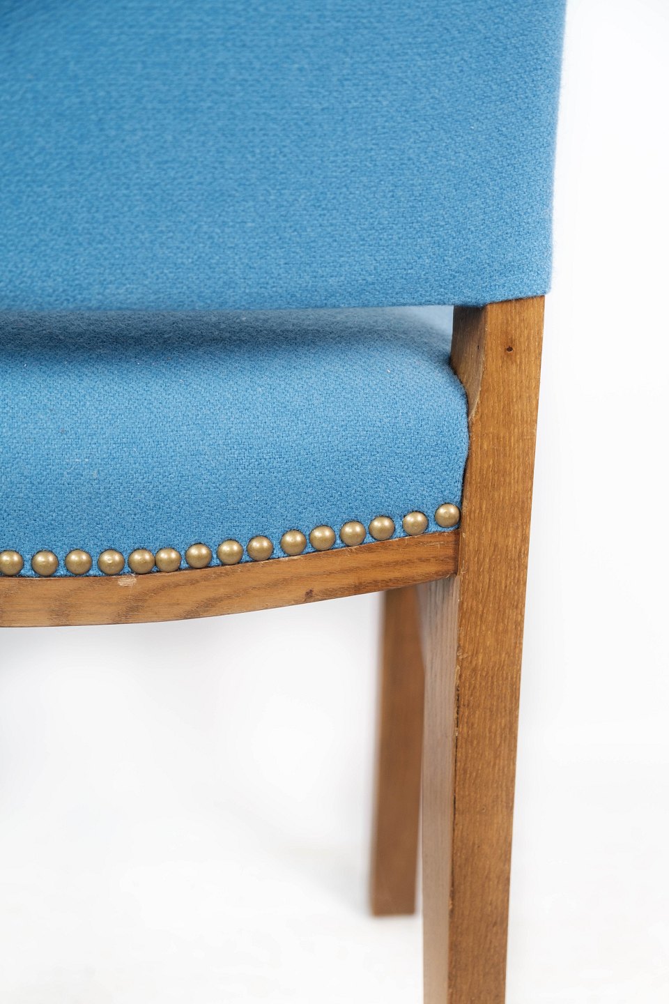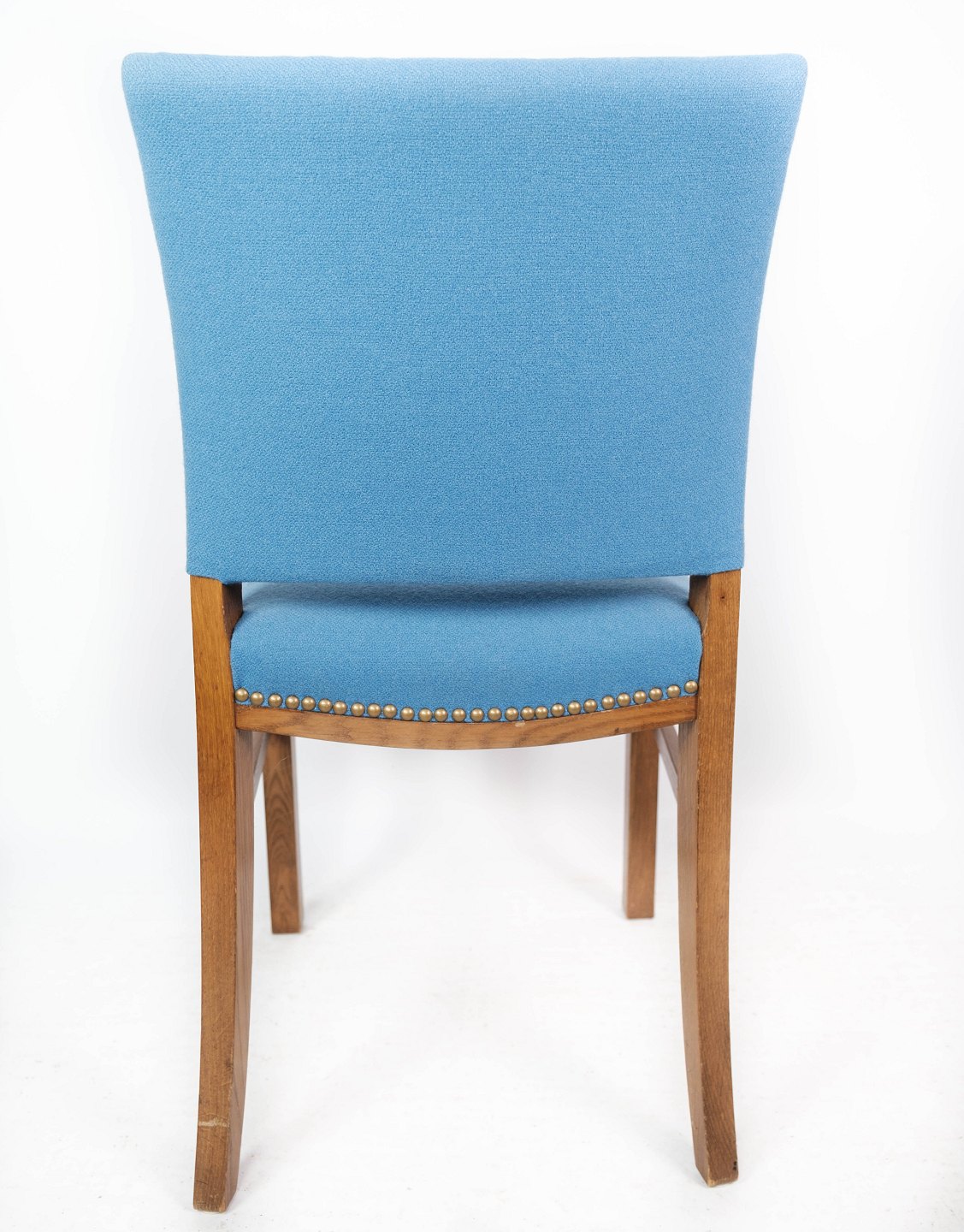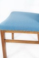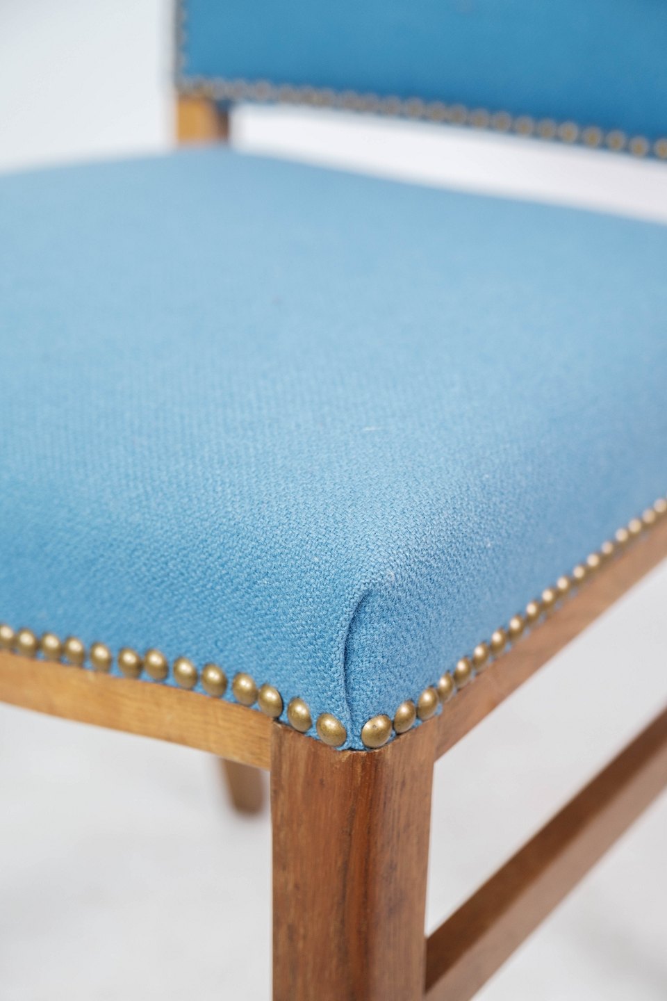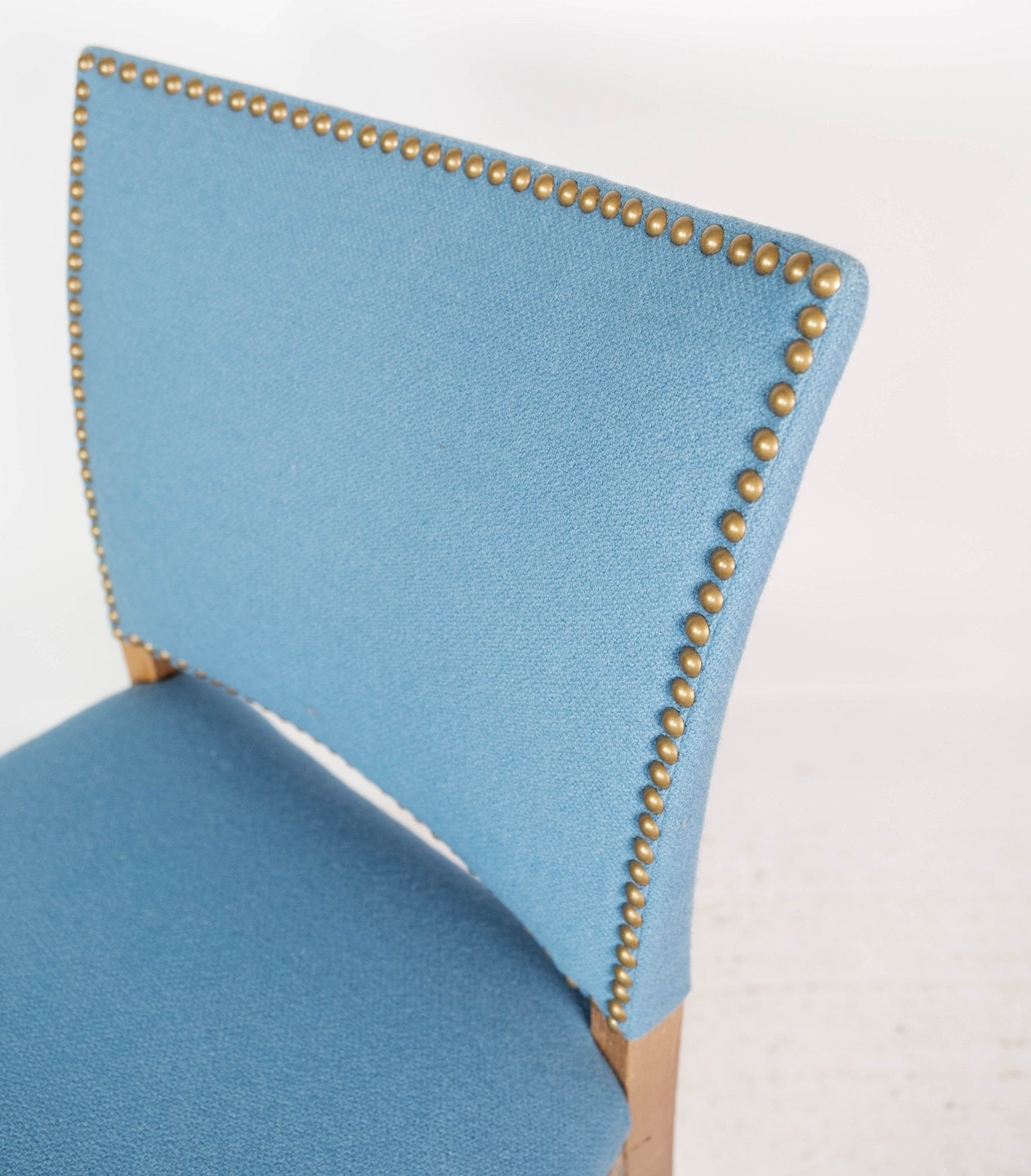 Dining room chair with legs of light mahogany and upholstered with light blue fabric of Danish design from the 1940s.