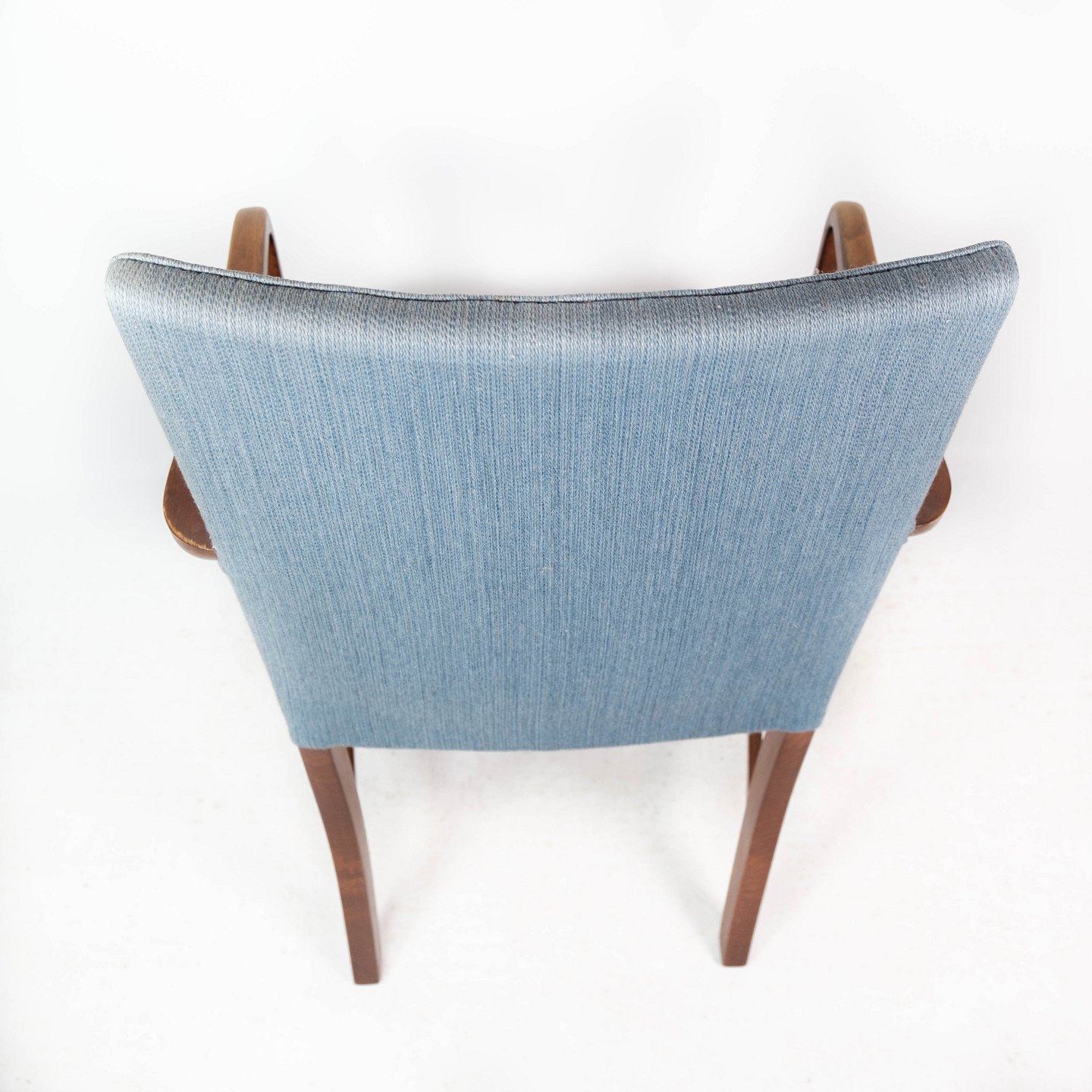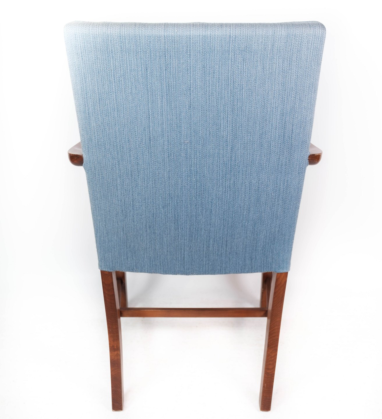 Armchair in mahogany and upholstered with light blue fabric by Fritz Hansen. The chair is in great vintage condition.