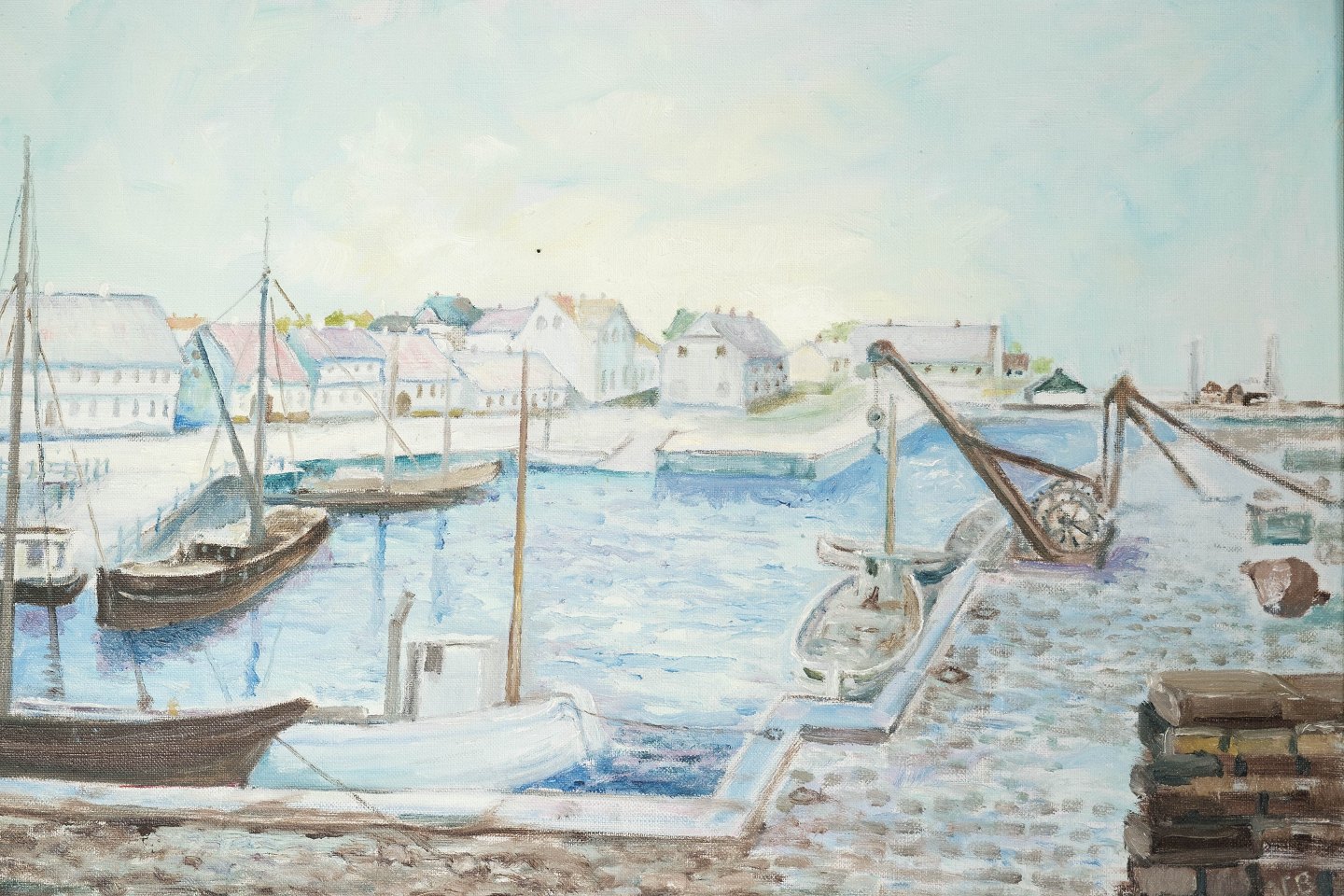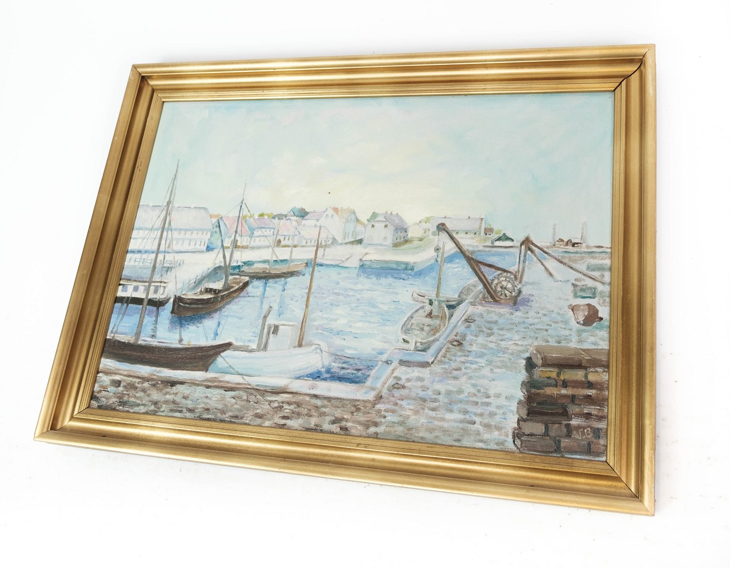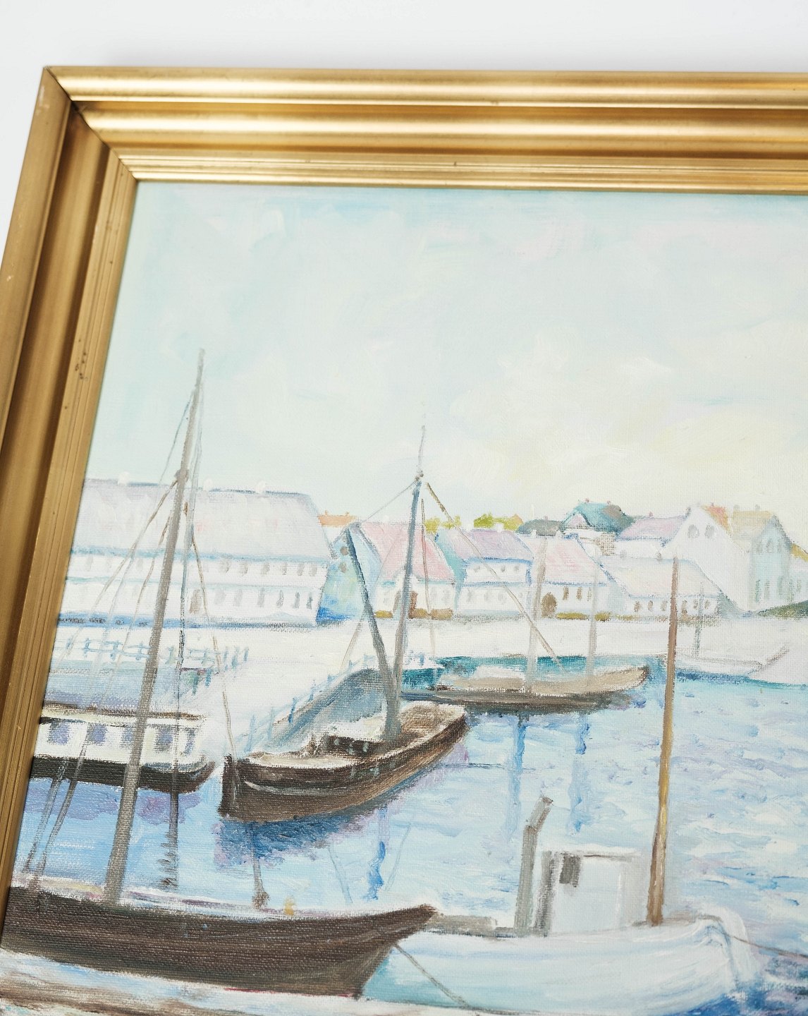 Maleri på lærred med havne motiv og forgyldt ramme, signeret V.B. fra 1940erne.