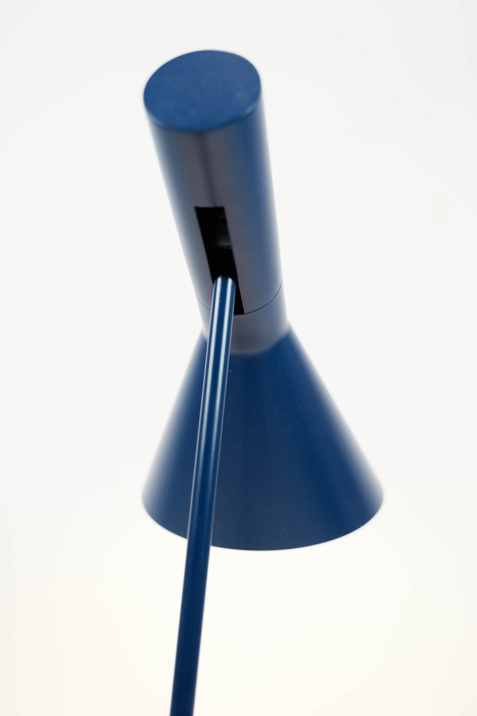 SolgtMørkeblå bordlampe designet af Arne Jacobsen og fremstillet af Louis Poulsen. Lampen blev originalt tegnet til SAS Royal Hotel i København i 1957 til hotellets designkoncept. Lampen her er den originale af stål med vipbart hoved, som udsender et direkte og retningsbestemt lys. Den er lakeret hvid på indersiden, samt blå udvendig. Lampen er i flot brugt stand.