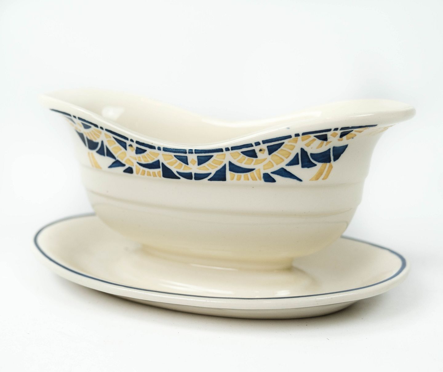 Sauce boat decorated with blue and yellow colours from the 1960s.