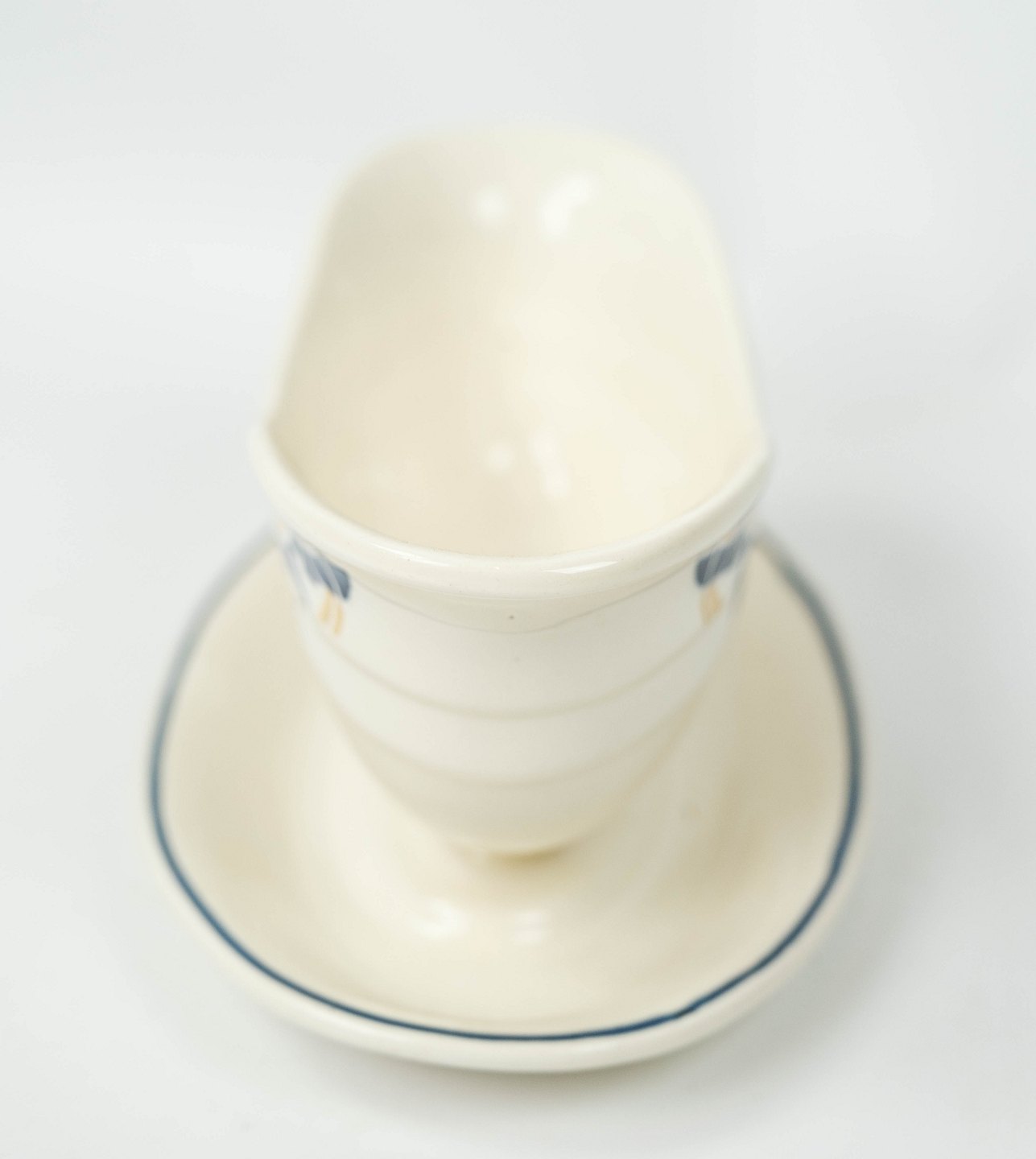 Sauce boat decorated with blue and yellow colours from the 1960s. We have 2 in stock.