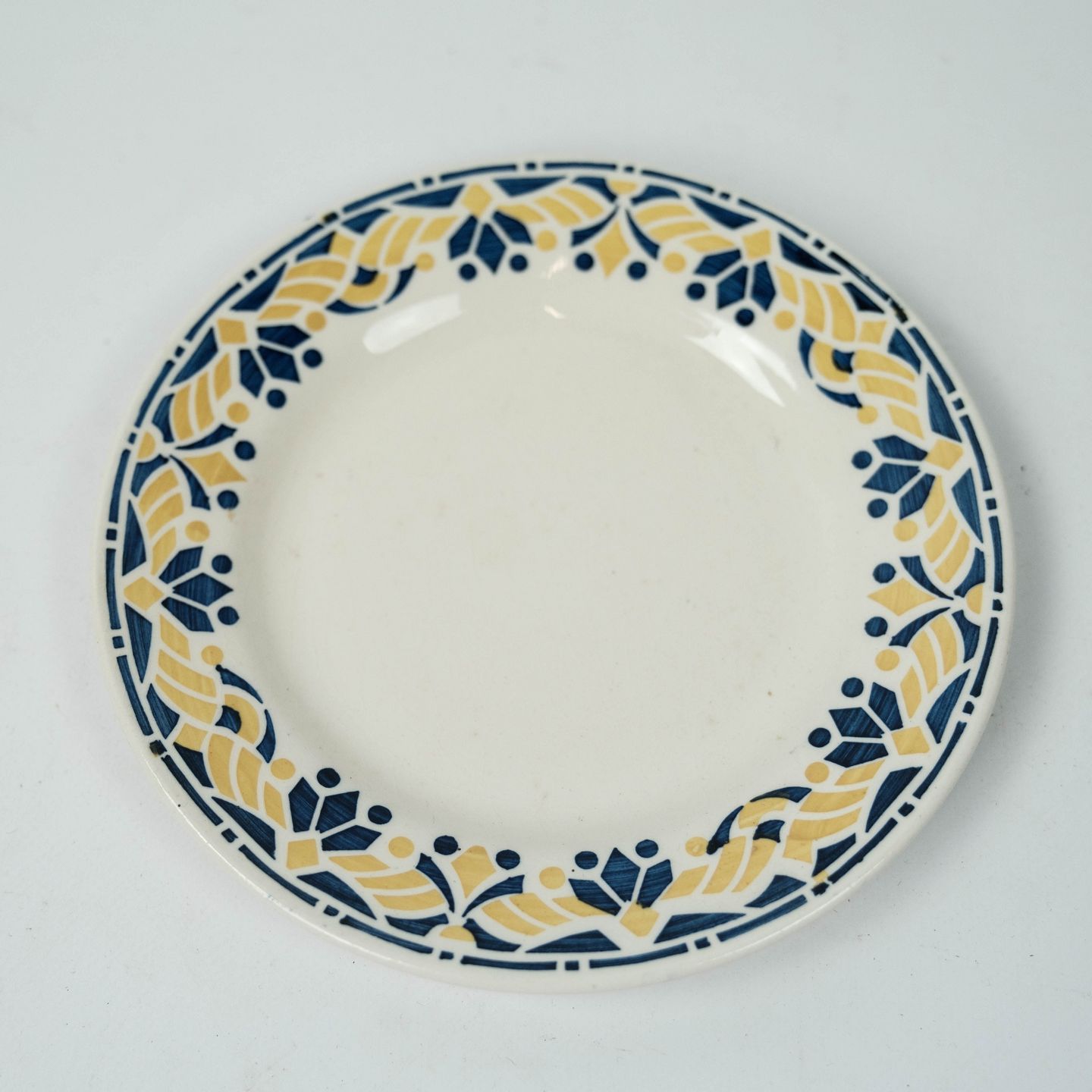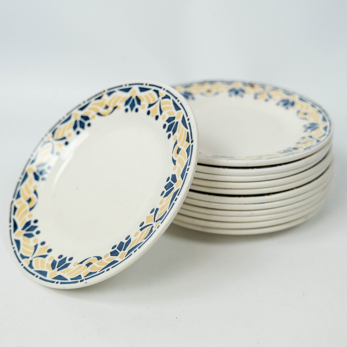 Frokosttallerken dekoreret med gul og blå farver fra 1960erne. Vi har 12 stk. på lager.